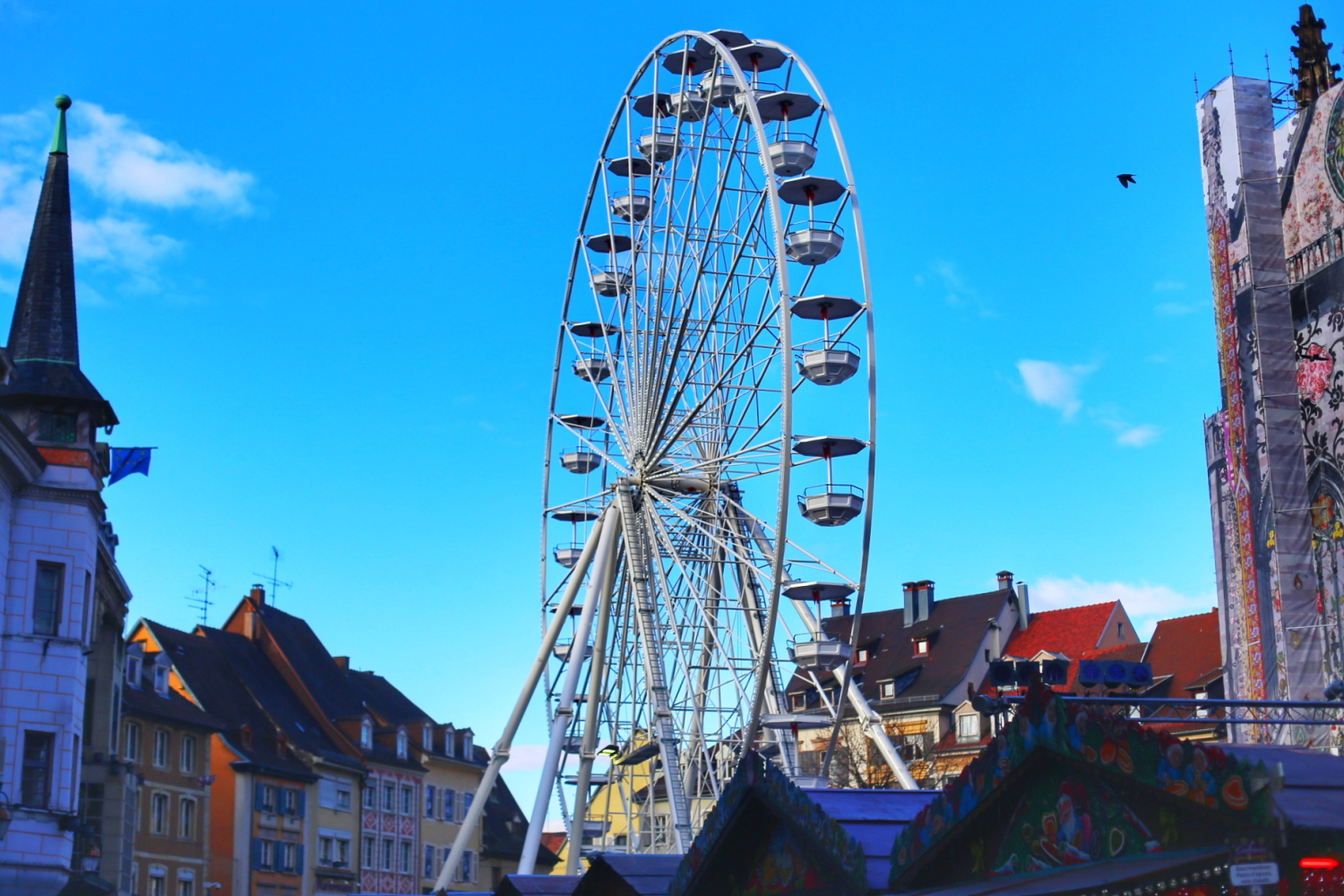 EN: To be honest, Colmar is by far the most beautiful Christmas market we’ve ever seen so far! And some might say that Eguisheim, a nearby village, is even better, on the same loveliness-pattern, with the same timbered buildings and the same colorful decorations during wintertime. Buuuuut, if we were to honestly say which of all the Alsace’s Christmas markets we enjoyed the most, oh well, we would say Mulhouse. Tiny and saucy, cosy and fancy and perfectly dressed-up each year with a new “coat”. Well yes, because Mulhouse is the Textile and Fabric Nirvana in Alsace and it was just impossible not to have a different start-fabric to cover the entire city. From the wooden huts in the Christmas Market to the cathedral in Place de la Reunion, from the glasses of “vin chaud” to the table cloths at the restaurants. everywhere the same pattern and the same fabric. A Paradise for each textile obsessed person! Ah, and by the way, the Mulhouse Christmas market is supposedly renowned as being the most colorful and cheerful one in the whole Alsace! And on top of that, there’s a huge wheel in the center of the wooden huts, so that the fairy-tale atmosphere to be even more obvious. So yes, we’re giving the cute Colmar for a short visit in Mulhouse, a glass of mulled wine and a buckled tart, oh yeeees, a tarte flambee with cheese and mushrooms!