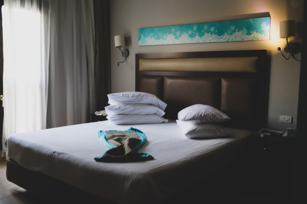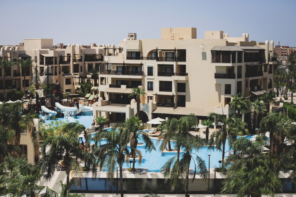 RO: Inainte de a incepe as vrea sa spun si faptul ca in momentul in care am anuntat in social media ca vom merge la acest hotel, am primit o avalansa de mesaje de la persoane care au fost deja in vacante aici (este un hotel foarte popular printre romani, e foarte cunoscut si apreciat, de regula in topul preferintelor). Multe dintre ele erau recenzii foarte pozitive, insa au fost si cateva care ne-au ingrijorat destul de mult, indeosebi legat de camere sau de curatenie. Camera noastra a fost o camera mare, spatioasa, baia la fel. Nu era o camera luxoasa (cum am tinde sa ne asteptam atunci cand ne gandim la un hotel de 5 stele) dar era o camera mare, ceea ce aveam noi nevoie de fapt. Intr-adevar mobila ar avea nevoie de un upgrade si poate ca ar fi binevenite niste imbunatatiri pe ici pe colo (tocurile usilor tocite sau sinele draperiilor defecte) insa in general am fost multumiti de camera. Cat despre curatenie, este clar ca standardele europene de curatenie nu se aliniaza cu cele egiptene, este si o componenta culturala pana la urma. Chiar si cand am primit camera (deci cand era proaspat curatata) am vazut ca pernele decorative de pe pat erau murdare, patate, iar pe parcursul saptamanii petrecute aici am observat ca si curatenia de zi cu zi era mai… superficiala pentru preferintele noastre. Acelasi lucru l-am primit ca feedback si de la alti romani cu care ne-am intalnit prin resort, care ne-au sfatuit sa raportam orice problema la receptie, unui manager, pentru ca se solutioneaza. Si intr-adevar, asa este, sunt foarte prompti in rezolvarea oricarei probleme, atata doar ca reactioneaza reactiv 🙂 Noi am stat in cladirea principala (cea unde se afla si receptia), la etajul 3 (am avut camera 2314), cu vedere inspre piscina de copii (cea cu barca de pirati). In mod normal am spune ca am fi preferat o pozitionare mai linistita daaaar privelistea de pe balcon era distractia suprema pentru Alexei (ii era teama sa se dea in distractiile de la piscina de copii dar ii placea la nebunie sa ii priveasca pe alti copii cum se jucau). Iar faptul ca ne aflam la etajul 3 (deci mai sus) ne-a permis sa vedem niste apusuri absolut geniale! Si in plus in unele zile se vedeau minunat muntii. Iar aeroportul fiind atat de aproape, zi de zi urmaream avioanele la aterizare (deci spre bucuria lui Andrei am reusit sa facem si putin spotting de pe coridor :D).