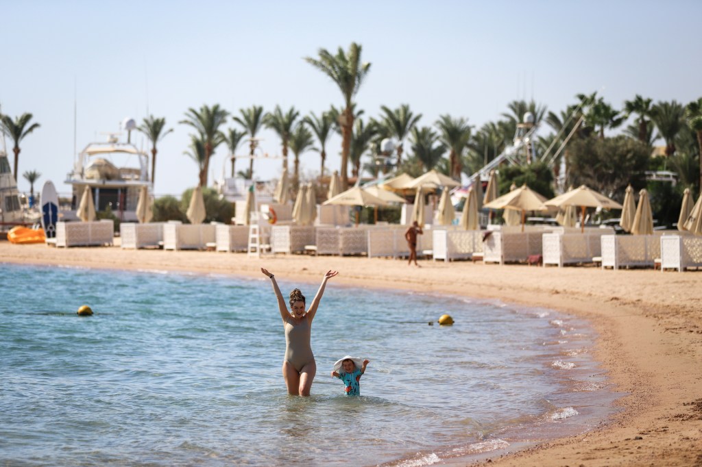 EN: The hotel also has a private beach, but it is not directly on the beach. It’s not too far from it either. To get to the beach, guests have to go out of the Steigenberger AquaMagic resort, cross the street, go into the Steigenberger Aldau resort and then either walk through the resort to the beach (5-7 minutes walking) or take a golf car that take them to the beach. In theory, it is very close to the beach, but in practice it seems a bit far away (at least for us) because there is no shade and the walk is through the heat and if we had all sort of luggage with us (and of course we had :D) it was a bit difficult. But the beach is really nice, there are sun beds with big umbrellas and shields for intimacy (both of them kept good shade during the day), there is a towel rack on the beach (so there is no need to bring them from the hotel) and a bar (where the drinks are included, as well as a light lunch with sandwiches and pizza from 12 to 5). The water is not too deep and it deepens slowly, it is perfect for families with children and the beach is sandy, not rocky. It is not the finest sand in the world, but it is sand, perfect for playing. The beach gets a bit crowded after 10AM, we were always going to the beach before 9AM (around 8:30) and we always found sun beds in the first row. The sun is scorching from the first hour so we used plenty of SPF50 sun creams, for us and also for Alexei. We kept Anastasia away from the sun completely so we didn’t use sun cream for her (we were dressing her in long silk blouses, really light ones, and kept her in the stroller, with the sun blind and the stroller umbrella opened).