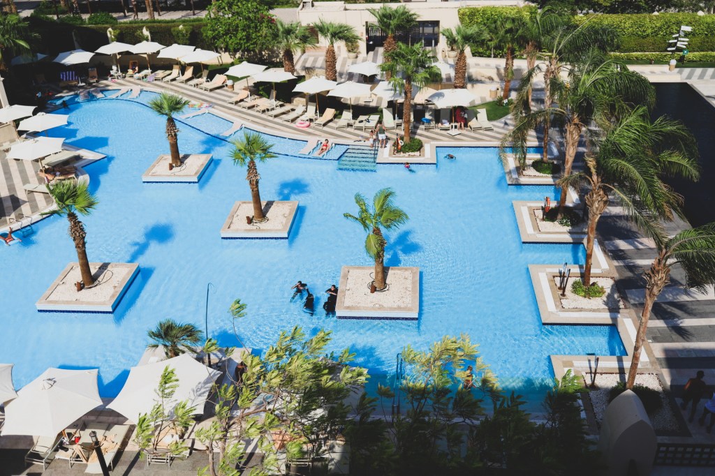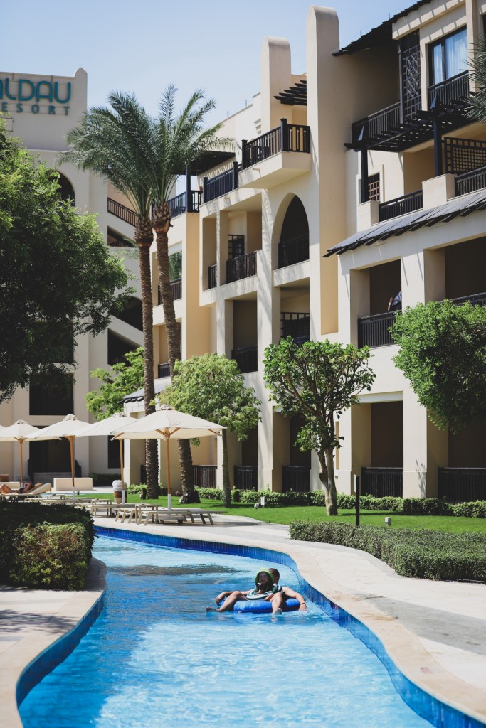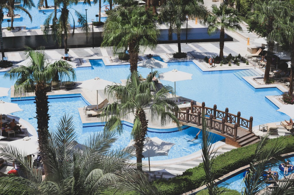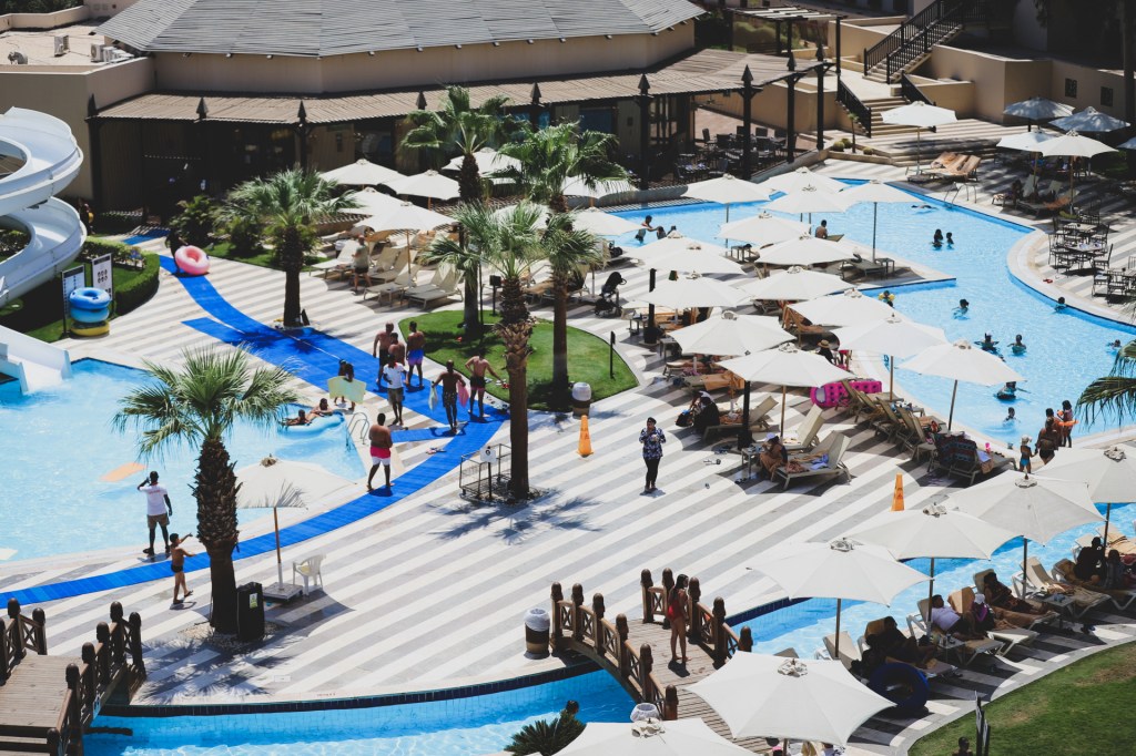 RO: Cat despre facilitati… nici nu stim cu ce sa incepem mai intai 🙂 Au mai multe piscine, peste tot prin resort, inclusiv piscina pentru copii nu foarte adanca (40cm doar, cea cu barca de pirati) sau piscina doar pentru adulti (la ultimul etaj al uneia dintre cladiri, cu priveliste minunata catre tot resortul si catre mare), un Aqua Park cu tobogane (nu ne-am incumetat sa le incercam :D) sau un rau (Lazy River) care inconjoara resortul. Fiecare piscina are bar unde bauturile locale sunt incluse in pachetul all inclusive (mai putin cele de import cum ar fi vinurile internationale sau berea Heineken – au o obsesie pentru berea Heineken din cate am observat :D). Apa imbuteliata este peste tot, nu ne-a lipsit niciun moment. Nu exista foarte multe locuri cu umbra, sunt doar cateva sub niste copaci (pe care am incercat sa le prindem in fiecare zi in care am stat la piscina, ca sa putem sa evitam soarele puternic). Insa dupa ora 4 soarele se duce dupa hotel si intreaga incinta este umbrita (pentru noi era perfect pentru ca ieseam la plaja doar dimineata si dupa amiaza dupa somnul copiilor). In a doua parte a zilei prindeam cam doua ore de lumina (soarele apunea pe la 6-6:30).