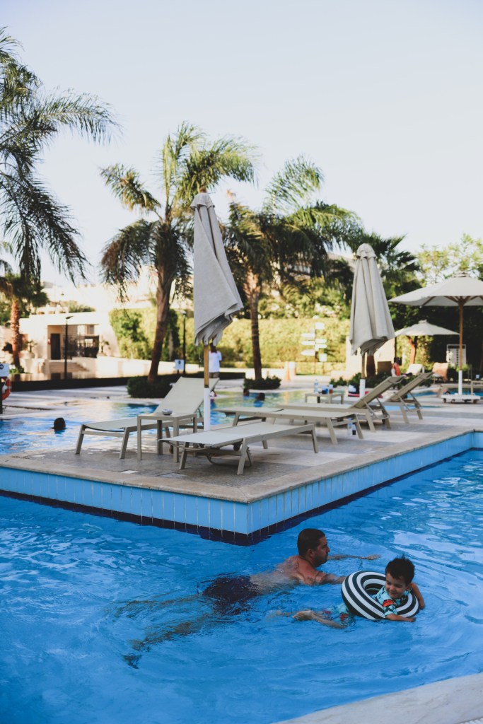 EN: August is not precisely the best time to travel to Egypt, the temperatures are very high and for a family with small children can be quite unpleasant. But if there aren’t plans of traveling too much or going in faraway excursions it can be an option as the prices are lower and the resorts are less crowded. In our case, we were extremely lucky to have great weather. In the morning when we were going to the beach (8AM) there were around 28 degrees and around 11-11:30 when we were heading to the hotel there were already 40 degrees. At noon, when it was the hottest, we were staying in the room for our children’s nap (and sometimes ours :D) and in the afternoon we were going out again at the beach around 5PM, when the temperatures were starting to decrease again (sun was going down at 6, 6 and a bit). But every day was windy, especially in the evening, which made the high temperatures easier to bear.