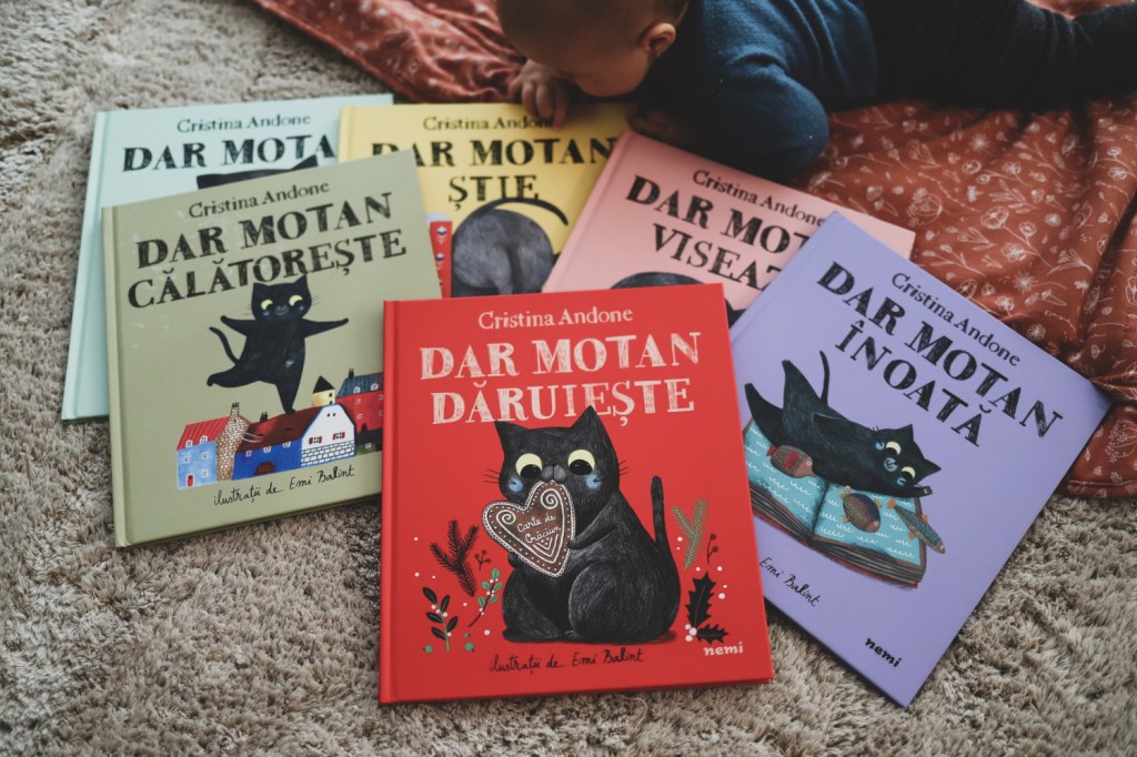Cartile Dar Motan sunt minunate si din fericire nu se opresc la sase volume 🙂 In anul ce urmeaza vor mai fi lansate “Dar Motan zice”, “Dar Motan citeste”, “Dar Motan schiaza” si “Dar Motan sarbatoreste”. Abia asteptam sa le citim (citirim cum spune Alexei)! Sunt niste povesti frumoase, scrise intr-un mod aparte, tare usor de identificat ca fiind al Cristinei (si povestile din seria Povesti din Padurea Muzicala sunt scrise tot de Cristina Andone). Carti scrise din… “nevoia de rasfat si mataiala” cum ne povestea autoarea intr-un live facut acum ceva vreme. Pentru ca da, avem nevoie de pisiceala in viata noastra, avem nevoie sa ne prostim, sa ne miorlaim, miaunim, motanim 🙂