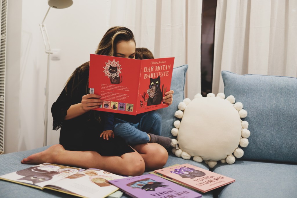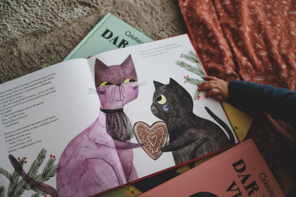 Si incep sa ii citesc doua volume din cele cinci cu Dar Motan pe care le avem (am scapat usor de data aceasta, de obicei le vrea pe toate, pana cand ma ustura gatul de la atata citit). Alege in ordinea preferintelor “Dar Motan Inoata” si “Dar Motan Calatoreste”, pe care am ajuns sa le stiu pe de rost. Ba mai mult chiar, uneori folosim replici din ambele carti, atat eu cat si Andrei. Si mereu glumim ca nu am mai apucat sa citim o carte de adulti (care sa nu fie despre copii, diversificare, somnul bebelusilor sau orice alt aspect legat de parenthood) de cand lumea si pamantul, insa stim pe de rost replici din Dar Motan. Si-apoi scot asul din maneca, pentru ca desi aveam cartea acasa de ceva vreme, intentionam sa o pastrez pentru cadoul de Mos Nicolae. Al saselea volum din colectie, “Dar Motan Daruieste“, lansat special in toamna aceasta pentru a transmite un mesaj frumos inainte de sarbatori: acela de a fi bun si de a darui. Deci acest articol este despre Dar Motan si carti in dar, cum ne spunea si Cristina (autoarea cartilor) despre aceste volume.