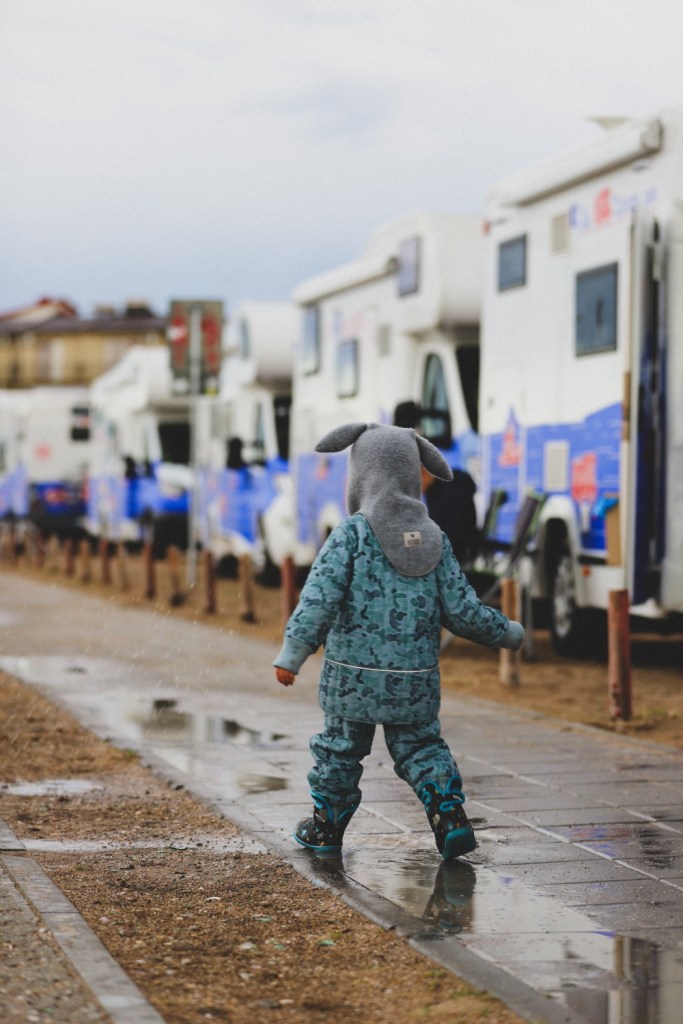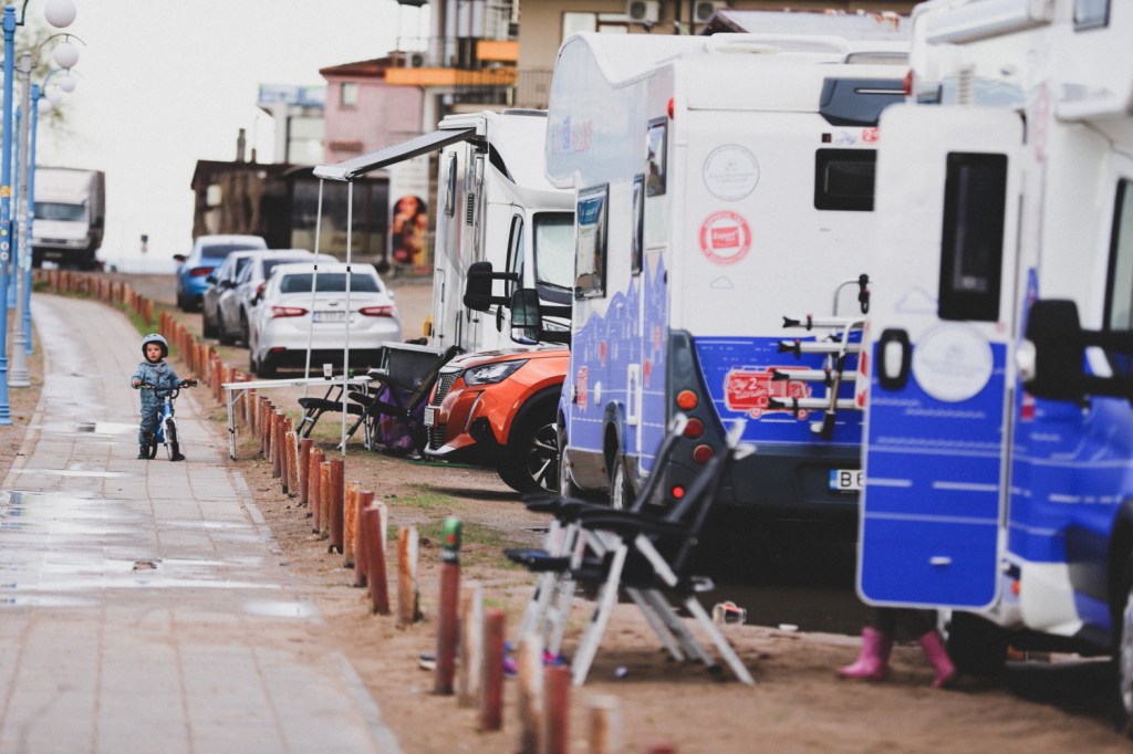 Cat despre traseu. Stiam atata doar, ca mergem la mare. De altfel cu totii stiam acelasi lucru si nici nu aveam nevoie de mai multe informatii 🙂 Ne-am facut planuri mai exacte la fata locului, in mod special in functie de vreme si de… foame 😀 Am plecat din Bucuresti la prima ora, ne-am dat cu totii intalnire la ora 8 la prima parcare de pe autostrada (noi suntem foarte matinali si in general extrem de punctuali, asa ca ne-a bucurat mult aceasta ora de plecare :D). Patru dintre autorulote am plecat dimineata, celelalte trei ni s-au alaturat spre seara. Am mers cu caravana de patru autorulote pana am ajuns aproape de mare, moment in care am decis sa oprim la Agigea, la Golful Pescarilor sau Pescaria lui Matei sa mancam (aveam un grup de Whatsapp in care eram inclusi cu totii si discutam detalii logistice). Am ales Golful Pescarilor pentru ca era un pic mai ferit de vant si ne-am incumetat sa stam afara. Bine, nu ca am fi avut de ales cu o gradinita de copii mici dupa noi, cu siguranta nu am fi rezistat mai mult de 20 de minute la interior 😀 Era un vant de efectiv ne lua pe toti pe sus, insa in golfuletul acela chiar a fost placut. Apoi, ne-am indreptat spre plaja Corbu, fara sa stim sigur daca aveam sa ramanem acolo (ne gandeam ca si plaja Tuzla ar fi fost o optiune la fel de buna). Insa odata ajunsi la Corbu, am campat acolo. Nu era nimeni, ne-a placut tuturor si am ramas. Am facut o mica tabara cu autorulotele, le-am parcat in asa fel incat sa ne ferim de vant, i-am echipat pe copii cu haine de vant si cizme de ploaie si i-am lasat la joaca 🙂 A fost maxima fericire pentru ei ca erau atat de multi, efectiv parea o zi normala de mers la gradinita pentru ei. Spre seara ni s-au alaturat alte trei autorulote (familii pe care le-am cunoscut abia a doua zi pentru ca noi dam stingerea la ora 7 :D).