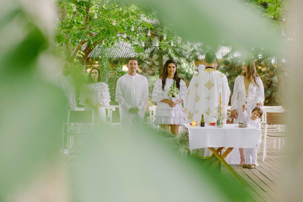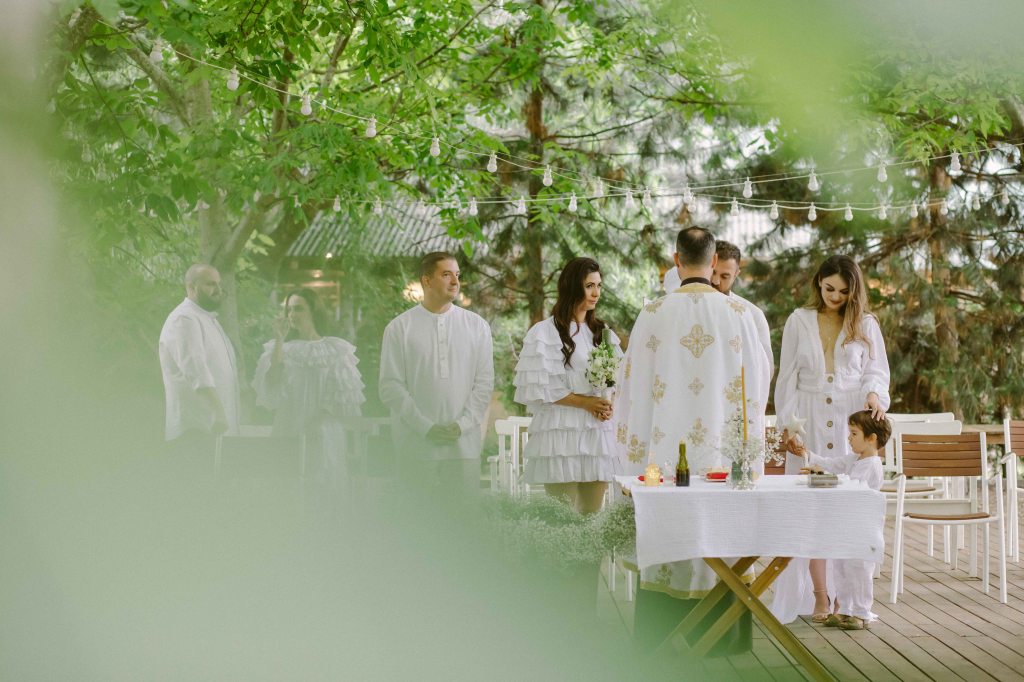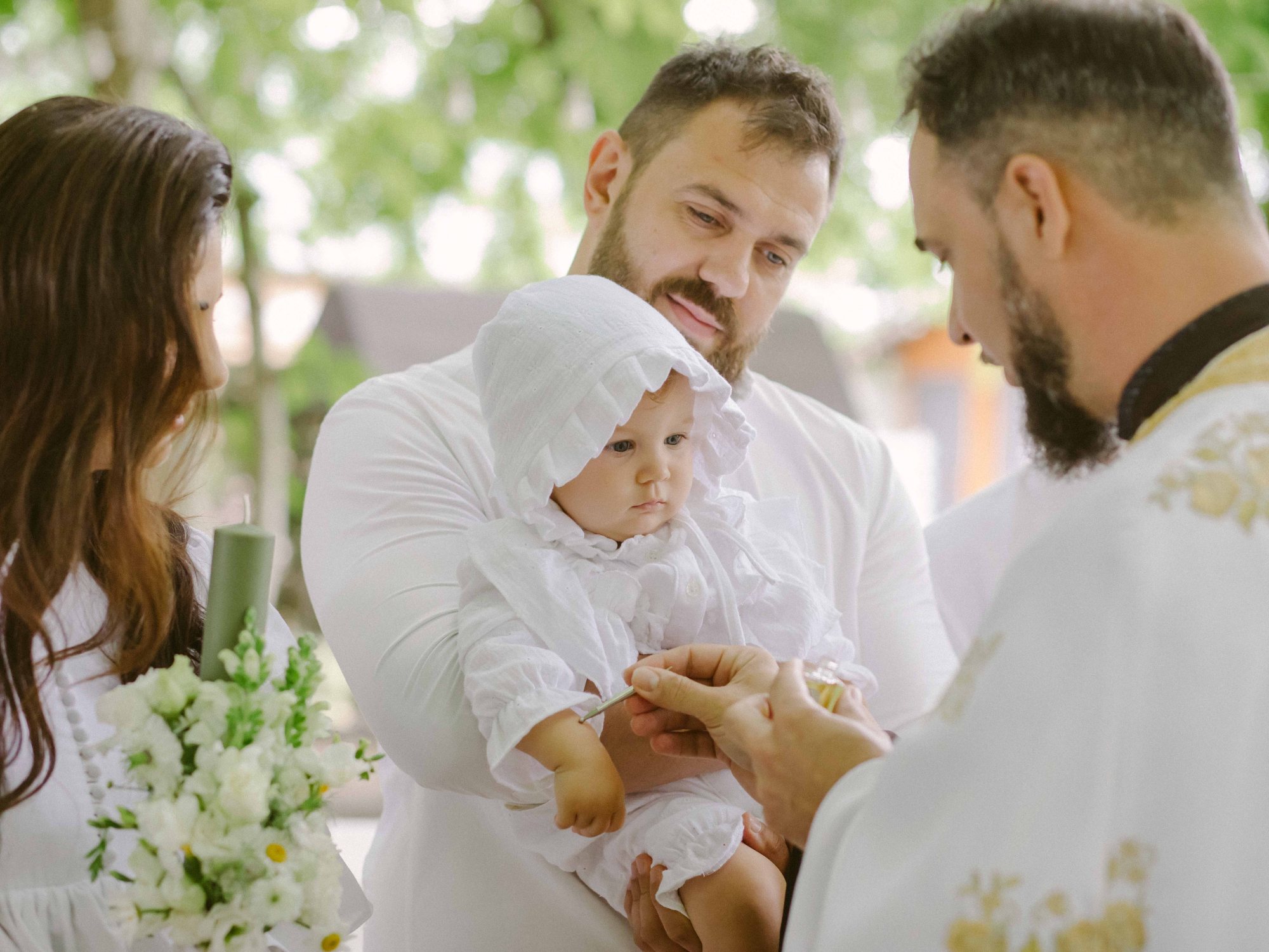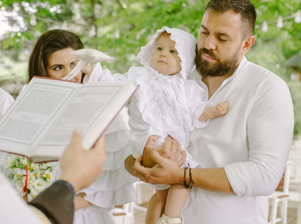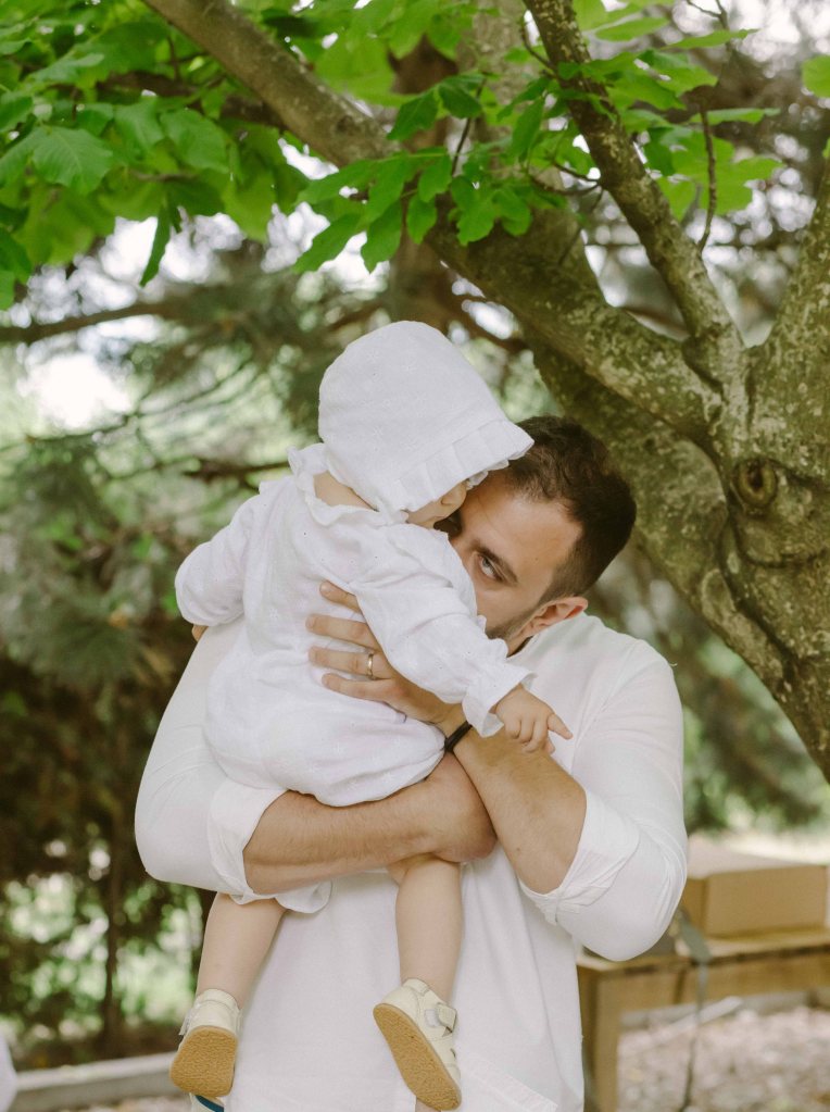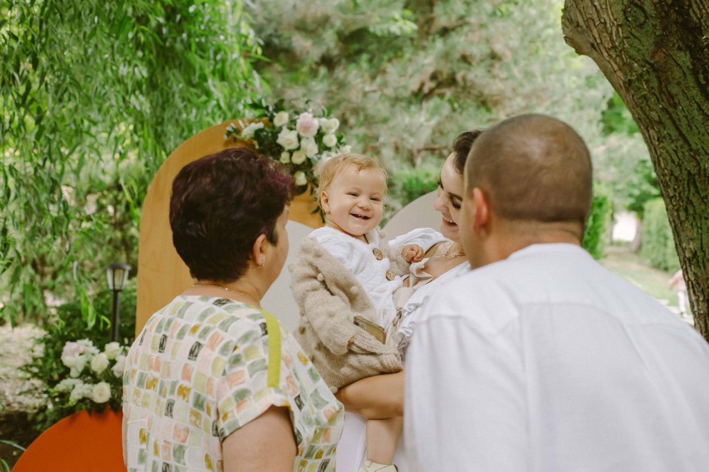 Cat despre slujba de botez… aveam o imagine draguta in minte, cu slujba de botez facuta afara, printre copaci. Eram convinsa ca este absolut imposibil acest lucru, insa am pus o intrebare celor de la conac, sperand ca poate s-au mai intalnit cu cerinta aceasta la cei care au facut ceremonii de nunta afara. Si da, intr-adevar, mai fusesera astfel de ceremonii, am primit contactul unui preot din zona, am sunat, am vorbit si am stabilit sa facem slujba de botez afara. Si a fost absolut minunata! Preotul atat de bland si bun si rabdator, slujba in sine atat de frumoasa si intima (am fost doar noi, nasii si familia). A fost pentru prima oara cand o slujba de botez mi s-a parut incredibil de frumoasa (eu si Andrei nu suntem niste persoane neaparat religioase). Trusoul Anastasiei a fost facut la @lushilushcom, mi-au placut pentru ca sunt extrem de simple si folosesc materiale naturale. Ca sa respectam tematica petrecerii, am ales ca lucrusoarele din trusou sa fie facute din in si muselina. Am ales o cutie din rachita, ca sa se potriveasca mai bine ideii de petrecere de gradina. Lumanarea de botez (am ales-o verde, mi s-a parut ca se potriveste mai bine decat clasicul alb/crem), florile de pe lumanare si de pe cristelnita au fost facute de Dana de la conac.