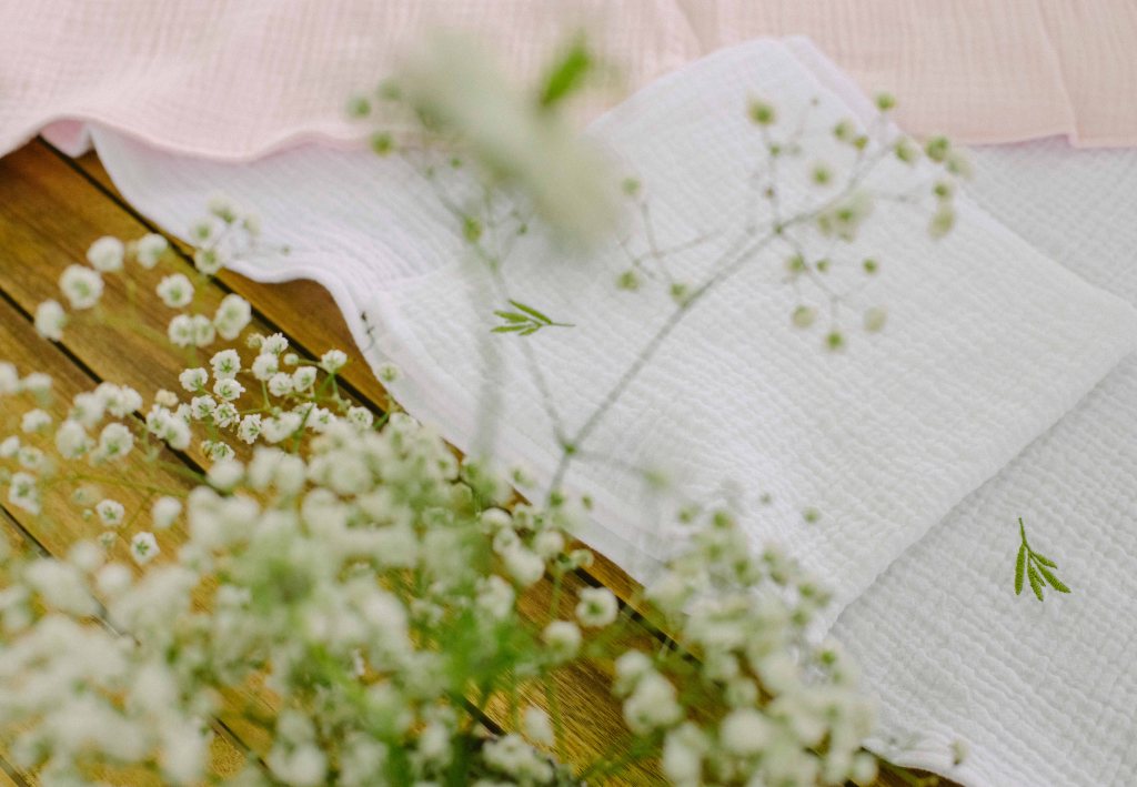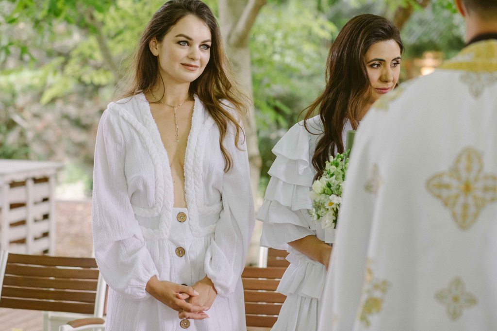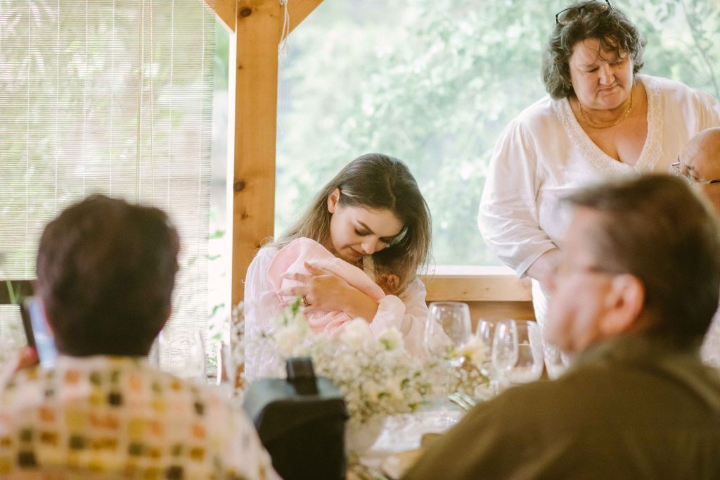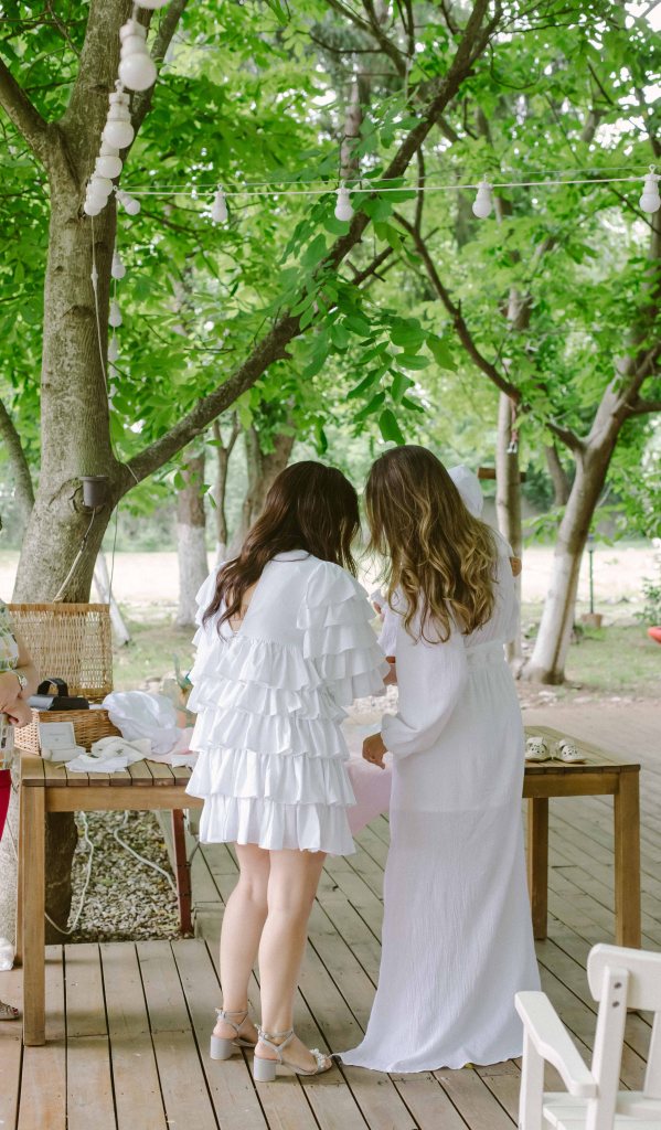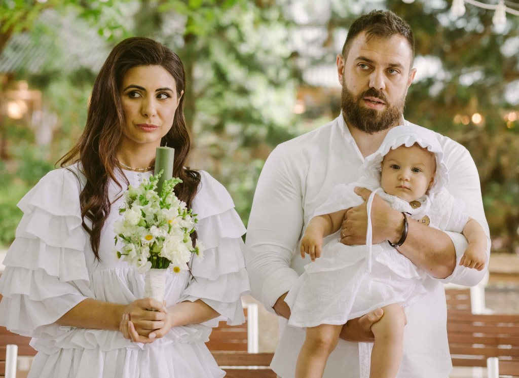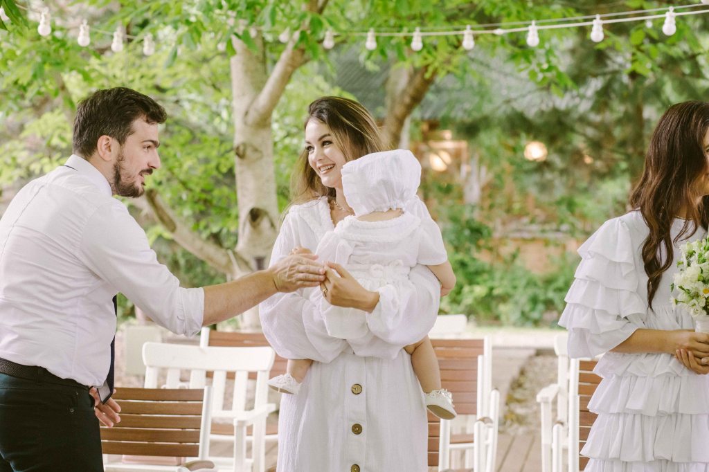 Cat despre slujba de botez… aveam o imagine draguta in minte, cu slujba de botez facuta afara, printre copaci. Eram convinsa ca este absolut imposibil acest lucru, insa am pus o intrebare celor de la conac, sperand ca poate s-au mai intalnit cu cerinta aceasta la cei care au facut ceremonii de nunta afara. Si da, intr-adevar, mai fusesera astfel de ceremonii, am primit contactul unui preot din zona, am sunat, am vorbit si am stabilit sa facem slujba de botez afara. Si a fost absolut minunata! Preotul atat de bland si bun si rabdator, slujba in sine atat de frumoasa si intima (am fost doar noi, nasii si familia). A fost pentru prima oara cand o slujba de botez mi s-a parut incredibil de frumoasa (eu si Andrei nu suntem niste persoane neaparat religioase). Trusoul Anastasiei a fost facut la @lushilushcom, mi-au placut pentru ca sunt extrem de simple si folosesc materiale naturale. Ca sa respectam tematica petrecerii, am ales ca lucrusoarele din trusou sa fie facute din in si muselina. Am ales o cutie din rachita, ca sa se potriveasca mai bine ideii de petrecere de gradina. Lumanarea de botez (am ales-o verde, mi s-a parut ca se potriveste mai bine decat clasicul alb/crem), florile de pe lumanare si de pe cristelnita au fost facute de Dana de la conac.