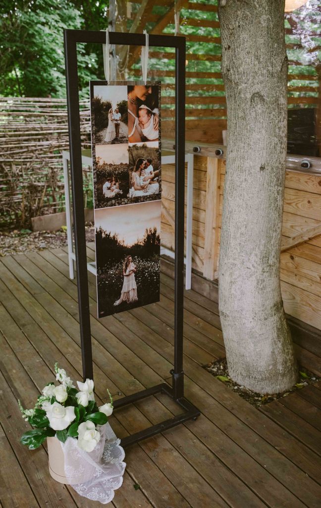Imi amintesc si acum ce reactie am avut cand Dana m-a intrebat daca as vrea sa avem un photo corner undeva pe domeniu 🙂 A fost un NU extrem de categoric, avand in minte imaginea clasicelor photo cornere, cu fundal in spate si diverse accesorii de “maimutareala”. Am inteles ulterior la ce se referea si mi s-a parut absolut minunata ideea. O canapea facuta dintr-o cada veche, plina cu perne, iar pe fundal un perete pe care atarnau borcanase cu floarea miresei. A fost pozitionat in zona piscinei si a aratat genial! Nu ne-am putut bucura de acest colt prea mult pentru ca a plouat foarte tare si a fost nevoie sa fie stranse pernele, dar am avut si un alt colt pentru poze, facut la Andreea Velican. Niste panouri mari, decorate cu flori, unde puteam face poze. Acesta a fost amplasat intr-un loc mai ferit, aproape de hambar, astfel ca l-am putut folosi chiar si daca a plouat. Tot de la Andreea Velican am avut si un sevalet dragut, cu un cerc mare de lemn pe care scria numele Anastasiei, pe care l-am asezat la intrarea in hambar. Si un suport de fier cu un colaj frumos atarnat, de la prima noastra sedinta foto in patru (cand Anastasia avea doar doua luni). Toate decorurile au fost foarte frumoase, s-au integrat perfect in toata povestea noastra.