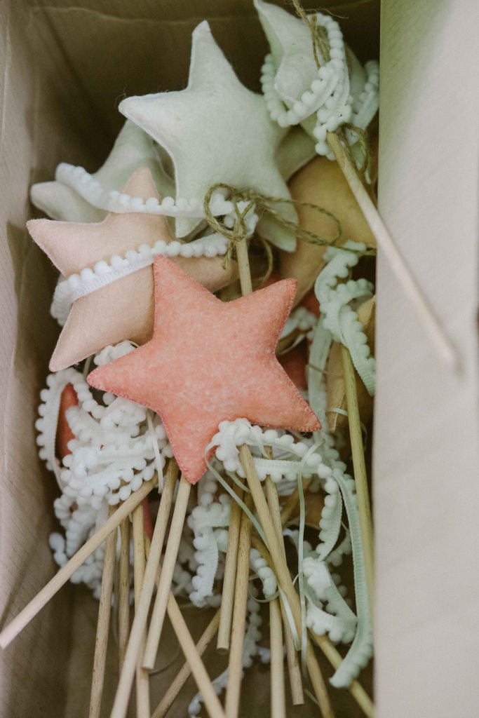 Nu am avut marturii pentru ca desi ideea unor micute cadouri pentru invitati ne placea tare mult, ne-am gandit ca indiferent ce am alege, sansele sa fie un obiect care nu le este de folos invitatilor vor fi foarte mari. Asa ca am facut cadouri doar pentru copii, cate o bagheta magica din fetru, decorate cu niste snururi ce aduceau a dantela (conform tematicii) facute la comanda de la @littleuniverse_handmade.