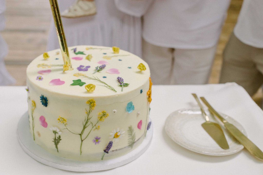 Tortul a fost facut la Bob De Dulce, de unde am tot luat torturi la evenimentele din ultimii doi ani. Am vrut un tort simplu ca design, insa pentru ca era un eveniment mai deosebit, am vrut sa dau totusi o directie/idee pentru designul lui. De obicei, comenzile la Bob De Dulce sunt de tipul “vreau un tort bun, oricum crezi tu ca e potrivit” pentru ca stiu ca intotdeauna sunt delicioase, insa acum vazusem niste poze pe Pinterest cu niste torturi decorate cu flori presate. Habar nu aveam ce e cu acele flori, cum au fost asezate, daca sunt sau nu comestibile, nimic. Asa ca i-am dat Andreei de la Bob De Dulce o tema tare dificil de realizat, s-a chinuit cateva saptamani sa preseze flori (a ales flori comestibile, cele din pozele mele erau flori normale). Dar a iesit minunat. Simplut dar foarte, foarte frumos, mi s-a parut extrem de potrivit tematicii si locatiei 🙂