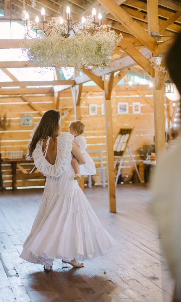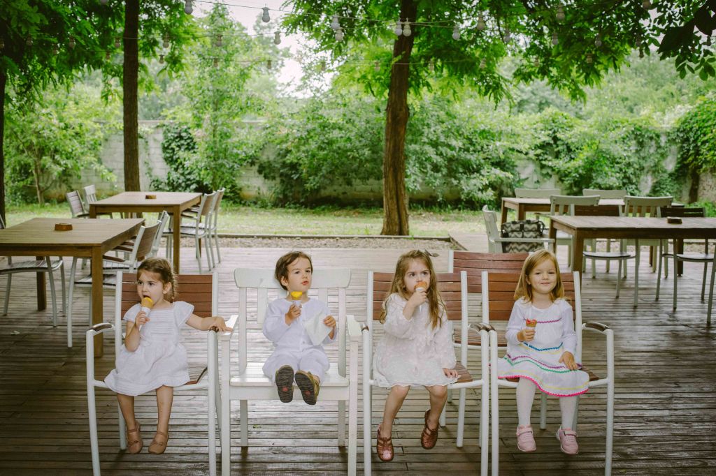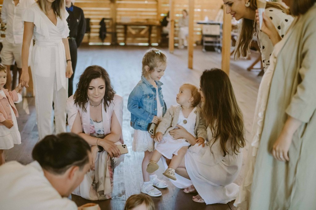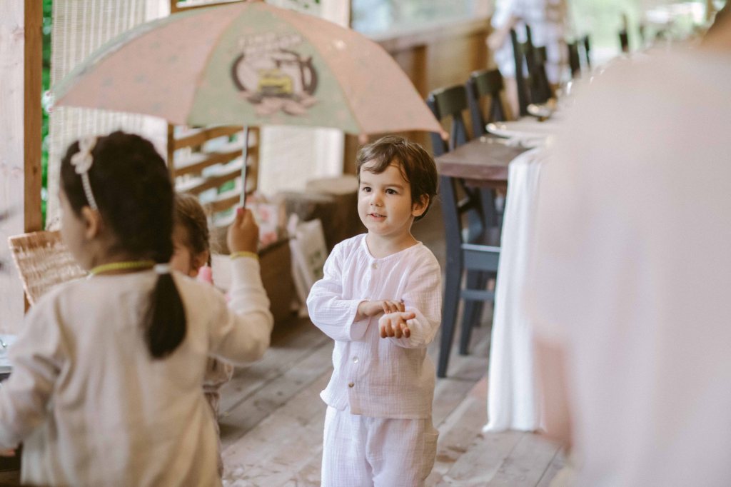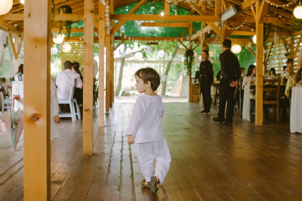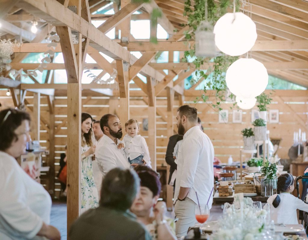 Am avut un colt decorat special si pentru copii, locul lor de joaca 🙂 Am vorbit cu cei de la @a.teepee.c pentru niste corturi de copii, cu bete de lemn si acoperite cu panza alba. Nu ma gandeam la mai mult de atat insa ideea lor de decor mi s-a parut minunata. Am completat decorul cu o masuta de lemn, multe perne pe care sa stea micutii mici la masa, covorase de exterior si decoratiuni facute manual din fasii de in si dantela. Initial ne gandisem sa fie trei corturi, insa din cauza ploii a trebuit sa mutam locatia lor, pe terasa hambarului. Dar a fost minunat, in felul acesta micutii erau chiar in vazul parintilor atunci cand se jucau. Ar mai fi fost o varianta de activitate pentru copii, un castel gonflabil alb (nici nu speram sa gasesc alb, de regula sunt toate foarte colorate, insa am gasit la @casteluloliviei) insa din cauza vremii nu am fi putut sa il tinem umflat, asa ca am anulat in ultimul moment, chiar cu o zi inainte de petrecere. Nu am avut animatori pentru copii pentru ca mai toti copiii prezenti aveau pana in cinci ani (cei mai multi trei-patru si mai putin), si mi se parea ca ar fi o stimulare excesiva pentru ei. Oricum parintii nu i-ar fi lasat nesupravegheati, fiind asa micuti, si nu ar fi avut rost. Au avut oricum multe de descoperit pe domeniul conacului, multe locuri dragute, gradina cu legume si fructe (chiar a fost distractiv pentru ei sa vada legumele, sa manance capsuni direct din tufa, sa vada nucile culese si asezate frumos in cosulete etc), zona cu piscina, cateva leagane, hamacul. S-au distrat impreuna, chiar era ca o mica gradinita la eveniment 🙂