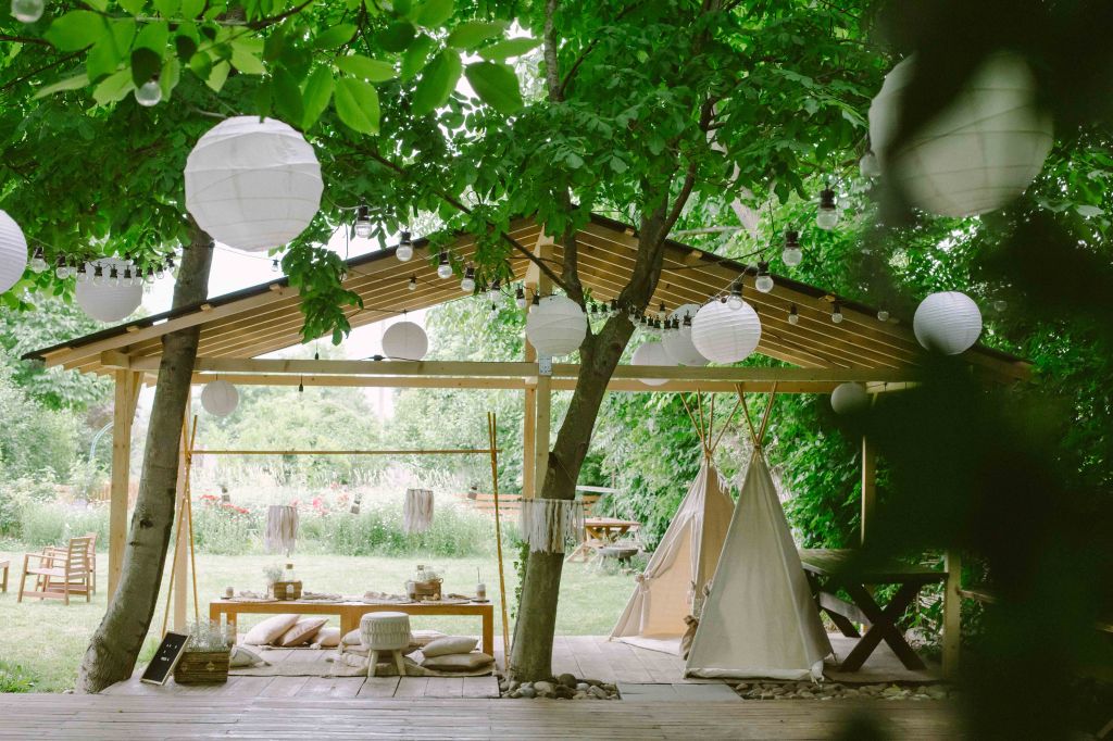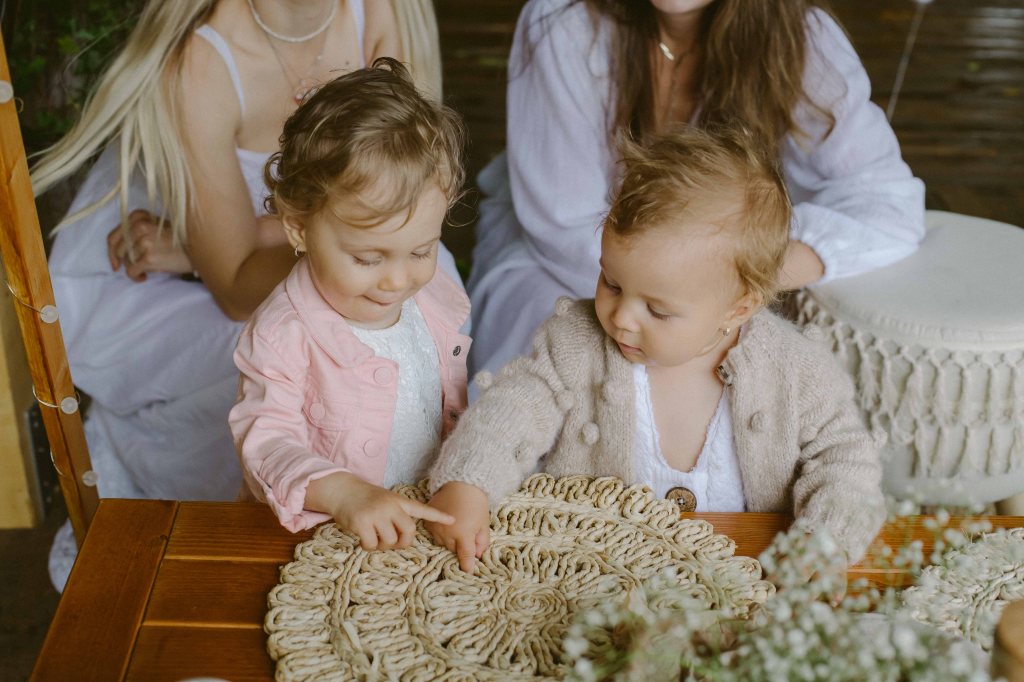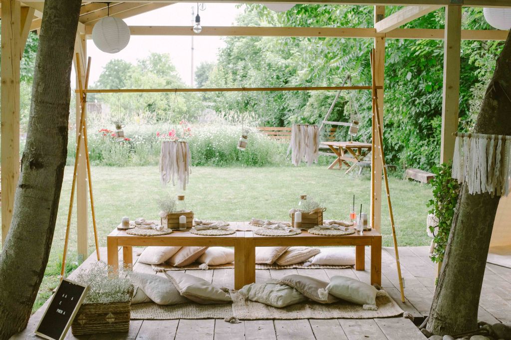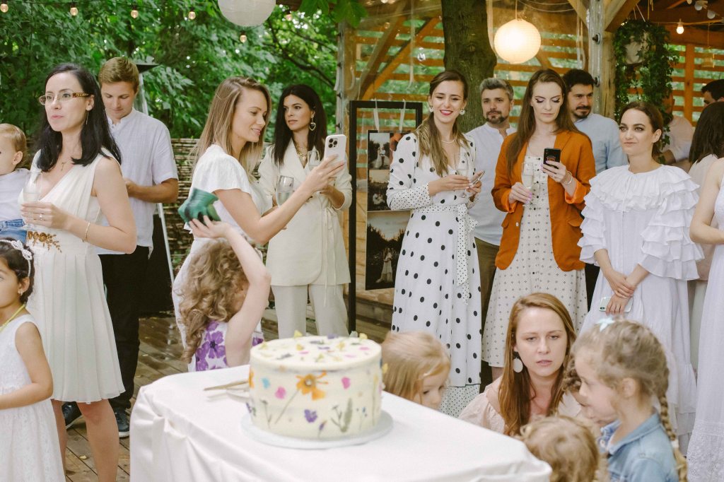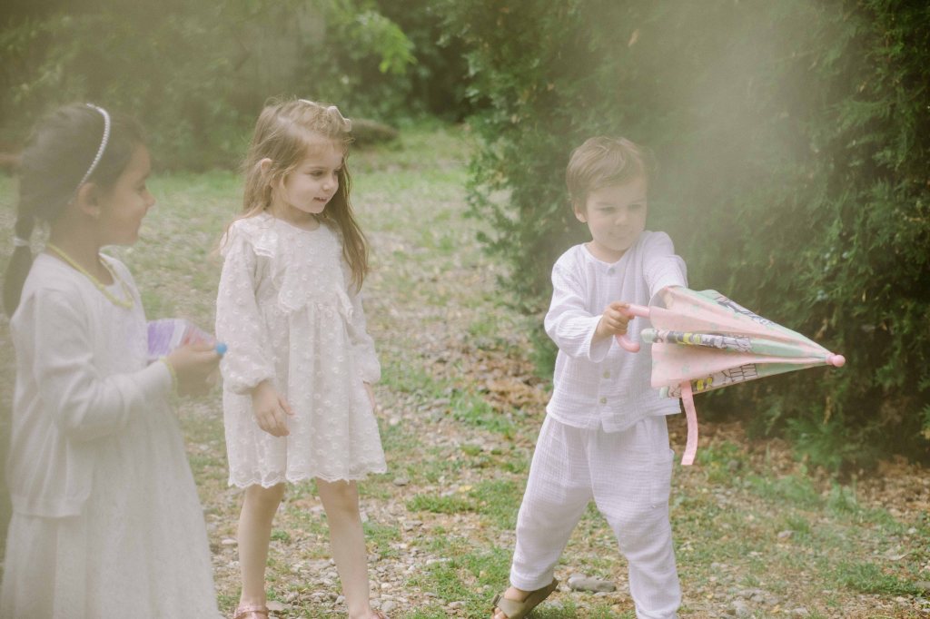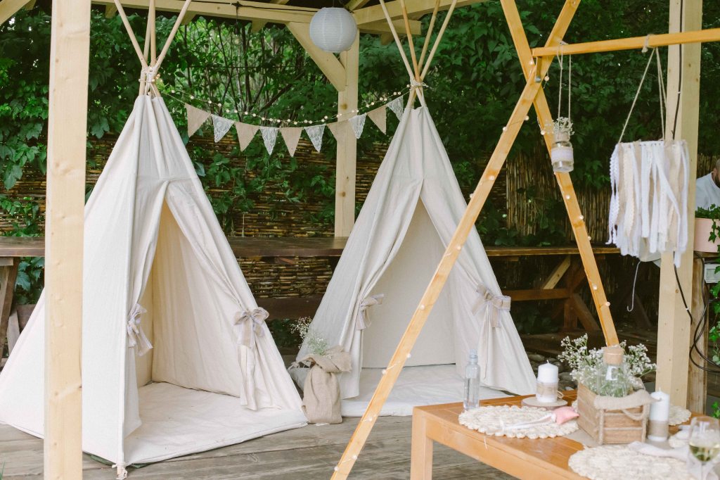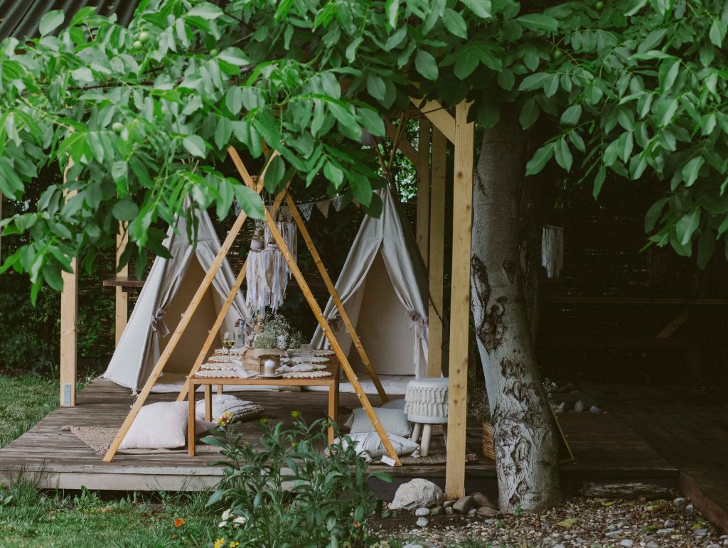 Am avut un colt decorat special si pentru copii, locul lor de joaca 🙂 Am vorbit cu cei de la @a.teepee.c pentru niste corturi de copii, cu bete de lemn si acoperite cu panza alba. Nu ma gandeam la mai mult de atat insa ideea lor de decor mi s-a parut minunata. Am completat decorul cu o masuta de lemn, multe perne pe care sa stea micutii mici la masa, covorase de exterior si decoratiuni facute manual din fasii de in si dantela. Initial ne gandisem sa fie trei corturi, insa din cauza ploii a trebuit sa mutam locatia lor, pe terasa hambarului. Dar a fost minunat, in felul acesta micutii erau chiar in vazul parintilor atunci cand se jucau. Ar mai fi fost o varianta de activitate pentru copii, un castel gonflabil alb (nici nu speram sa gasesc alb, de regula sunt toate foarte colorate, insa am gasit la @casteluloliviei) insa din cauza vremii nu am fi putut sa il tinem umflat, asa ca am anulat in ultimul moment, chiar cu o zi inainte de petrecere. Nu am avut animatori pentru copii pentru ca mai toti copiii prezenti aveau pana in cinci ani (cei mai multi trei-patru si mai putin), si mi se parea ca ar fi o stimulare excesiva pentru ei. Oricum parintii nu i-ar fi lasat nesupravegheati, fiind asa micuti, si nu ar fi avut rost. Au avut oricum multe de descoperit pe domeniul conacului, multe locuri dragute, gradina cu legume si fructe (chiar a fost distractiv pentru ei sa vada legumele, sa manance capsuni direct din tufa, sa vada nucile culese si asezate frumos in cosulete etc), zona cu piscina, cateva leagane, hamacul. S-au distrat impreuna, chiar era ca o mica gradinita la eveniment 🙂