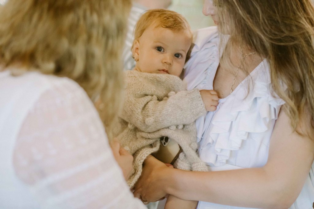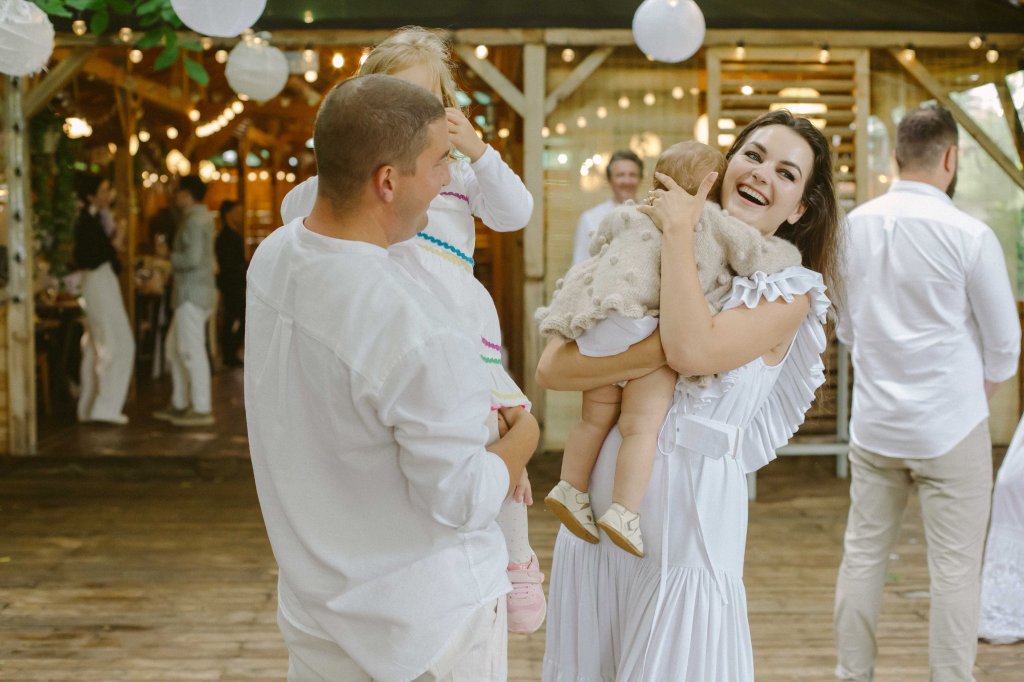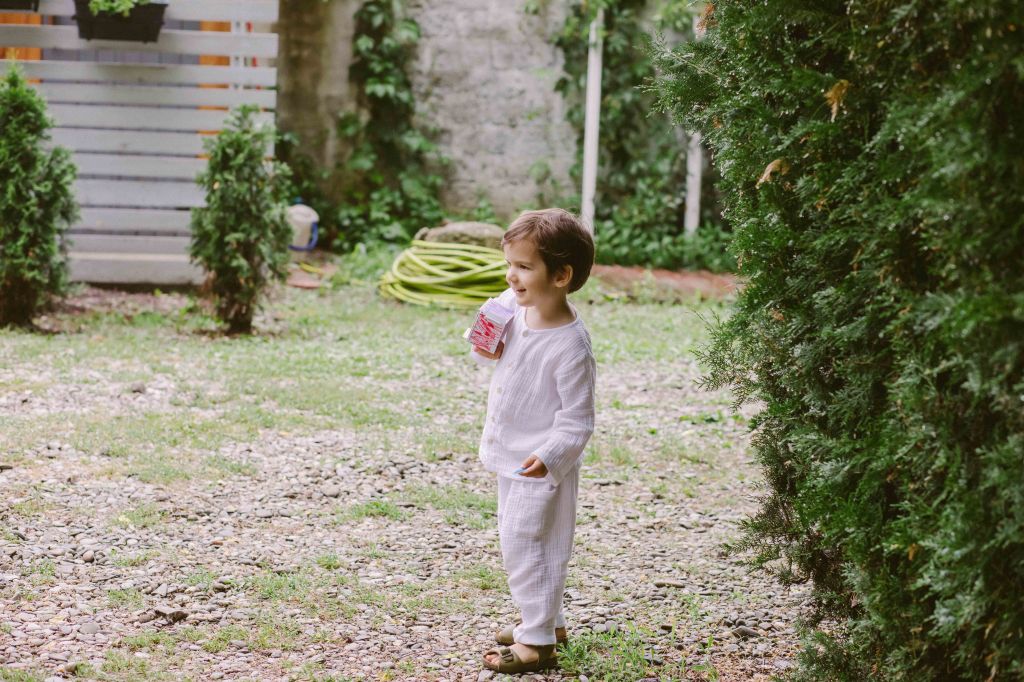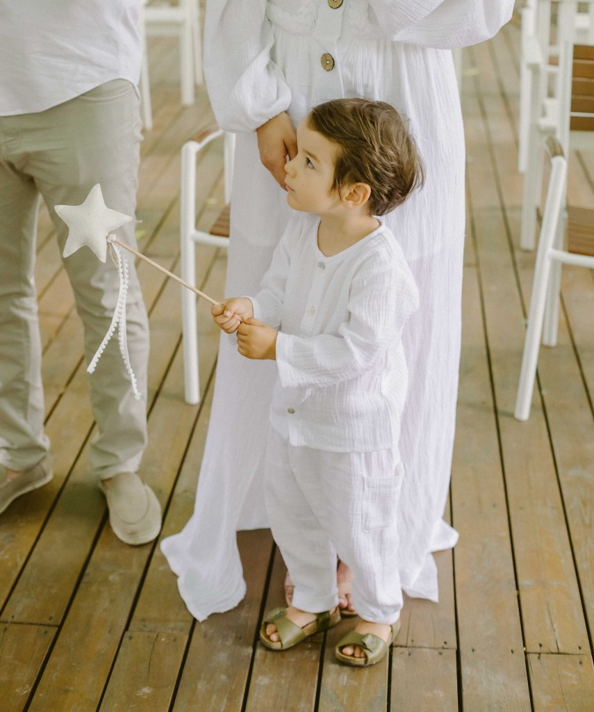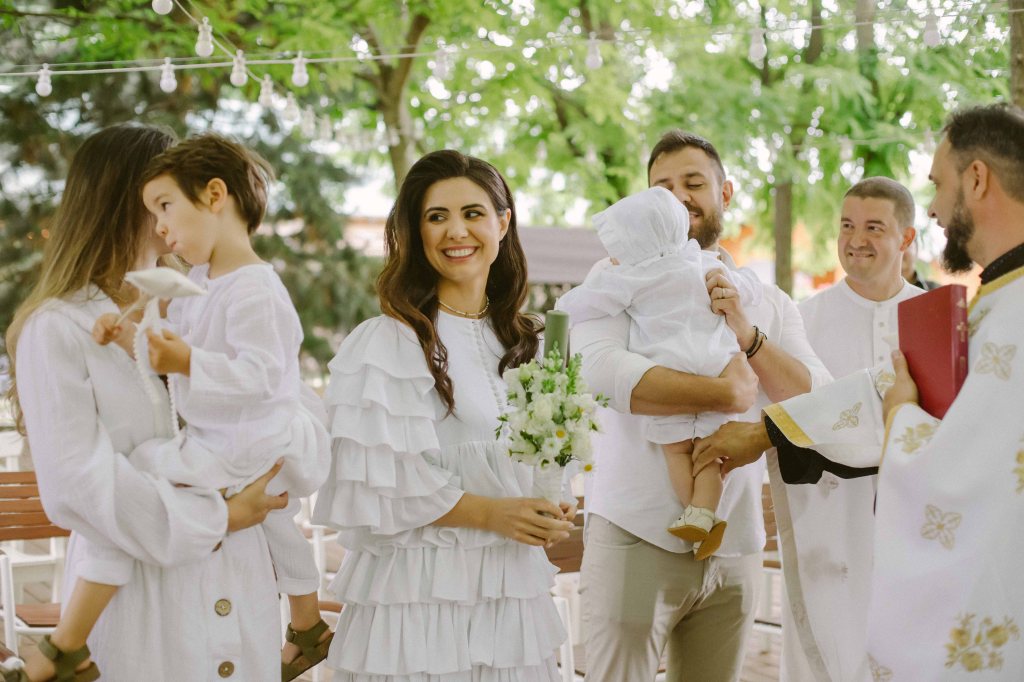 Am ales doua seturi de haine pentru Anastasia (probabil ca ar fi trebuit trei, fiind albe si usor de murdarit dar nu m-am gandit), unul pentru inainte de slujba de botez (o salopeta de muselina alba, cu volanase discrete, de la @theodorboutique, asortata cu o bonetica tare simpatica, din acelasi material) si o tinuta pentru petrece (o rochita alba din panza topita, asortata cu rochia purtata de mine, facuta la comanda de prietena mea Laura de la @lyfdesign). Am vrut sa fie imbracata cat mai simplu, nu voiam sa o chinui cu rochite pompoase, care ar fi incomodat-o si in care mi-ar fi fost si mie greu sa o alaptez sau sa o tin in brate. Pentru seara, cand avea sa fie mai racoare (si chiar a fost, mai ales dupa ploaia torentiala) am avut un pulover tip cardigan de lana, facut la comanda la @nor.romania (imi e atat de drag puloverul acesta, il voi pastra ca amintire). In picioruse a avut niste balerini crosetati manual, cu talpa din piele, de la @lialin. Si pe acestia ii voi pastra ca amintire in cutia trusoului 🙂 Alexei a avut si el doua seturi de hainute, un set complet alb de muselina (de la @theodorboutique) si un set de bumbac pe care nu a apucat sa il mai poarte. Era asa de entuziasmat ca nu putea fi vorba de schoimbat outfituri la petrecere :)) Eu am purtat doua rochii, la inceput o rochie din panza topita de la @lyfdesign, pe care o comandasem in urma cu aproape un an dar pe care nu apucasem sa o port inca si o rochie din colectia mea, pe care o facusem de test. Andrei a purtat niste hainute luate pe ultima suta de metri de la Zara, pentru ca stim cu totii vesnica problema cu sotii care nu vor niciodata sa isi cumpere haine noi 😀 Nici la botezul copiilor :)))