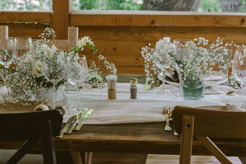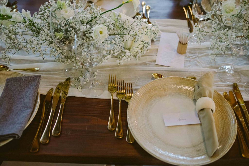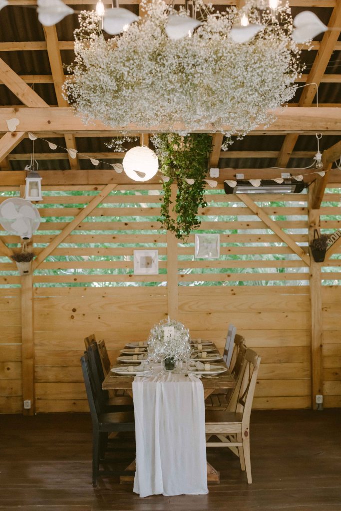 Cat despre decoruri… au fost ceva cautari! In primul rand, ne-am gandit si razgandit de nu stiu cate ori in ce parte a conacului sa facem evenimentul. Fiind un domeniu atat de mare, am fi avut mai multe optiuni (sunt diverse zone amenajate la conac), ne gandeam daca sa fie complet in aer liber, in zona Terrarium (unde de regula se organizeaza ceremoniile in aer liber) sau in Wedbarn (hambarul recent construit, unde sunt mesele, barul, ringul de dans). In final am ales sa facem in Wedbarn, chiar daca aveam destul de putini invitati (50 de invitati) si riscam sa fie cam prea “raspanditi” invitatii. Nu a fost cazul, cei de la conac ne-au pozitionat mesele astfel incat sa arate minunat! Iar toate decorurile meselor, hambarului si zonelor din domeniu au fost facute tot de ei (nu sunt incluse in costul inchirierii locatiei, insa se pot comanda pe langa). Iar eu mi-am dorit decoruri simple, cu flori simple, albe, predominant floarea miresei, in decoratiuni mai ample si bogate. Voiam ca mesele si intregul hambar sa arate ca din poveste, fara a fi insa extravagant sau prea sofisticat. Nu ma pricep la decoratiuni florale absolut deloc asa ca am rugat-o pe Dana de la conac sa work her magic cu decoratul si a iesit superb totul.