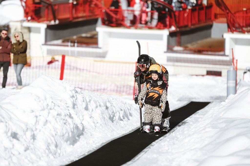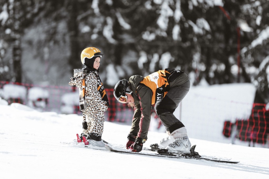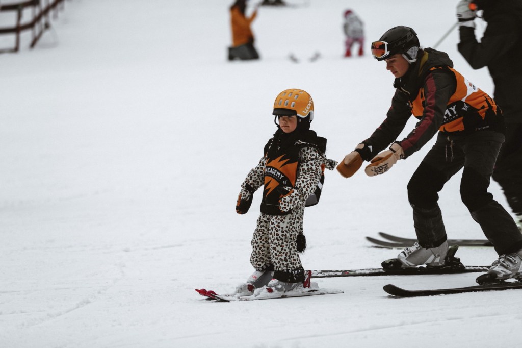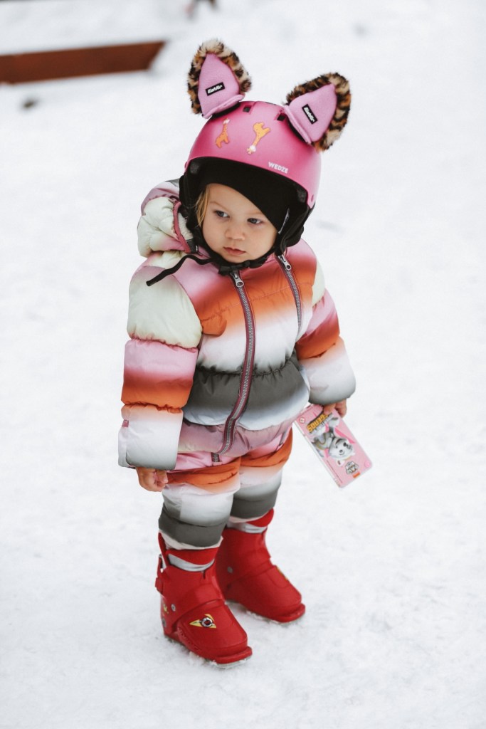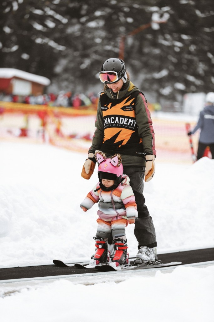 Au vorbit despre pozitiile schiurilor, despre cum poti tine picioarele in “cartofi prajiti” (picioarelele paralele) ca sa prinzi viteza sau cum poti face o pizza mare sau o pizza mica atunci cand vrei sa incetinesti sau sa te opresti (plugul), cum urci pe banda de pe partia de copii (“covorul magic”), cum validezi intrarile de pe card, totul intr-o forma cat mai haioasa si mai captivanta pentru ei. A fost ziua de cunoastere, fara asteptari prea mari, in cea mai mare parte a orei Alexei doar a alunecat pe partie in bratele instructorului, astfel incat sa se simta cat mai in control si mai in siguranta. Cand a decis sa se opreasca, ne-am oprit (dupa 40 de minute). Anastasia era fascinata de claparii ei mici, mici (masura 22) si de casca imprumutata, cu accesorii cu urechi de pisica, pe care o purta cu foarte multa mandrie (cine a stat doua zile sa rascoleasca tot internetul ca sa gaseasca ceva similar pentru castile lor, cine? :D). Am avut mari provocari zi de zi cu manusile, pe care nu le accepta oricat de mult ne-am stradui sa le prezentam intr-o forma mai interesanta, asa ca manutele ei au fost in permanenta reci bocna. Din fericire, Karina (instructorul de schi) ne-a adus niste saculeti mici termici, de la Decathlon, cu care am mai reusit sa o ajutam sa se incalzeasca.