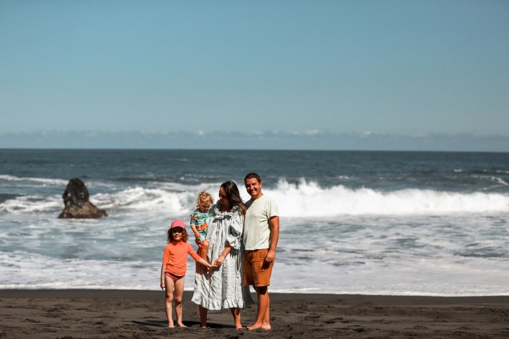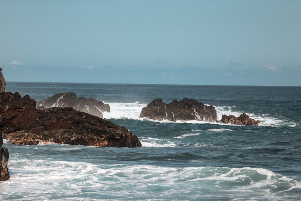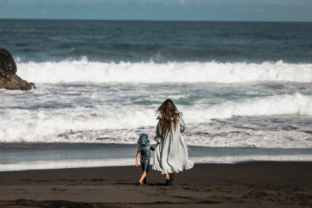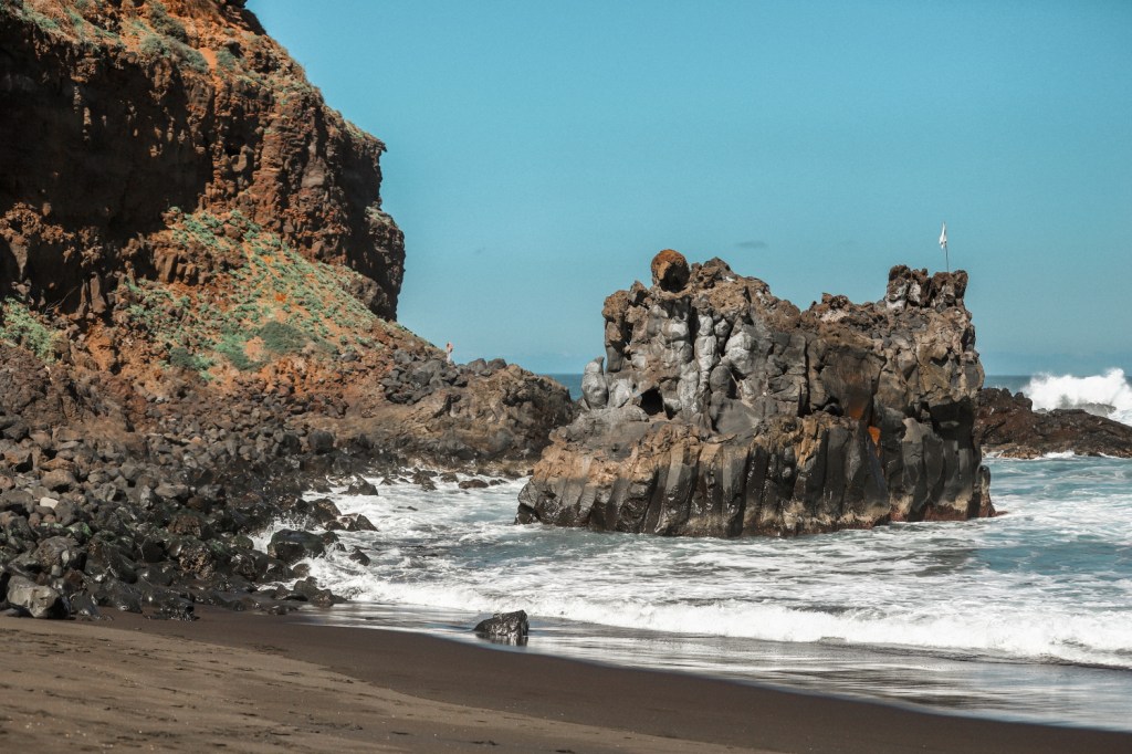 Si am inceput cu Plaja Bollullo. Prima plaja din nordul insulei pe care voiam sa o vedem. Partea de nord a insulei Tenerife este complet diferita de zona de sud, si recunoastem ca este mult, mult mai pe gustul nostru. Partea de sud insa vine cu avantajul facilitatilor pentru familii, plaje mai confortabile, mai accesibile, mai cu… tot ce am putea avea nevoie pentru cei mici. In nord insa (cand spun nord nu ma refer la bucatica aceea lungita, unde este Parcul Rural Anaga, ci la zona Puerto de la Cruz) este o alta poveste. Plajele sunt cu nisip negru, sunt mult mai salbatice, relieful este mai spectaculos (deseori sunt la baza unor stanci), totul este mult mai dramatic si mai impresionant. Aveam trei plaje din nord pe lista noastra: Playa Bollullo si Playa Castro (in zona oraselor La Orotava si Puerto de la Cruz) si Playa Benijo, din nordul nordului, in Parcul Rural Anaga. Plaja Bollullo e… absolut geniala! Stiam ca nu ne va fi usor cu copiii aici, insa ne-am propus ca macar o ora sau doua sa mergem sa stam putin aici. Drumul pana la plaja este destul de provocator, este o portiune foarte, foarte stramta, in care incape o singura masina (chiar aveam emotii sa nu ne intalnim cu vreo masina care venea din sens invers). Chiar deasupra plajei este un restaurant cu terasa cu o priveliste frumoase (Bollullo Beach se numeste), unde au si o parcare mare. De aici, de sus, se vede spectaculos plaja Bollullo. Tot de aici incepe si traseul de coborat inspre plaja. Nu este neaparat greu, dar este destul de lung. Daca am fi carat dupa noi toate cele pe care le luam de obicei cand mergem la plaja, ne-ar fi fost cumplit de greu si la coborare, dar mai ales la urcare. Este o coborare in panta usoara (de aceea e lung), sunt si trepte, si ne temeam ca nu se vor descurca micutii sa ajunga pana la plaja. Nu a fost insa cazul, ba chiar li s-a parut extrem de distractiva aventura. Plaja e superba, absolut superba, cu un nisip negru atat de fin si stralucitor, cu valuri imense (nu a fost vorba de intrat in apa, doar de privit si ascultat valurile de pe plaja) si un peisaj minunat. Nu sunt insa zone umbrite (am innebunit de cald in cele nici macar doua ore petrecute aici), nu sunt toalete sau alte facilitati (am luat cu noi ceva de baut si mancare pentru copii). Fiind mai putin accesibila, era foarte putina lume, cei mai multi fara copii π