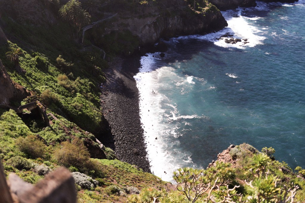 Cat au dormit copiii la pranz ne-am indreptat catre Playa Castro, foarte aproape de La Orotava. Vazusem niste poze spectaculoase pe internet si ne doream foarte mult sa ajungem macar sa o vedem (stiam ca nu puteam sa si stam). Copiii inca dormeau in masina, asa ca a ramas Andrei cu ei, cat timp noi ceilalti am mers catre plaja. De sus, de unde am parcat (langa restaurantul de la Mirador de San Pedro din Los Realejos), trebuia sa trecem printr-o zona numita Rambla de Castro, plina de palmieri (arata fix ca o oaza intesata de palmieri!) si cu privelisti spectaculoase catre ocean. Este o poteca destul de abrupta in prima faza (nu este recomandat de mers in papuci, sunt niste pietre mari si alunecoase), apoi drumul este destul de lin. Sunt multe podete de lemn si chiar e o plimbare placuta. La un moment dat se ajunge la un indicator care indica doua directii: la stanga catre Playa Castro, la dreapta catre fortul Fortin de San Fernando. Insa atunci cand am fost noi era trecut pe indicatorul respectiv un avertisment. Drumul era in teorie inchis din motive de securitate. Practic, toti cei cu care ne-am intalnit pe drum (nu foarte multi insa) intrau pe acel drum si coborau spre plaja. Noua ne-a fost putin teama, fiind si cu micuta Catinca, asa ca am preferat sa o luam la dreapta, inspre fort, de unde aveam sa vedem privelistea direct catre plaja. Chiar daca nu am reusit sa ajungem pe plaja (era plaja de pietre, ar fi fost destul de greu de stat oricum), de sus se vedea spectaculos.