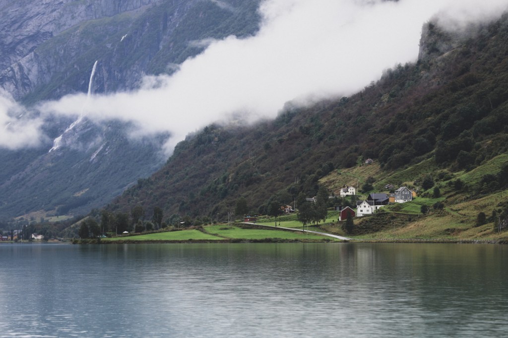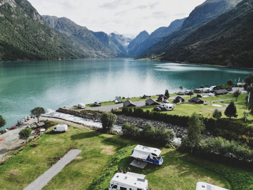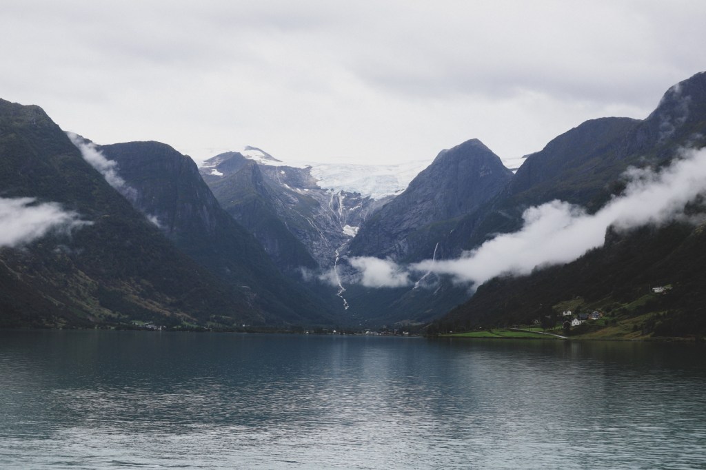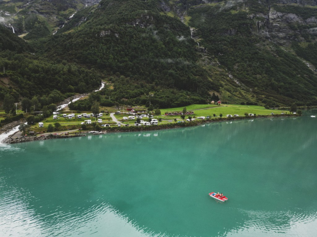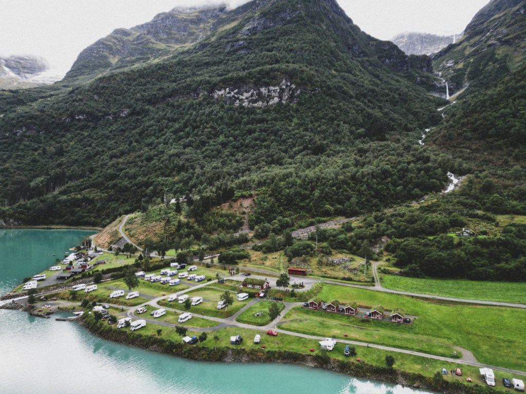 Din satul Flam pana la Gryta Camping este un drum de aproape patru ore cu autorulota. Drum tipic Norvegiei. Cu feribot din Fodnes in Mannheller (feribot electric!), cu peisaje idilice, cu drumuri sinuoase, de coasta, pe o singura banda, cu ape turcoaz, creste de munti spectaculoase, satuce mici, cu case rosii de lemn si puncte de belvedere minunate catre fiord (chiar si noi am oprit la un astfel de punct, in apropierea satului Fjaerland). Iar drumurile incepusera deja sa arate complet diferit fata de tot ce vazusem pana atunci. Crestele muntilor incepusera sa fie acoperite de zapada (doar incepeau “ramurile” ghetarului Jostedal), peisajele erau deja mai dramatice, cerul mai intunecat, cascadele mai dese si mai impresionante. Totul era nesperat de frumos. Iar la un moment dat, in fata noastra, am zarit ghetarul. In toata splendoarea sa, imens, cu nuante de albastru, coborand usor dintre munti. Iar la baza muntelui, lacul Jolstravatnet cu apele sale turcoaz. Mi se par impresionanti ghetarii. Aceeasi reactie de uimire am avut-o si in Islanda, cand urcasem pe Vatnajokull (si de fapt am si intrat in interiorul sau), la fel si in Noua Zeelanda, cand am zarit in departare ghetarul Franz Joseph. Ghetarul Jostedal, cel pe langa care conduceam in caravana de autorulote, este cel mai mare ghetar din Europa Continentala (pentru ca daca luam in calcul si insulele, Vatnajokull din Islanda e cel mai mare din Europa). Opt sute de kilometri patrati de ghetar, care se intind si coboara in zone foarte accesibile de vizitat prin bratele sale (cum este bratul Briksdal pe care aveam si noi sa il vedem). Am continuat drumul pana cand am ajuns in zona satului Utvik, unde pur si simplu nu am mai putut sa conducem. Voiam sa oprim, sa coboram din autorulota si sa ne uitam la privelistea fascinant de frumoasa catre fiord. Parca era pacat sa o vedem doar in treacat, prin geamurile autorulotei. Aveam nevoie sa ne bucuram putin de locurile acestea spectaculoase. Ne convinsesem deja ca Norvegia este ireal de frumoasa, insa ziua si drumul acesta catre campingul Gryta au reconfirmat acest lucru. De la Utvik am avut o mica problema cu autorulota, pentru ca am trecut printr-o zona cu multe serpentine in curba si am suprasolicitat franele. Mirosea in toata autorulota a frane si am avut nevoie de o pauza de un sfert de ora pe marginea drumului, pentru a se raci un pic franele. Si apoi am ajuns in satucul Olden si campingul Gryta, destinatia noastra din acea zi.
