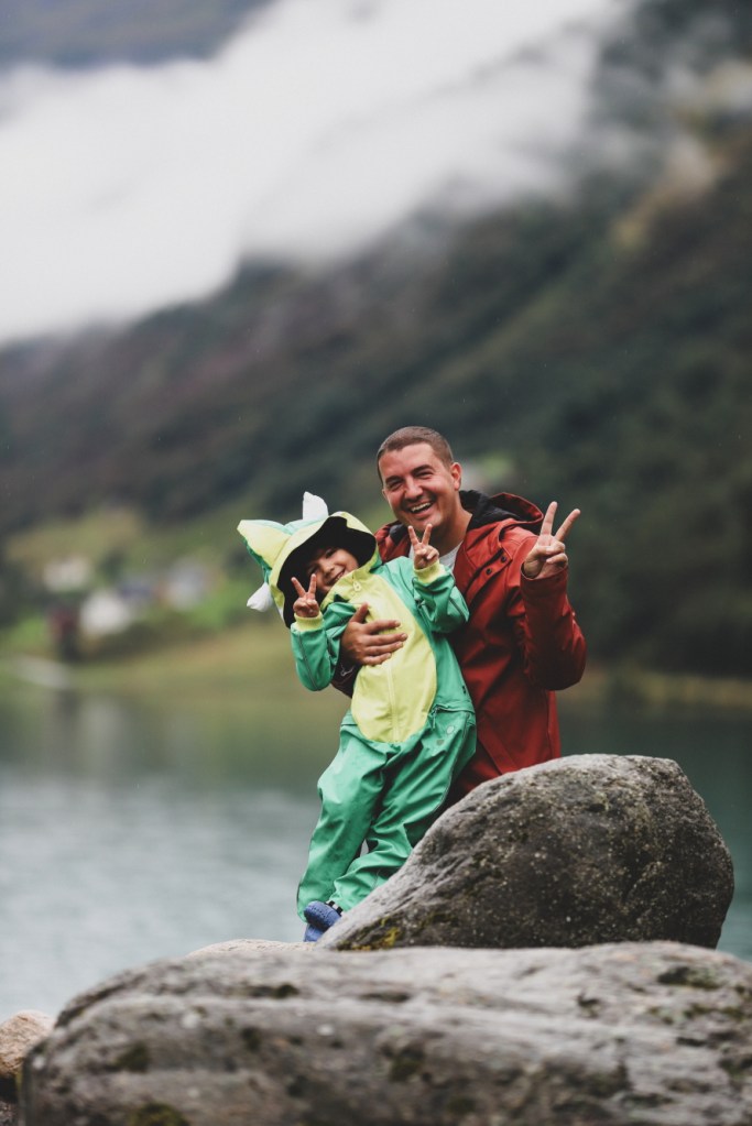 Ne era dor de o zi de stat degeaba, chiar daca avusesem una similara si in urma cu doua zile, in campingul Flam. Insa aici, la Gryta Camping… era ATAT DE FRUMOS totul, incat pur si simplu voiam sa stam. Sa ne facem un ceai, sa stam in ploaie cu pelerinele pe noi, sa ne uitam la apa turcoaz (era turcoaz chiar si pe vremea aceea ploioasa si intunecata, nu imi pot imagina cum ar fi aratat cu soare), sa ne uitam la copii cum se joaca in ploaie si sa ne bucuram de privelistea incredibila cu ghetarul in dreapta noastra. Locatia acestui camping este un vis frumos. Si daca ar fi sa aleg un singur loc din Norvegia in care sa ma teleportez acum, fara sa stau nicio secunda pe ganduri, as zice Gryta Camping. Acolo jos, langa micul “debarcader”, cu barci, hidrobiciclete si sup-uri 🙂 De altfel asta am si facut intreaga zi. Am stat in locul acela, langa apa, am dormit si ne-am relaxat. Iar ploaia, desi insistenta, a fost perfecta. Nici ca putea contura mai bine imaginea frumoasa a acestui loc. Cand a parut ca se mai opreste un pic din intensitate, ne-am incumetat sa luam o hidrobicicleta toti patru (erau incluse in costul camparii, primeam si veste pentru fiecare in parte) si am mers in larg. Cat de frumos se vedea ghetarul si de acolo, din mijlocul apei!