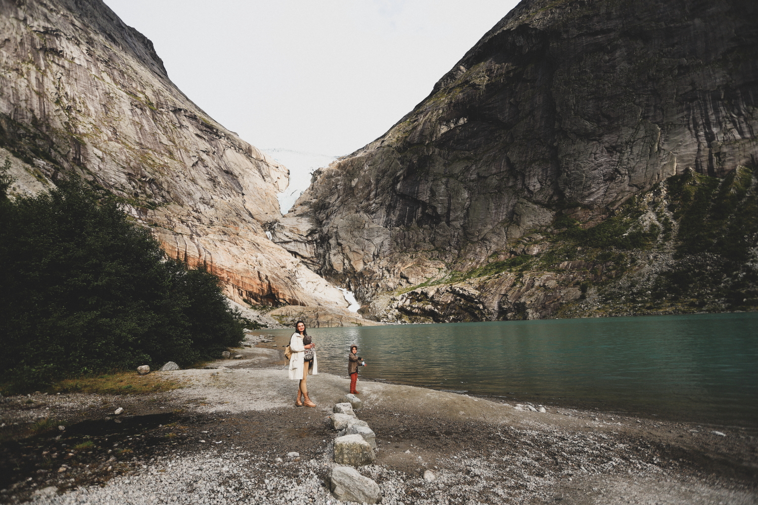 In orice caz, a fost extrem de amuzanta calatoria cu acel trollcar, am trecut printr-o cascada (care chiar ne-a udat bine) iar apoi am avut de urcat doar vreo 700m pe jos. Parca nici nu ne venea sa credem cat de usor a fost sa ajungem la ghetar, ne asteptam cu totii sa fie mai dificil de ajuns la baza lui. Si iata-ne, un intreg grup de 20 de adulti si 20 de copii, la baza ghetarului Briksdal, intr-o poza de grup care o sa ne ramana amintire intreaga viata. “Excursia cu clasa”. Ghetarul e spectaculos. De fapt intreaga zona era spectaculoasa, abia inaintam cu toate opririle noastre pentru poze! Este ireal cat de multe locuri frumoase exista in Norvegia, cat e de spectaculoasa tara aceasta si cat de multe are de oferit! Abia acum inteleg toate articolele si blogurile care sustin ca pentru a te bucura de Norvegia ai nevoie de cel putin o luna. Da, complet adevarat! Pentru ca spre deosebire de alte destinatii, unde poti grabi ritmul si poti vedea pe repede inainte anumite locuri (si sa te bucuri de ele chiar daca sunt vazute pe fuga), in Norvegia parca iti trebuie timp. Timp sa stai suficient in natura, timp sa apreciezi mai mult locurile prin care treci, timp sa te bucuri pur si simplu de privelisti.