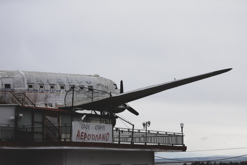 Totusi, nu voiam sa plecam din satul Nea Agathoupoli fara sa vedem imaginea de pe Google Maps care ne-a atras atentia la acest loc: cafeneaua DC3 Cafe, cu avionul cocotat sus pe acoperisul sau. Paaaiβ¦ doar Islanda sa aiba DC3-ul ei deja prea faimos la SΓ³lheimasandur? Din pacate nu am reusit sa ajungem acolo, asa ca am zis ca nu plecam din Nea Agathoupoli fara sa bem cafeaua la DC3 Cafe. Insa fiind duminica, era inchisa π Dar tot a meritat din plin sa mergem, chiar si numai pentru 5-10 minute. Nu stim inca istoria avionului, dar ne vom interesa π