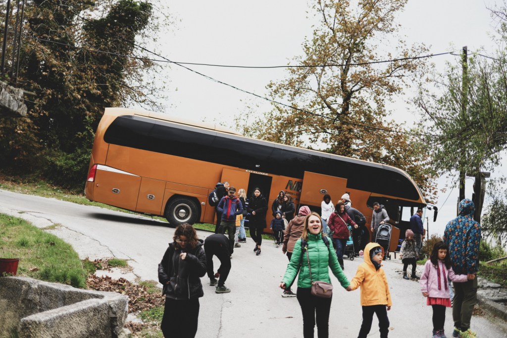 Ne-am trezit cu sunet de avioane de vanatoare la prima ora. Cu o zi inainte fusesera F16-uri, acum pareau sa fie Tayphoonuri. Antrenamente ale bazelor americane, ne spunea administratorul campingului, care incepusera cam in acelasi timp in care a pornit razboiul din Israel. Desi ne-au dat trezirea devreme, nu ne-a deranjat deloc “show-ul aviatic”, nici pe noi, nici pe copii. La ora zece aveam rezervat un autocar intreg pentru noi, pentru a merge la cateva satuce din imprejurimi (tot cei de la camping ne-au ajutat cu organizarea si ne-au propus aceasta excursie pentru 430 euro tot grupul de 12 familii). Am ales varianta de a merge cu autocarul pentru ca satele pe care aveam sa le vedem erau foarte mici, drumurile foarte inguste si sinuoase si ne-ar fi fost foarte greu (spre imposibil) sa mergem pe acolo 12 autorulote. Sincera sa fiu… si cu autocarul acela mi s-a parut la limita, in unele zone cu greeeeeu am crezut ca putem trece, dar pare ca am avut un sofer foarte priceput, obisnuit cu drumul greu din zona. Asta desi in autocarul nostru era un mic vacarm :)))) Rasete si plansete de copii, muzica greceasca data la maxim, tot tacamul :))