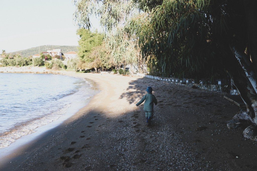 Cum e sa te trezesti dimineata cu sunetul valurilor marii pe fundal? Nu stim exact, pentru ca noi ne-am trezit in sunet de “mamiiiii, trezeste-teeeee, maaaaaami!!!”, “mamiiiii, Alexei mi-a dat cu picioru’-n naaaaas”, “mami, m-am plictisiiiit” si alte asemenea pret de 20 minute cat am tot incercat sa aman ridicatul din pat. Prin urmare, chiar daca eram fix deasupra marii, cu valurile batandu-ne teoretic in urechi, nu am auzit nimic 🙂 Daaaaar recunoastem ca somnul acesta, din cea de-a doua noapte in Grecia, a fost nesperat de bun si odihnitor. Nu aveam planuri pentru a treia zi in Grecia. Si in mod intentionat, nici nu ne-am facut. Ne tenta poate sa mergem pana in orasul Volos (la 11 km distanta de Campingul Sikia), al treilea cel mai mare oras grecesc, insa la fel de tentanta era si o leneveala intreaga la camping. Asa ca am luat jucariile de plaja ale copiilor, am coborat pe plaja campingului si am stat cu ei la joaca pana spre pranz. Am dormit cu ei la pranz, am cules si mancat (poate ca prea multe) mandarine, am citit, am stat si iar am stat. Campingul acesta, Sikia e minunat, aflat exaaaaact pe plaja, cu toate locurile de campat indreptate spre mare. E ca un amfiteatru, pe etaje, iar privelistea catre Golful Pagasitic este superba. Daca e atat de frumos (aproape) iarna, pe frig si vant si fara alti turisti (exceptandu-ne pe noi si cuplul de elvetieni) nu imi pot imagina cum e vara! Si tocmai pentru ca ne placea atat de mult aici (chiar daca vremea nu era prea prietenoasa), am hotarat sa ramanem trei nopti in acest camping. Fiind singurii din camping, si gazdele au fost extrem de dragute cu noi. Ne-au facut tot felul de reduceri, ne-au aranjat o excursie in satele din imprejurimi, ba chiar ne-au pus la dispozitie doua apartamente din complexul lor de apartamente, ca sa ii putem spala pe copii (dusurile comune erau in aer liber, era cam frig sa ii spalam acolo).