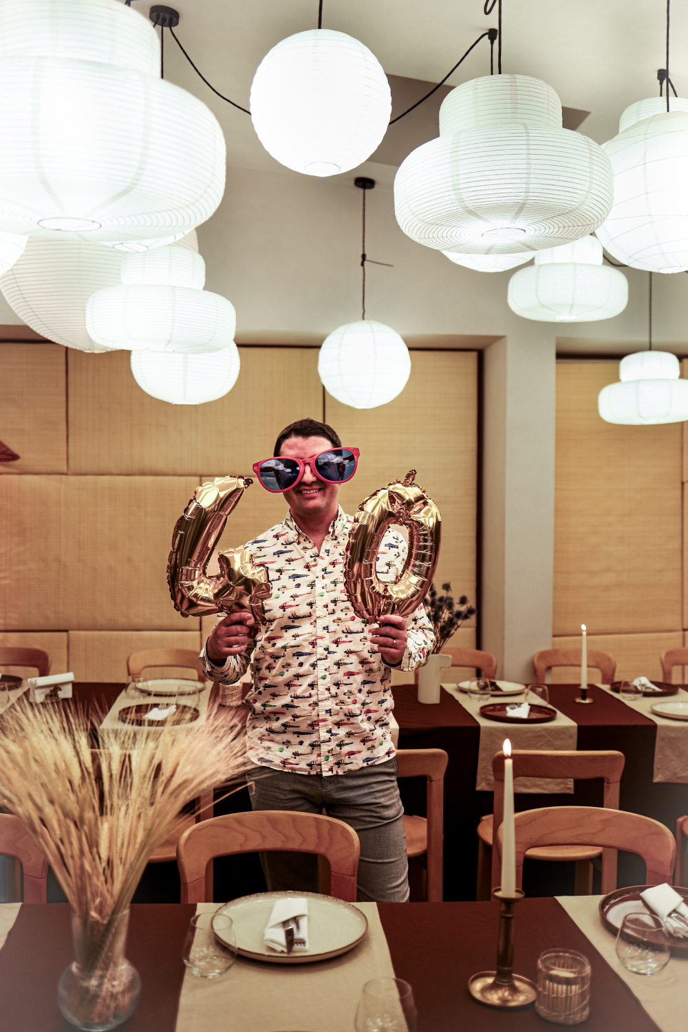 La capitolul decoratiuni, la fel ca la mancare, eram pe dinafara. Restaurantul este decorat extrem de frumos oricum, asa ca nu simteam neaparat nevoia sa decoram intr-un mod anume. Insa ni s-a propus sa avem totusi un decor al meselor mai elegant (mai de domn de 40 de ani :D), cu fete de masa maro si bej, cu lumanari simple si flori uscate (cat mai masculin). Luminile din restaurant au forma de balon, deci deja dadeau impresia de eveniment festiv, nu am simtit nevoia sa adaugam nimic. Si-a luat Andrei doua baloane in forma de 40, asa pe ultima suta de metri, temandu-se ca nu r suficient de ostentativa varsta pe care avea sa o implineasca. Si niste bratari fluorescente, care sa se potriveasca in tematica petrecerii.