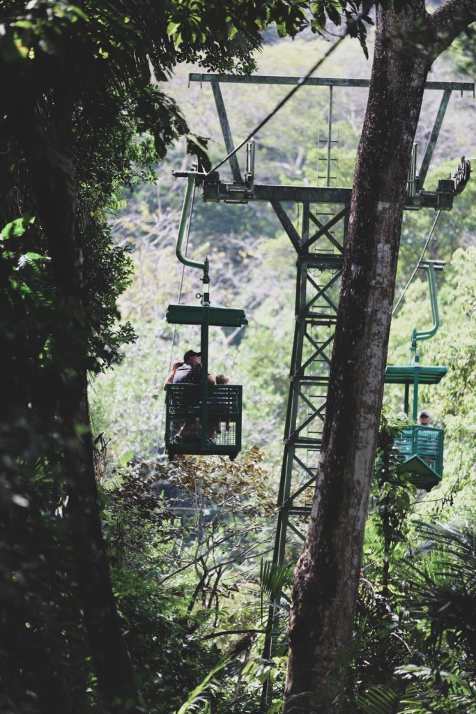 Ce mi-a placut in mod deosebit aici (pe langa privelistea frumoasa de pe terasa resortului) a fost plimbarea cu Aerial Tram (unde am fost dusi ca niste adevarati turisti comozi cu un mini-autobuz de la resort, chiar daca nu era mult de mers pana acolo). Sincera sa fiu, nu stiu ce-o fi fost in capul nostru sa mergem cu un copil de 2 si altul de 5 in gondolele acelea in aer liber (dintre care unul bolnav), pe deasupra junglei. Probabil fix ce-o fi fost in mintea noastra si cand am mers in Egipt cu submarinul cu un copil de opt saptamani neimplinite. Cert e ca uitandu-ma inapoi, nu stiu cat de mult m-as mai incumeta oricare dintre aceste experiente inca o data :)) In orice caz, Aerial Tram este de fapt un traseu pe deasupra junglei (superb de altfel!), cu mini gondole (potrivite pentru patru-sase persoane, insa noi am stat separat, cate doi) descoperite complet. Adica nu sunt inchise complet, sunt niste banci incadrate de un gard metalic, care se plimba frumos pe deasupra padurii tropicale, printre varfurile copacilor. Lasand la o parte temerile nebunesti de parinte de copii inca mici, plimbarea este SUPERBA. Se aude linistea padurii. Privelistea este minunata si am reusit sa vedem si cateva pasari tropicale foarte aproape de noi. Experienta in sine este minunata, daca nu o umbrim cu frici.