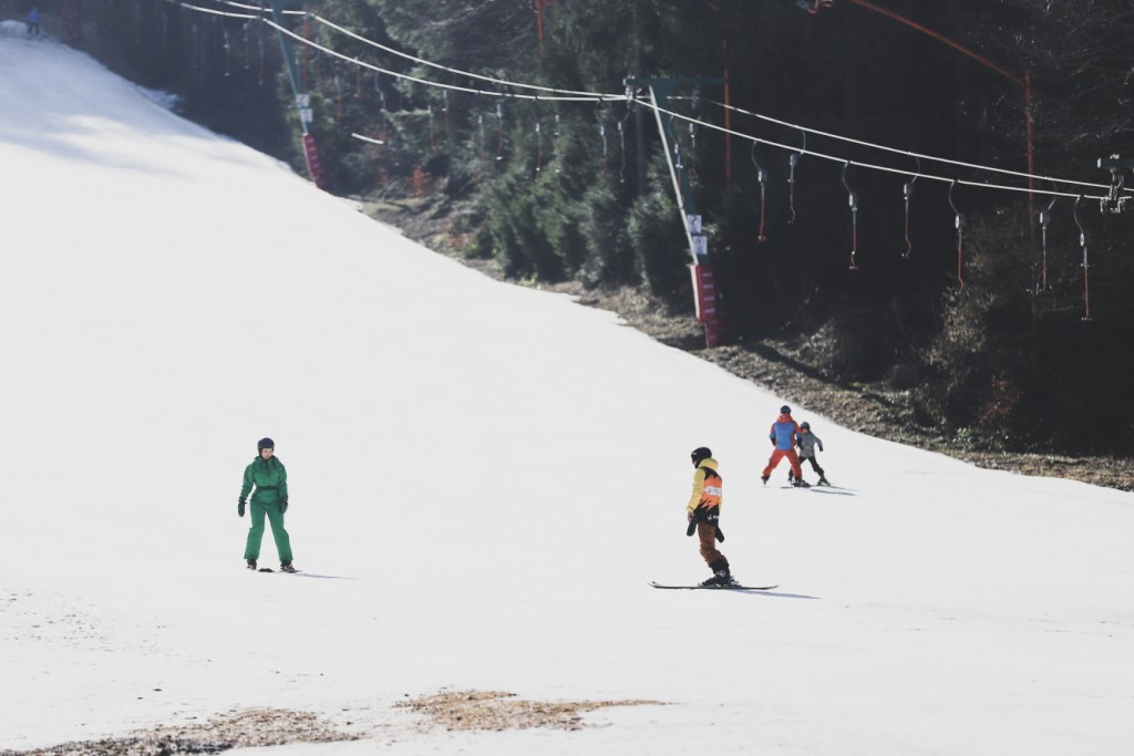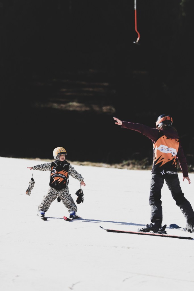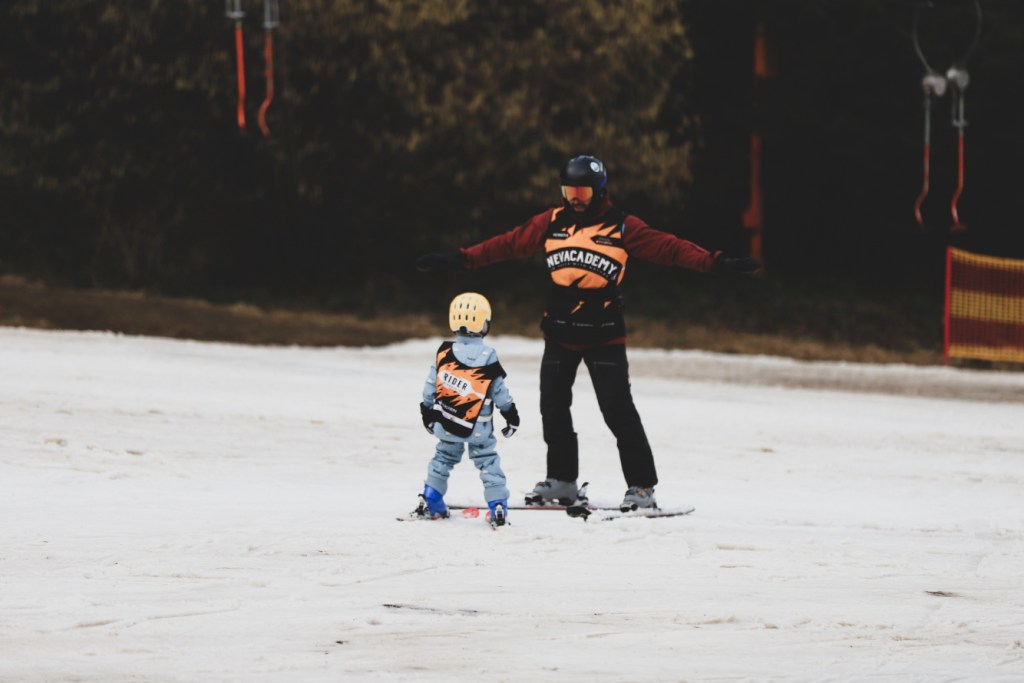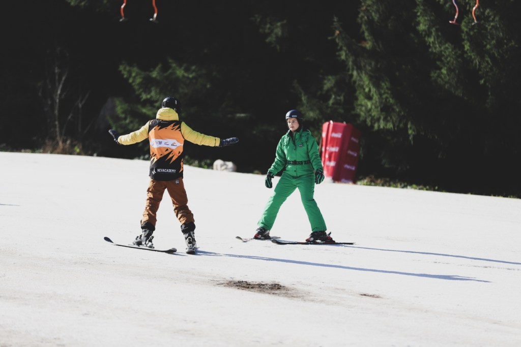 Asa ca anul acesta am reinceput si eu lectii de schiat. Am avut o tentativa micuta si anul trecut, insa Anastasia era foarte dependenta de mine la acel moment si nu am reusit sa ne descurcam sa stea fara mine cat aveam sa exersez eu. Asa ca am lasat-o pe anul acesta, cand lucrurile au fost infinit mai bune. De fapt, aveam lectiile in acelasi timp cu copiii. Ei alternat cu un instructor, eu singura cu instructorul meu. Am facut la aceeasi scoala de schi, Nevacademy, cu aceiasi instructori, Karina, Adi si Tudor. Karina a lucrat cu copiii, iar eu am facut cu Tudor. Nu am avut noroc de cea mai grozava vreme pentru schiat, era atat de cald ca nu puteam sta nici in costumele noastre (groase!) de schi iar partiile erau… pfoai, aproape lipsite de zapada. Daaaar, erau cateva petice numai bune pentru un incepator. Iar faptul ca vremea a fost asa de calduroasa si zapada putina, a descurajat multa lume sa vina la munte in perioada in care am fost noi. Deci… nu am stat la cozi la teleschi, absolut deloc chiar, am mers incontinuu pe partie (nu degeaba am avut 64 de ture de teleschi in patru zile) si nu a fost deloc aglomerat, eram aproape singurii pe partie (ceea ce pe mine m-a ajutat enorm sa vindec un pic trauma din Bansko). Si chiar daca pe moment ni se parea ca poate ca ar fi fost mai bine sa amanam aceasta venire la munte, gandindu-ne ca efectiv vom merge degeaba, in final chiar am simtit ca a fost infinit mai bine sa fie asa cald. Faceam noi pe vitejii dar am uitat de gerurile indurate cu un an inainte, cand foloseam tot felul de variante de a ne incalzi (si pe noi si pe copii). Macar acum nu a fost nici vorba de asa ceva, de multe ori copiii schiau fara manusi si cu combinezoanele deschise. Am invatat bazele bazei, daca pot sa spun asa, dar pentru mine au fost niste victorii foarte importante 🙂 Cum sa imi car schiurile, cum sa le pun in picioare, cum sa folosesc teleschiul (marea mea panica), cum sa cobor partia in diagonale, cum sa fac plugul, cum sa mut greutatea de pe un picior pe altul, cum sa virez. Evident ca invatand toate lucrurile acestea la 37 de ani mi-a fost foarte greu sa asimilez sau sa ma bucur de ce invatam. Eu tind sa analizez excesiv orice informatie primesc si sa incerc sa aplic ca la carte orice recomandare. Asa ca multe dintre coborarile mele erau tensionate si incordate si ma gandeam incontinuuuuu la ce am de facut si cum sa fac cat mai bine. Abia spre finalul vacantei mi-am impus sa nu ma concentrez atat de mult pe tehnica ci doar pe a ajunge intr-un fel sau altul in capatul partie. Si abia atunci m-am bucurat realmente de o coborare si de micul progres pe care fie ca il constientizam sau nu, il faceam 🙂