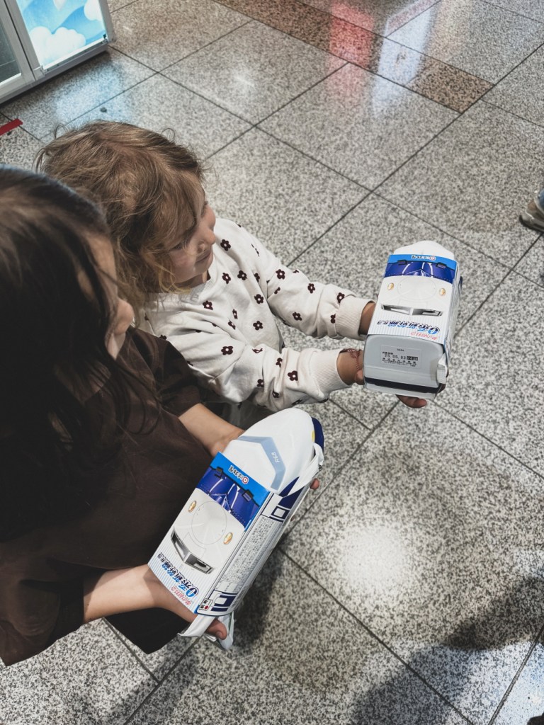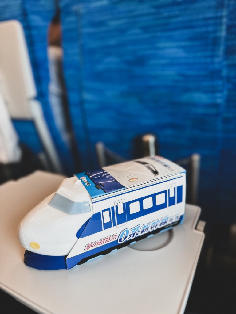 Citisem ca in Shinkansen putem manca (spre deosebire de alte mijloace de transport unde mancatul nu este permis) si ca este o adevarata nebunie cu asa numitele bento boxes, cutii cu mancare (foarte buna de altfel). Dar partea cea mai draguta pentru copii e ca exista niste bento boxes in forma de tren Shinkansen! Am avut norocul sa gasim ultimele trei astfel de cutii si a fost mare bucurie pentru copii. Le-au si pastrat ca suveniruri. Drumul dintre Kyoto si Tokyo a durat doua ore, a fost o calatorie foarte usoara si placuta. Biletele le-au luat cu o luna inainte (si bine am facut, fiind Golden Week trenul a fost full, niciun loc liber). Si am avut un noroc fantastic de vreme buna, insorita, asa ca am vazut Muntele Fuji (mare lucru, pentru ca se arata destul de rar).