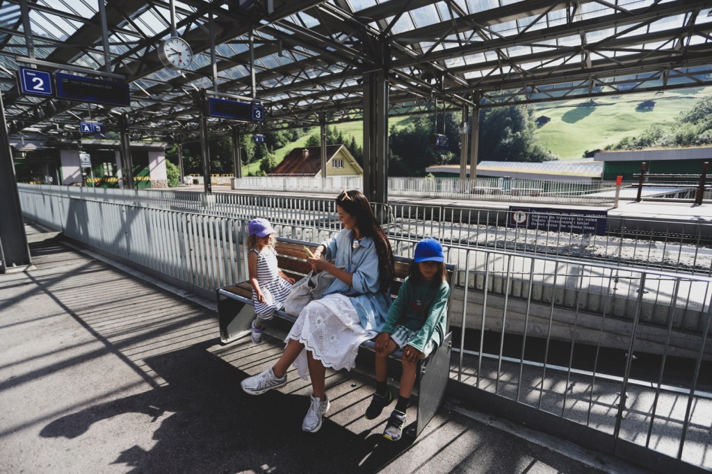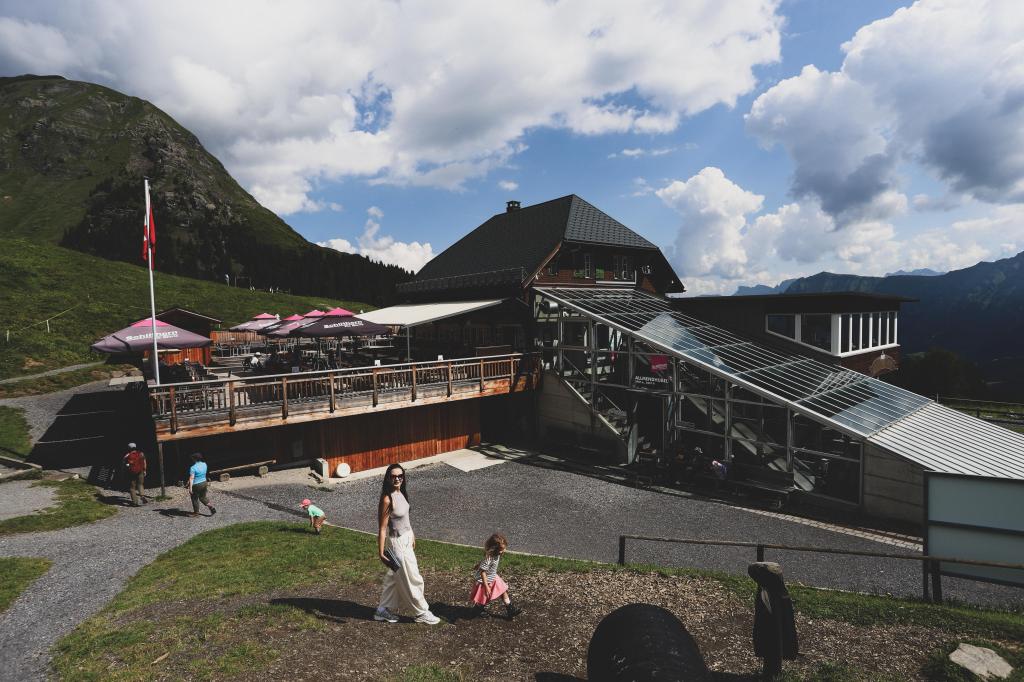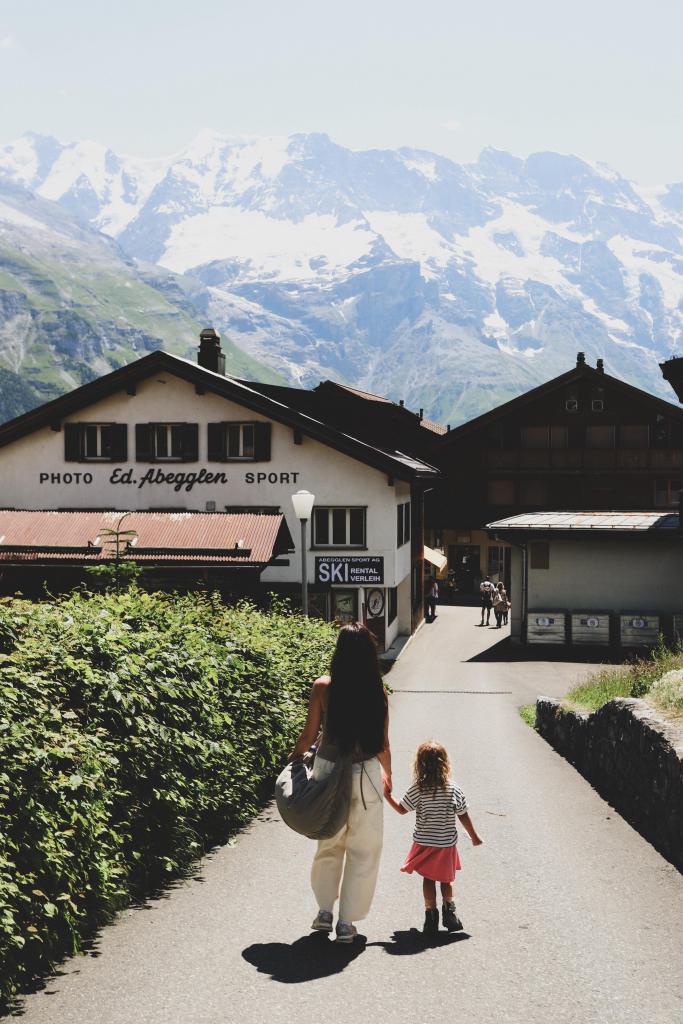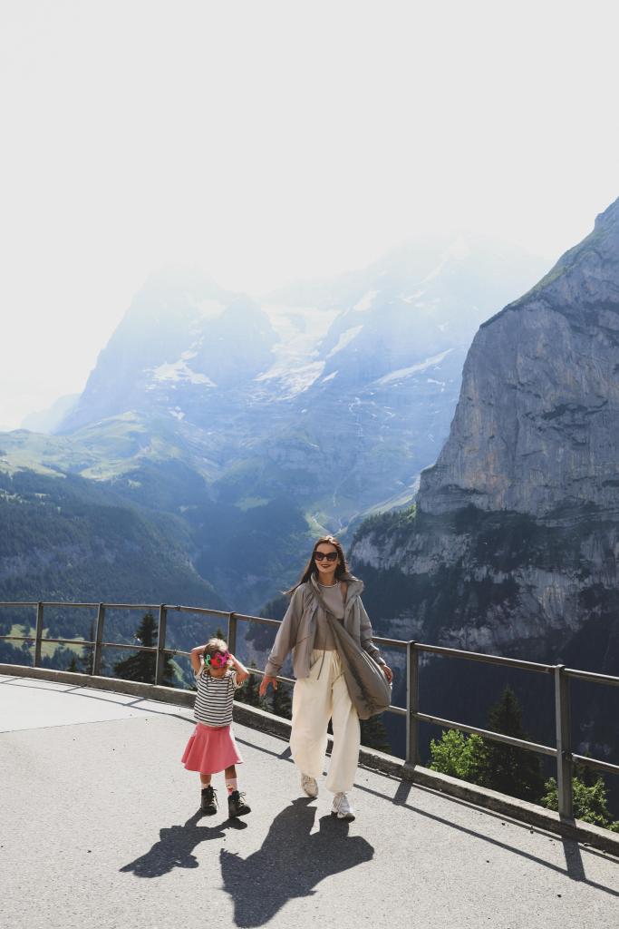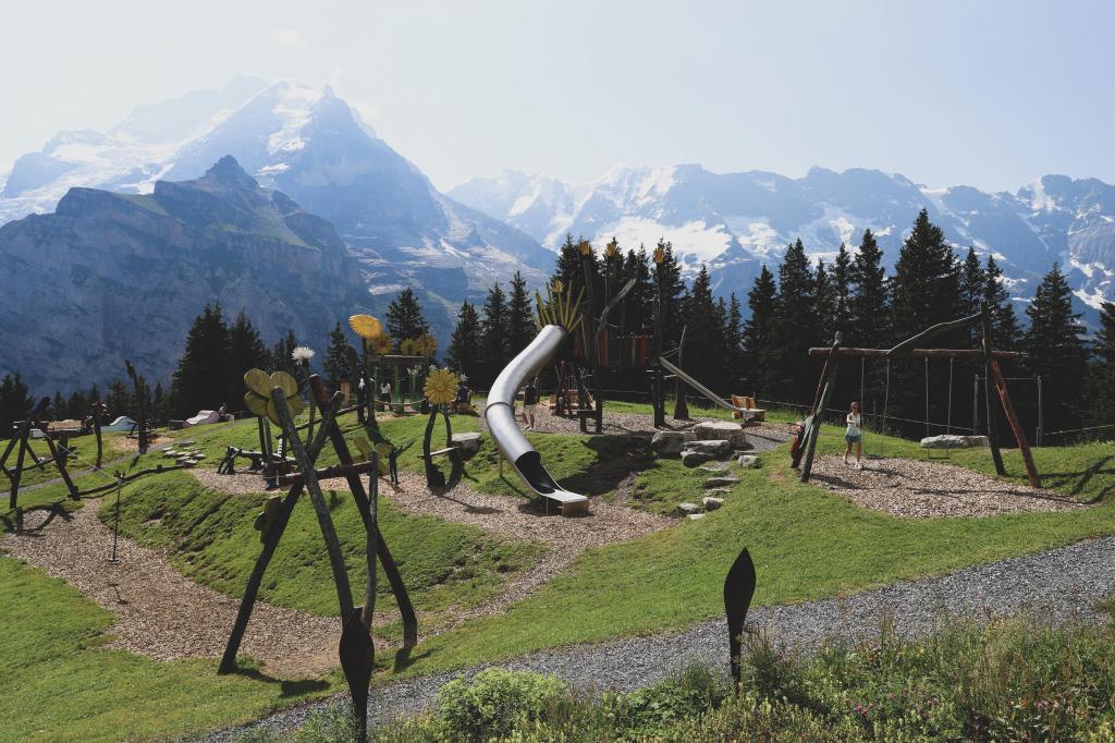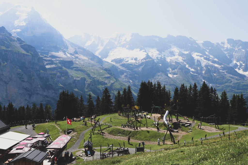 De la capatul telecabinei se ia trenul din statia Grutschalp pana in Murren (si drumul in sine e superb, trece prin munti, privelistile sunt minunate!). Murren este un satuc mic, cu multe pensiuni (chalet-uri traditionale) si hoteluri cu priveliste catre munti, de unde se pot face diverse alte trasee sau excursii: catre Piz Gloria (de unde pare-se ca s-ar putea vedea Mont Blanc-ul, daca vremea e foarte buna si vizibilitatea perfecta), catre satul Gimmewald (la fel ca Murren, sat in care nu circula masini), catre Birg (pentru plimbare pe platforma Thrill Walk), sau catre Allmendhubel, preferat de familiile cu copii. Asta am ales si noi de altfel, sa urcam cu funicularul si sa ne oprim la locul de joaca superb de sus, de la 1907m inaltime. Parintii au stat la restaurantul Panorama, copiii s-au jucat la locul de joaca. Restaurantul este foarte popular, l-am prins plin, are o terasa imensa si o priveliste superba catre munti. Am mancat (din nou) rosti, am facut o mica pasiune pentru acest fel de mancare in Elvetia.