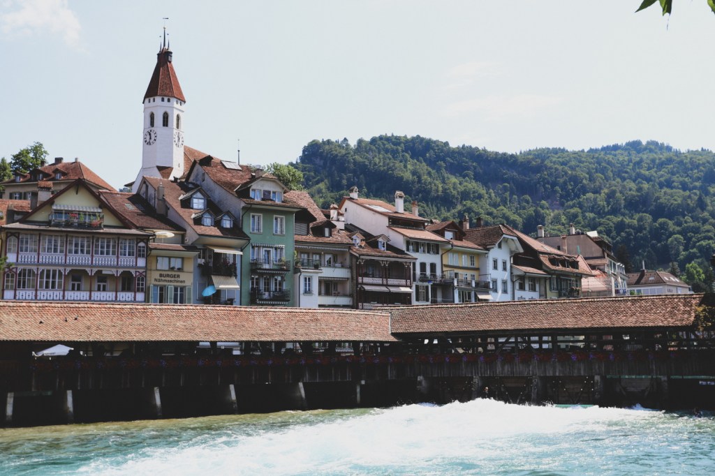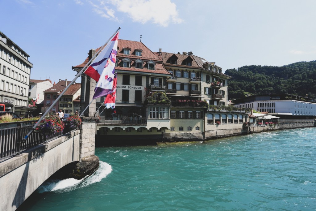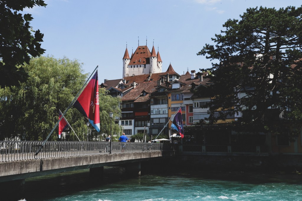 Cat despre Thun… ei bine, Thun este considerat unul dintre cele mai frumoase orasele elvetiene, cu un centru vechi foarte frumos, cu poduri de lemn, canale cu apa turcoaz si un castel impresionant deasupra orasului. Ne-am oprit sa vedem surferii de pe canal la Fusswelle (in traducere “river wave”), langa frumosul pod de lemn Obere Schleuse, decorat cu flori. Acesta este si pod, si ecluza in acelasi timp, datorita lui se controleaza nivelul apei. Pare bizar sa se practice surf intr-un oras in Elvetia insa… apa lacului Thun coboara cu putere inspre raul Aare (pare ca acesta e cel mai lung rau din Elvetia), pe care se afla orasul Thun, si reuseste sa creeze niste valuri perfecte pentru exersat surf.