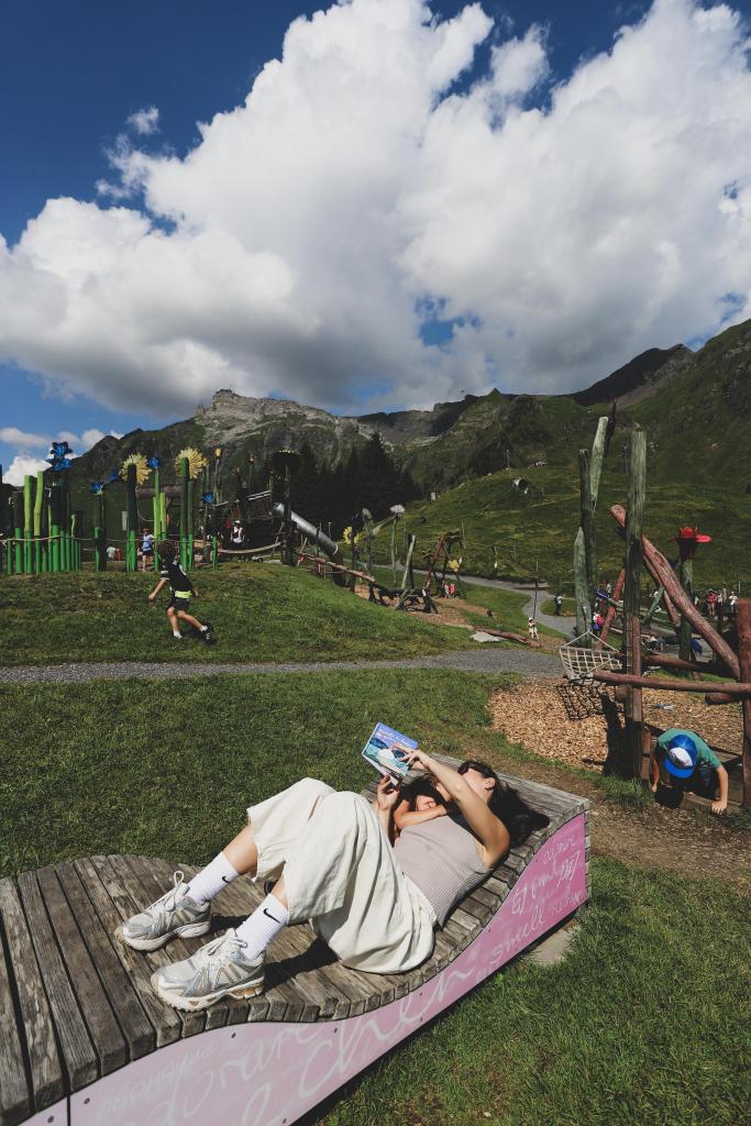Locurile de joaca din Elvetia mi se par un paradis pentru copii. Fara plastice colorate, fara Mickey Mousi, Else si alte personaje. Doar lemn, sfori, tuneluri prin pamant, tiroliene, stropitori, integrate in peisajul muntilor in cel mai firesc mod cu putinta. Cu mult spatiu, mult loc de alergat si zbenguit si tot felul de “instalatii” care ii tenteaza pe copii la cat mai multa miscare. Locurile de joaca elvetiene sunt destinatii in sine! Poti sa alegi sa vezi Jungfraujoch, ori poti sa vii la Allmendhubel la loc de joaca, amandoua sunt impresionante! Prin urmare… si noi am petrecut mai bine de jumatate de zi la Allmendhubel, copiii nu se mai lasau plecati de acolo. Am prins o zi extrem de calduroasa asa ca labirintul cu flori care stropesc apa era deschis. A fost principala atractie a zilei, copiii s-au distrat si udat leoarca 🙂