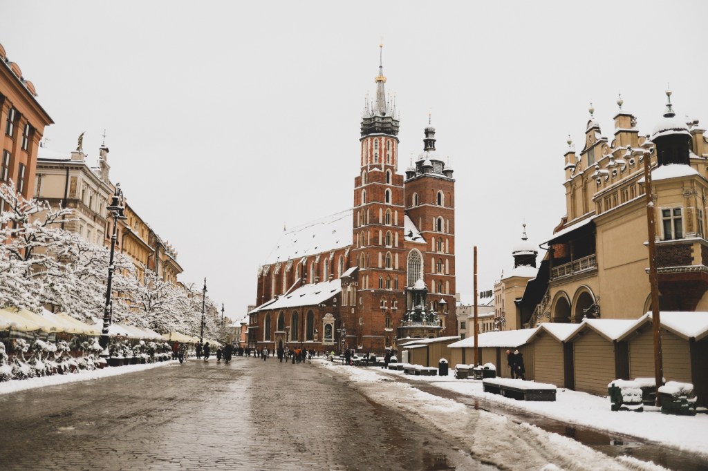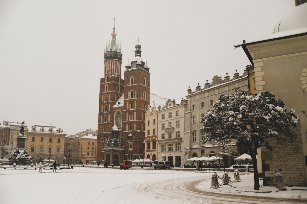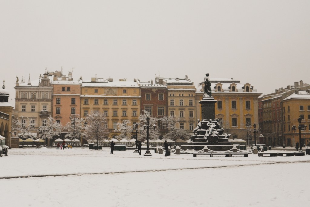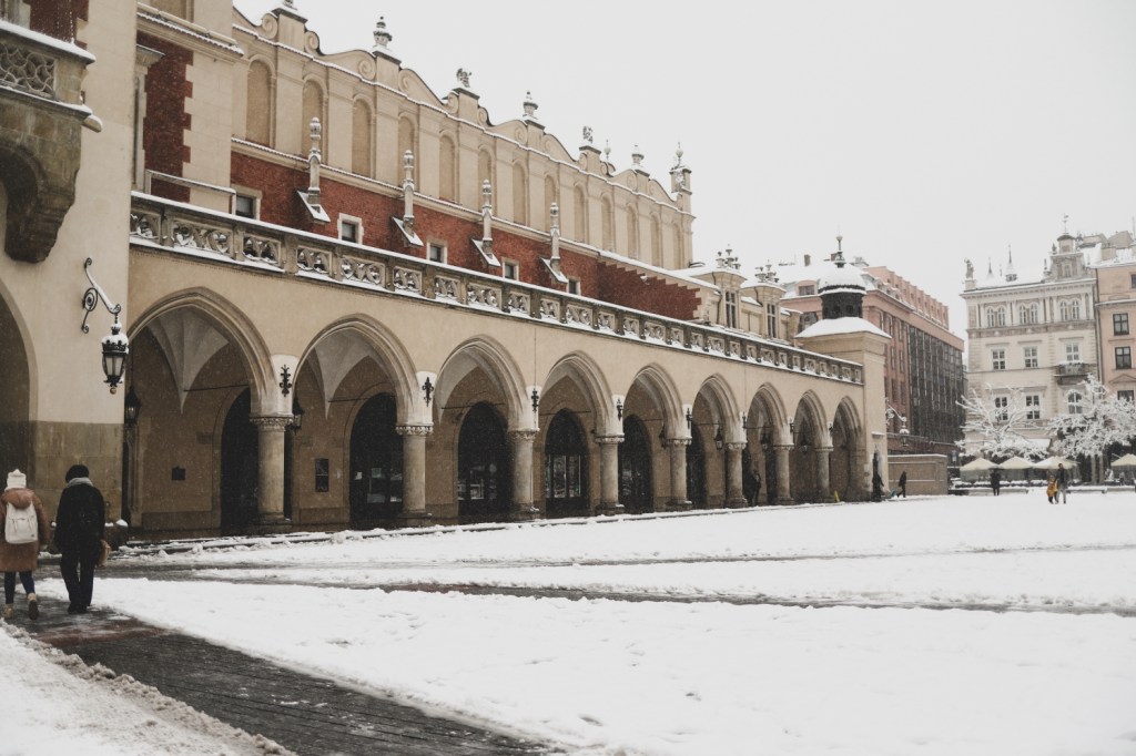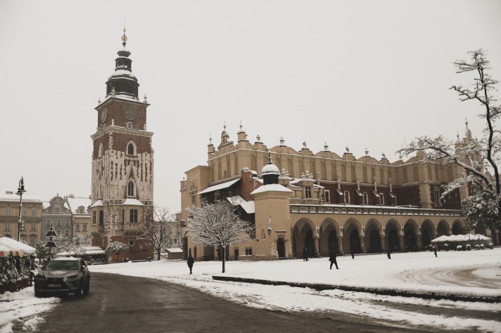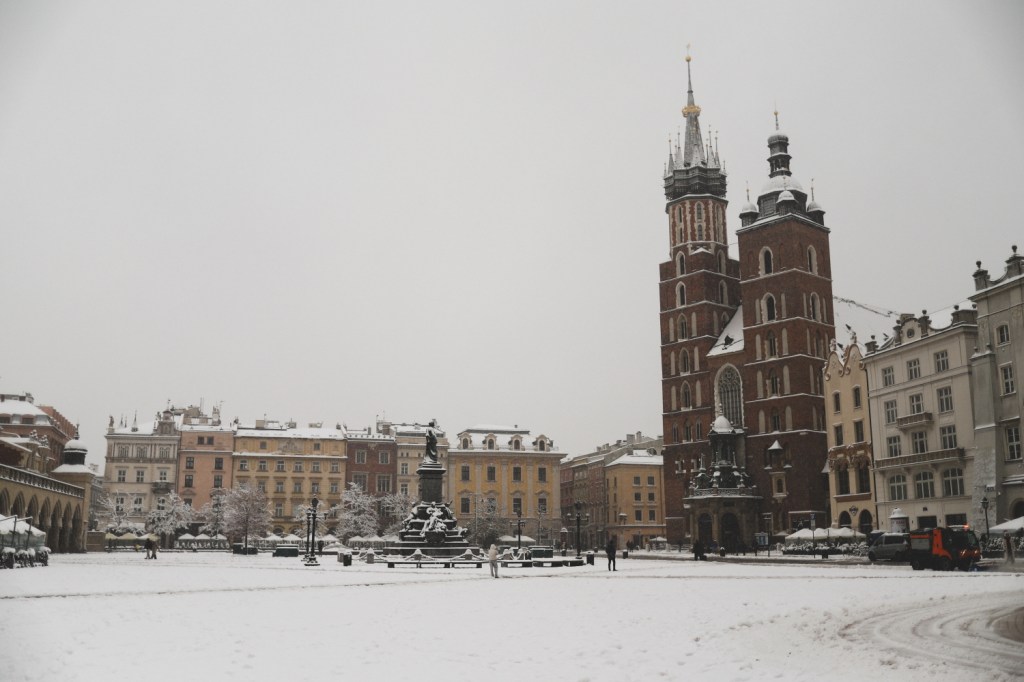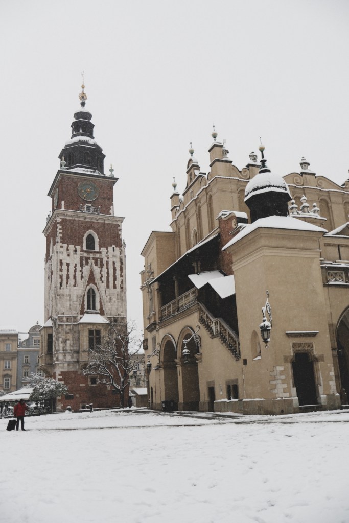 Ne-am dus apoi din nou in piata centrala Rynek Glowny ca sa o vedem si pe timp de zi. Stiam ca ne va impresiona din nou, cu toate cladirile dimprejur, cu bazilica si cladirea centrala, mai ales acum acoperite de zapada alba si proaspata. E minunata si cred ca are farmecul ei si ziua, cand se vad mai clar imprejurimile, dar si noaptea, cand este inundata de lumini, multa lume si multa forfota. Insa atunci, in dimineata acelei zile, inca foarte devreme, fiind aproape doar noi in toata imensitatea aceea de piata, a fost magica. Aveam sa vedem in orele urmatoare cum se aglomereaza piata, cum apar grupurile de turisti, cum se topeste zapada si se transforma intr-o zloata neplacuta. Dar fix atunci, in primele ore ale zilei, cu piata adormita, zapada neatinsa si doi-trei oameni in jurul nostru… a fost magic!