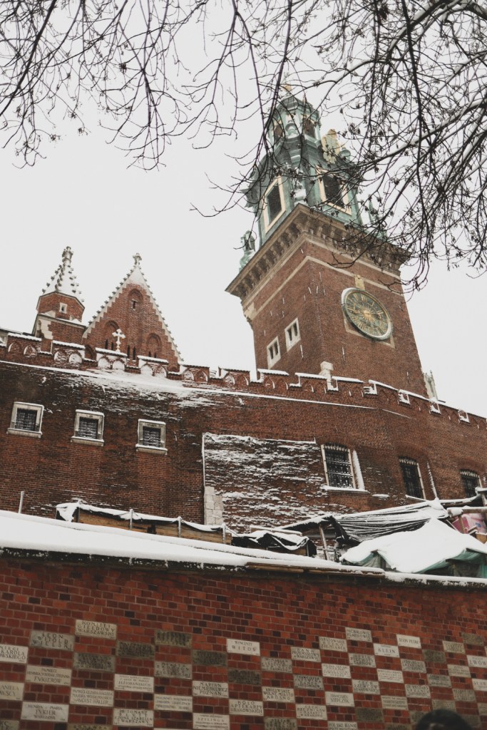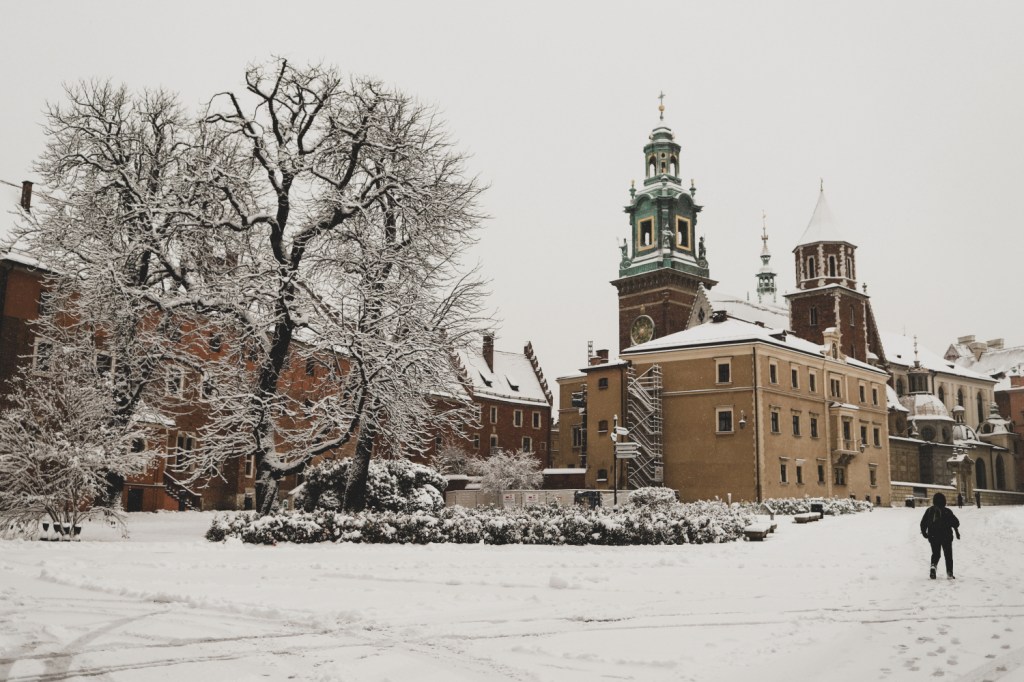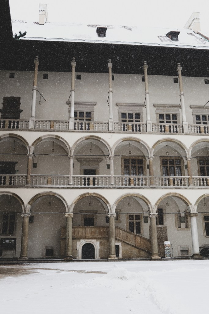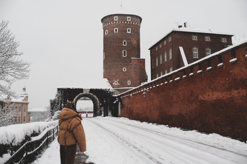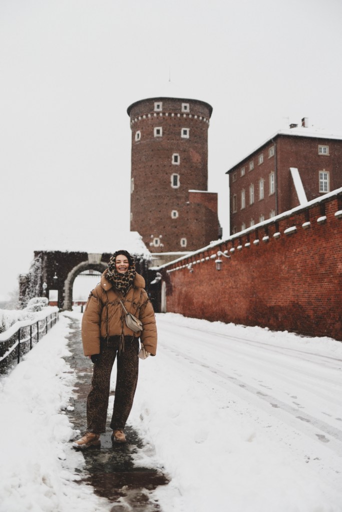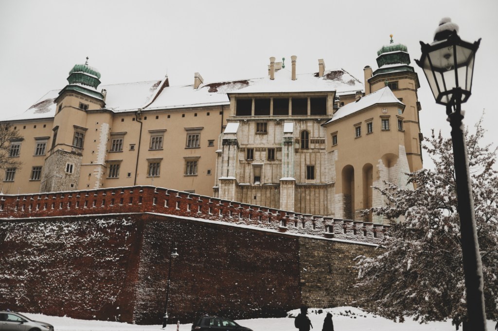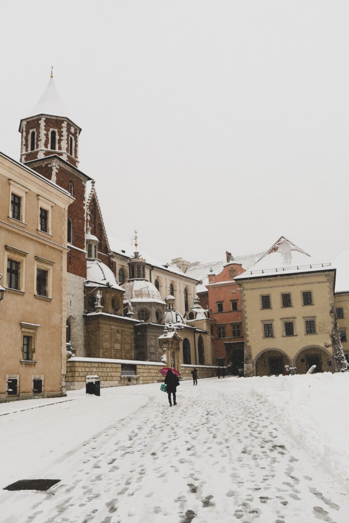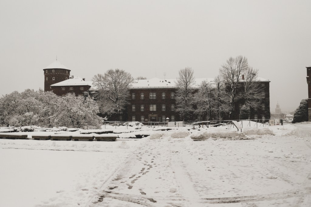 Plecarea asta in Cracovia a fost pe repede inainte. Stiam ca nu aveam mult timp la dispozitie asa ca in dimineata zilei de duminica ne-am propus sa ne trezim devreme (mai exact la 6 dimineata). Dar nu ca sa bananaim pe strazi cu noaptea in cap ci ca sa prindem cursa de Formula 1 din Las Vegas (mai bine n-o vedeam avand in vedere rezultatul si penalizarea lui Norris, haha). Era noapte bezna afara cand am tras draperia si chiar daca stiam ca avea sa ninga toata noaptea, nu ne-a venit sa credem cata zapada se depusese deja! Era un strat de cativa centimetri generosi si inca ningea mult, ca in povesti! Cand am iesit din hotel zapada era inca neatinsa (am iesit la 8 dimineata), orasul era inca adormit si parca nu mai era asa de frig ca seara de dinainte. Nu mai batea vantul insa ningea superb! Ne-am dus catre dealul Wawel sa vedem castelul si catedrala, care se aflau foarte aproape de hotel, trebuia doar sa traversam podul peste raul Vistula. Scurta paranteza, daca am fi venit in Cracovia pe timp de vara (din mai pana in septembrie, am fi intalnit pe raul Vistula si asa numitul Krakow Water Tram, un feribot care are opriri in diferite puncte ale orasului, ca o mica croaziera pe apa – tinem minte pentru cand vom reveni pe vreme calda!).