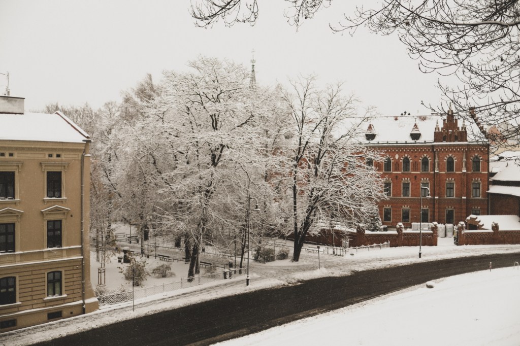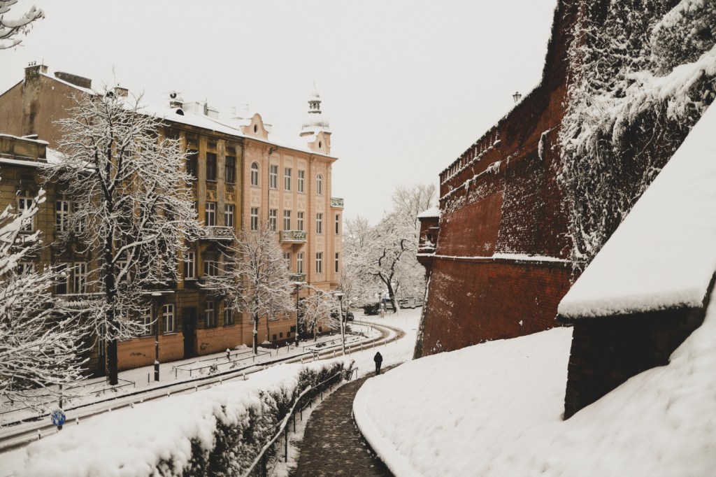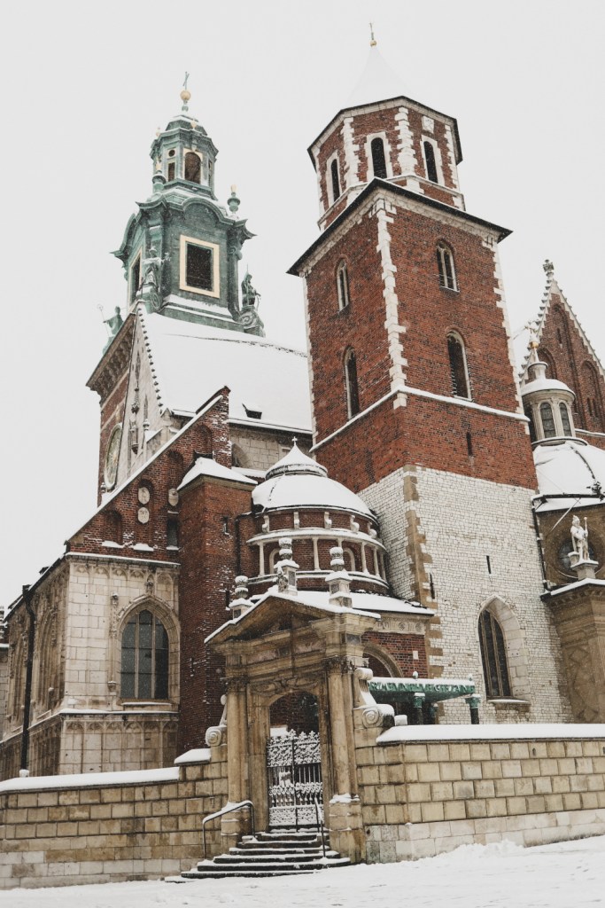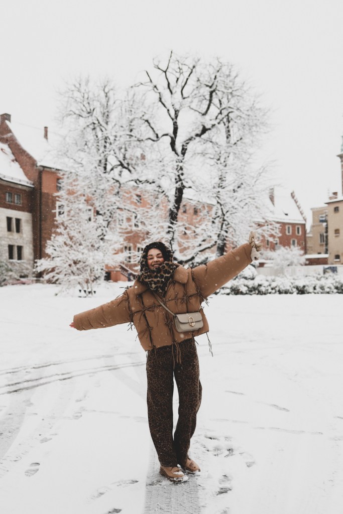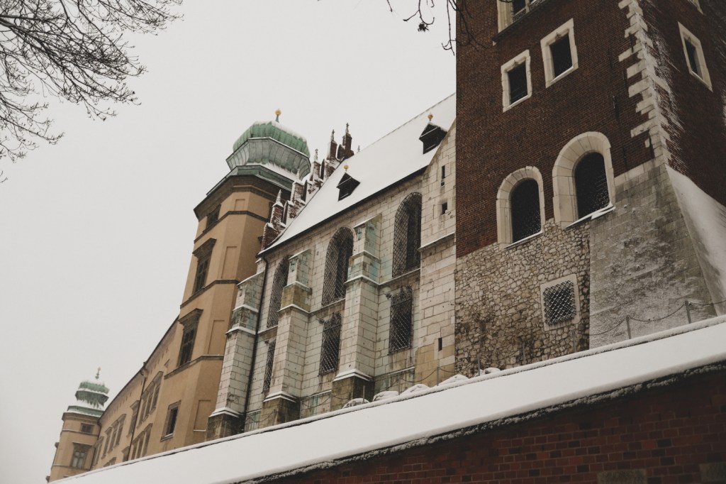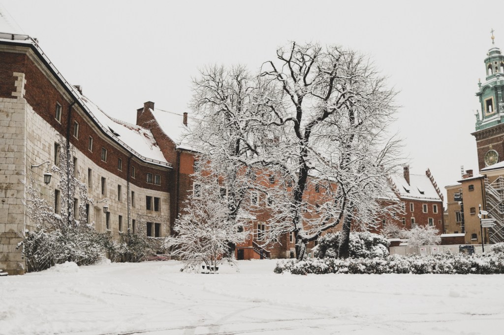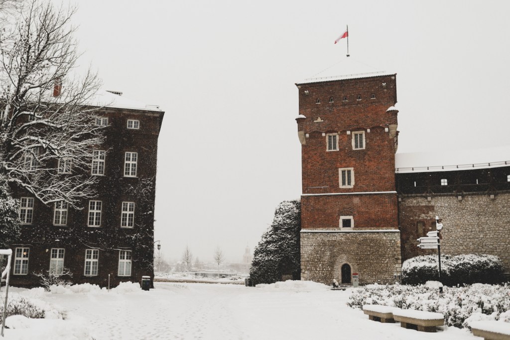 Plecarea asta in Cracovia a fost pe repede inainte. Stiam ca nu aveam mult timp la dispozitie asa ca in dimineata zilei de duminica ne-am propus sa ne trezim devreme (mai exact la 6 dimineata). Dar nu ca sa bananaim pe strazi cu noaptea in cap ci ca sa prindem cursa de Formula 1 din Las Vegas (mai bine n-o vedeam avand in vedere rezultatul si penalizarea lui Norris, haha). Era noapte bezna afara cand am tras draperia si chiar daca stiam ca avea sa ninga toata noaptea, nu ne-a venit sa credem cata zapada se depusese deja! Era un strat de cativa centimetri generosi si inca ningea mult, ca in povesti! Cand am iesit din hotel zapada era inca neatinsa (am iesit la 8 dimineata), orasul era inca adormit si parca nu mai era asa de frig ca seara de dinainte. Nu mai batea vantul insa ningea superb! Ne-am dus catre dealul Wawel sa vedem castelul si catedrala, care se aflau foarte aproape de hotel, trebuia doar sa traversam podul peste raul Vistula. Scurta paranteza, daca am fi venit in Cracovia pe timp de vara (din mai pana in septembrie, am fi intalnit pe raul Vistula si asa numitul Krakow Water Tram, un feribot care are opriri in diferite puncte ale orasului, ca o mica croaziera pe apa – tinem minte pentru cand vom reveni pe vreme calda!).