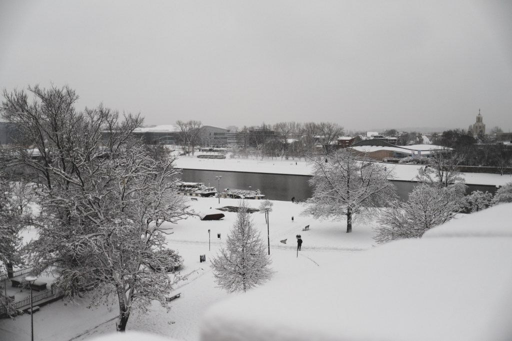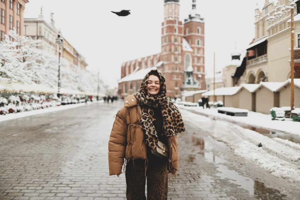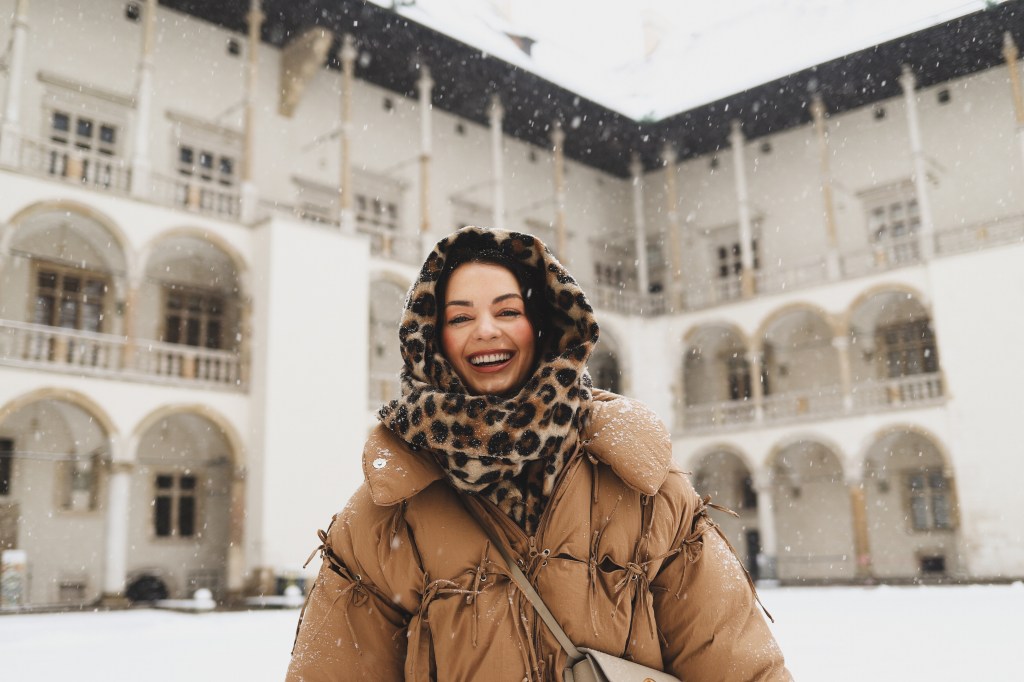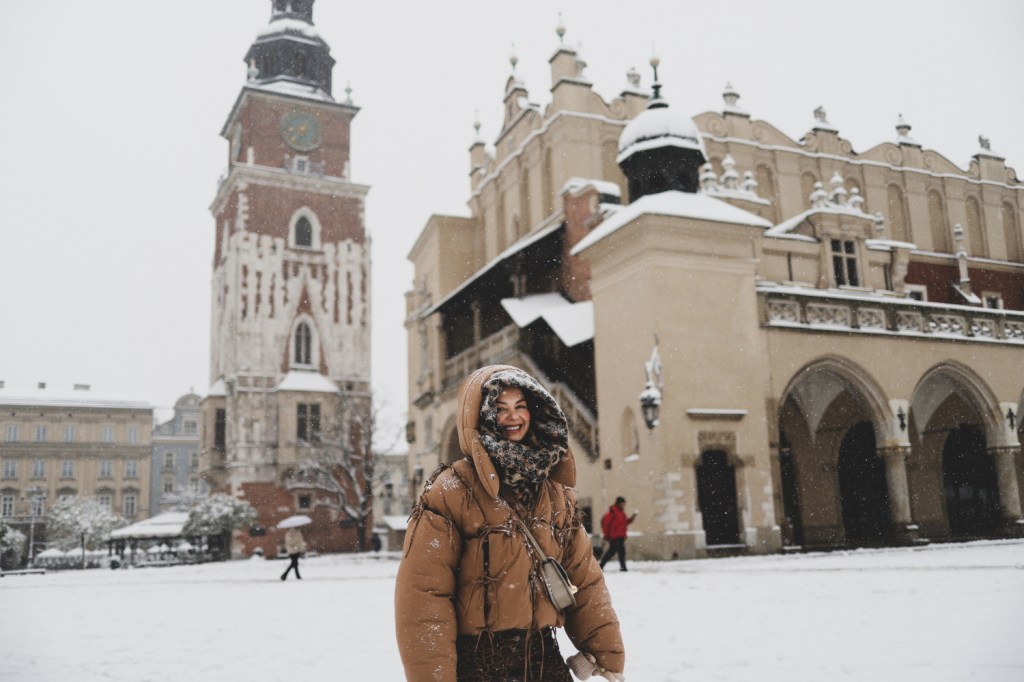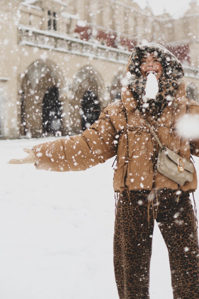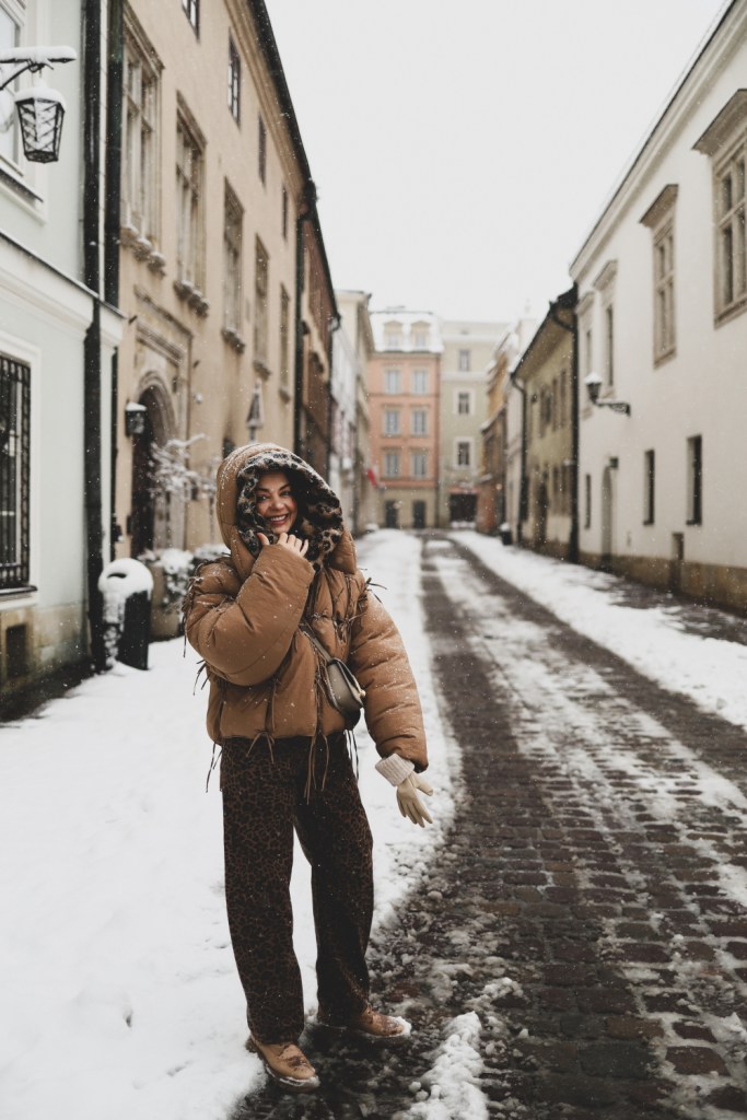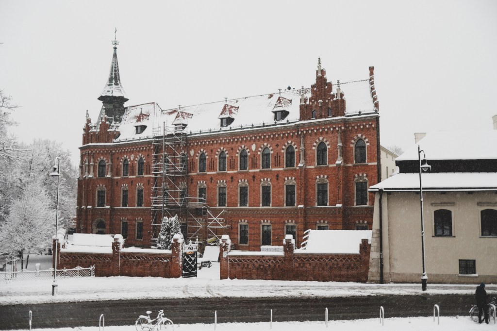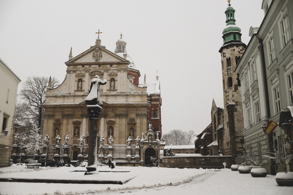 Plecarea asta in Cracovia a fost pe repede inainte. Stiam ca nu aveam mult timp la dispozitie asa ca in dimineata zilei de duminica ne-am propus sa ne trezim devreme (mai exact la 6 dimineata). Dar nu ca sa bananaim pe strazi cu noaptea in cap ci ca sa prindem cursa de Formula 1 din Las Vegas (mai bine n-o vedeam avand in vedere rezultatul si penalizarea lui Norris, haha). Era noapte bezna afara cand am tras draperia si chiar daca stiam ca avea sa ninga toata noaptea, nu ne-a venit sa credem cata zapada se depusese deja! Era un strat de cativa centimetri generosi si inca ningea mult, ca in povesti! Cand am iesit din hotel zapada era inca neatinsa (am iesit la 8 dimineata), orasul era inca adormit si parca nu mai era asa de frig ca seara de dinainte. Nu mai batea vantul insa ningea superb! Ne-am dus catre dealul Wawel sa vedem castelul si catedrala, care se aflau foarte aproape de hotel, trebuia doar sa traversam podul peste raul Vistula. Scurta paranteza, daca am fi venit in Cracovia pe timp de vara (din mai pana in septembrie, am fi intalnit pe raul Vistula si asa numitul Krakow Water Tram, un feribot care are opriri in diferite puncte ale orasului, ca o mica croaziera pe apa – tinem minte pentru cand vom reveni pe vreme calda!).