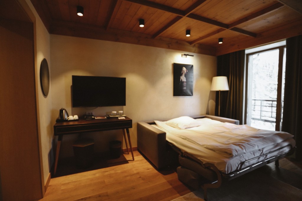 Noi am ales mereu sa stam la Bradul, ni s-a parut atat de primitor inca de prima oara cand am fost, si ne-am simtit atat de bine in linistea aceea, incat nu am simtit nevoia sa schimbam nimic. An de an, in cei patru ani de cand tot venim in Poiana, am ales sa venim aici. Fiind patru (si acum copiii destul de mari incat sa nu mai putem dormi toti in acelasi pat) avem nevoie de o camera mai mare. Mi se pare din ce in ce mai greu de gasit in hoteluri camere potrivite pentru familii cu copii nu tocmai mici (dar nici mari cat sa fie justificate doua camere duble). La Bradul exista o camera mare, cu pat dublu si canapea extensibila (care se transforma intr-un pat dublu), pentru noi aceasta a fost cea mai buna alegere ca spatiu (camera se numeste Kind Deluxe Balcony Room).