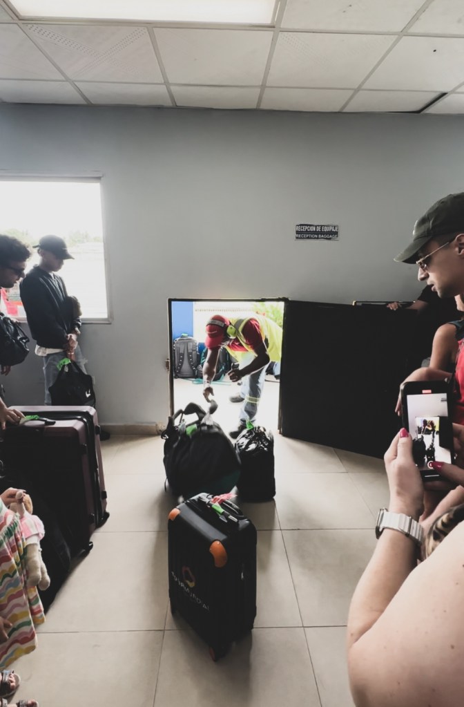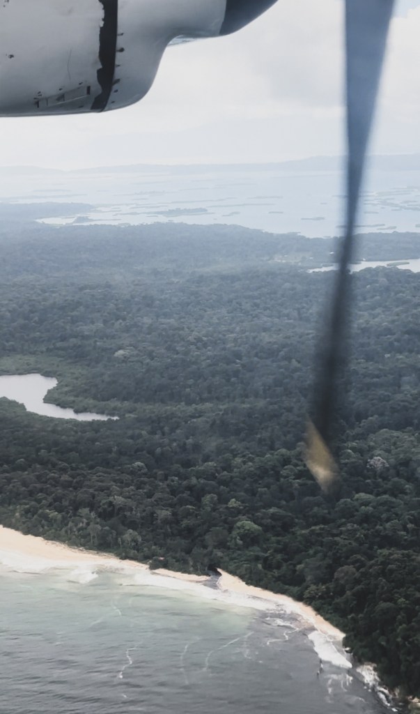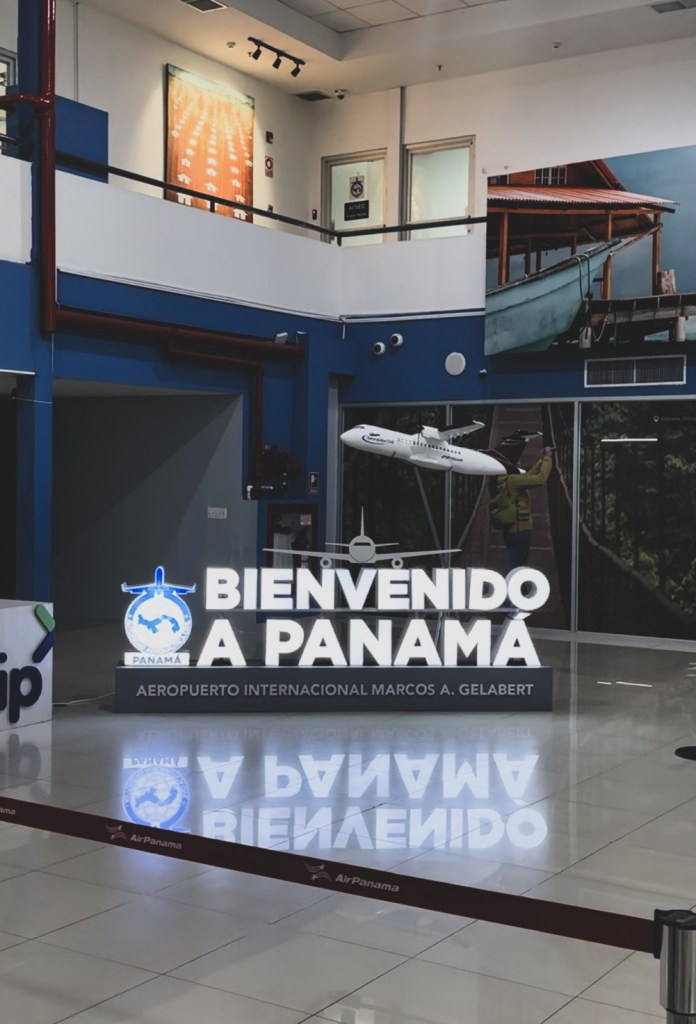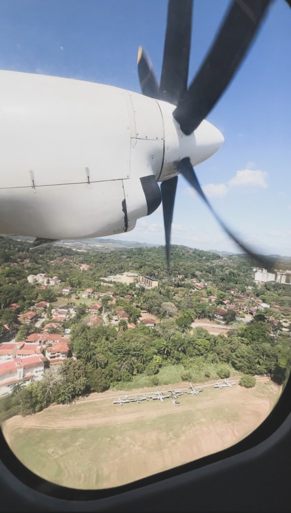 Nu am zburat de pe aeroportul principal din Panama City, Tocumen International Airport, ci de pe un aeroport oentru zboruri interne, mult mai mic – Albrook Gelabert Airport. Am aranjat un transfer pentru toti de la hotelul Plaza Paitilla Inn catre aeroport (30 USD pentru toti 11), pentru ca ni s-a parut mai comod asa. Am fi putut sa luam fiecare cate un Uber si cel mai probabil ar fi fost mult mai ieftin (cam 3 USD de masina, atat de ieftin e!) insa am preferat sa mergem cu totii, impreuna. Aeroportul e foarte mic, etichetele de bagaje se scriu de mana cu markerul si sunt impinse manual la avion (nu exista banda de bagaje), este un singur punct de control de pasapoarte si doua benzi de control de securitate. Chiar daca ni se schimbase ora de zbor (cu doua ore mai tarziu, aveam zborul de 7:45 dar in final a fost reprogramat la 9:45), tot am avut intarziere in plus :))) In Panama oamenii nu se grabesc. Cel putin cei din aeroport sigur nu :)) Asa ca am decolat pe la 10:30, daca nu chiar mai tarziu de atat. Am zburat cu un avion Fokker 50, cu elice si cu 50 de locuri pentru pasageri. Aveam impresia ca va fi mult mai micut, insa parea foarte similar cu ATR-urile Taromului 🙂