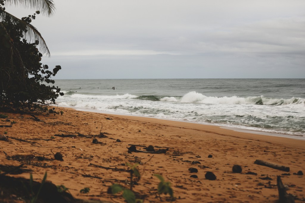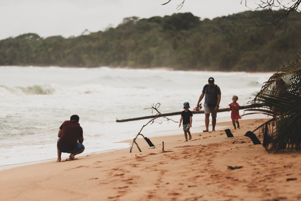 Cazarea ne-a placut ENORM. Nu era o cazare luxoasa, nu, nicidecum, dar arata extrem de bine. Modesta dar frumoasa, in mijlocul naturii, exact asa cum ne-am imaginat si am sperat sa gasim in Panama. Casa era destul de mare (patru camere cu bai separate) si un living foarte mare, comun, cu bucatarie deschisa si terasa, o gradina uriasaaaaa in care se tot jucau si alergau copiii si o piscina mare (cu apa rece ce-i drept, dar la cat de cald era in timpul zilei nu era foarte deranjant). Pretul casei pentru toata perioada (4 nopti, 3 familii) a fost 1700 euro, deci aproximativ 150 euro de familie pe noapte. Ca sa ajungem la plaja era suficient sa traversam drumul acesta de nisip si gata 🙂 Insa desi plaja Bluff (cea in dreptul careia stateam noi) era foarte frumoasa, nu puteam intra in apa. Erau peste tot indicatoare de rip tides / olas asesinas (valuri ucigase) si curenti puternici asa ca am evitat sa ne apropiem prea mult (stateam si noi, si copiii, doar la marginea apei).