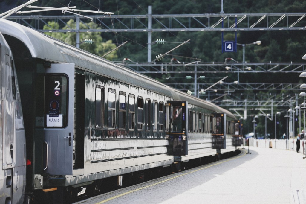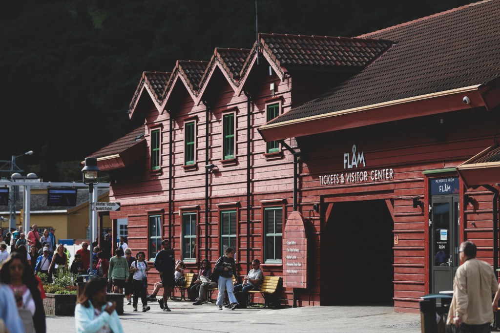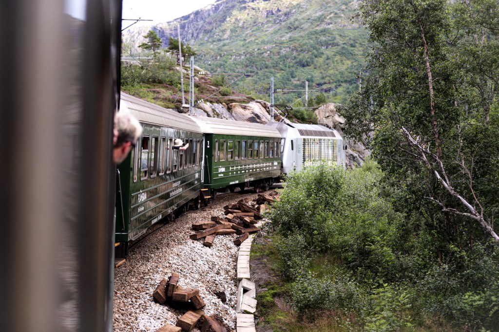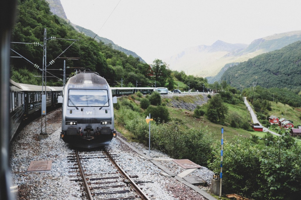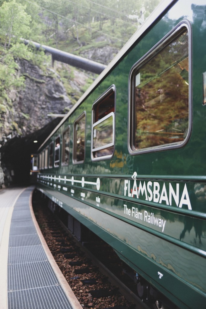 Dar am vrut sa impartim cele doua activitati in doua zile, lucru care ni s-a parut un pic mai intelept (avand in vedere si faptul ca eram destul de obositi si doua activitati atat de stimulante ar fi fost un pic cam mult si pentru noi, si pentru copii). In prima zi, chiar cand am ajuns in campingul Flam, am mers pana in centrul satucului si am luat bilete de tren Flamsbana pentru tot grupul, sa mergem impreuna. Este o calatorie foarte interesanta, prin niste peiaje absolut superbe! De fapt este considerata (si inclusa intr-un top facut de revista National Geographic Traveler) una dintre cele mai frumoase calatorii cu trenul din Europa 🙂 Nu dureaza foarte mult, aproximativ o ora dus si o ora intors (e o distanta de 13km intre cele doua statii dar e parcursa destul de incet), insa trece de la nivelul marii (satul Flam) pana la 867 metri inaltime (in satul/statia Myrdal), inaintand si urcand cu o inclinare accentuata pe tot parcursul calatoriei (se pare ca ar fi una dintre cele mai abrupte cai ferate din lume). Calea aceasta ferata a fost construita si de fapt deschisa publicului in anul 1923 si nu are doar scop turistic. In statia Myrdal exista o conexiune de tren, pe linia Bergen-Oslo, foarte folosita de altfel de turistii care calatoresc cu trenul in Norvegia.