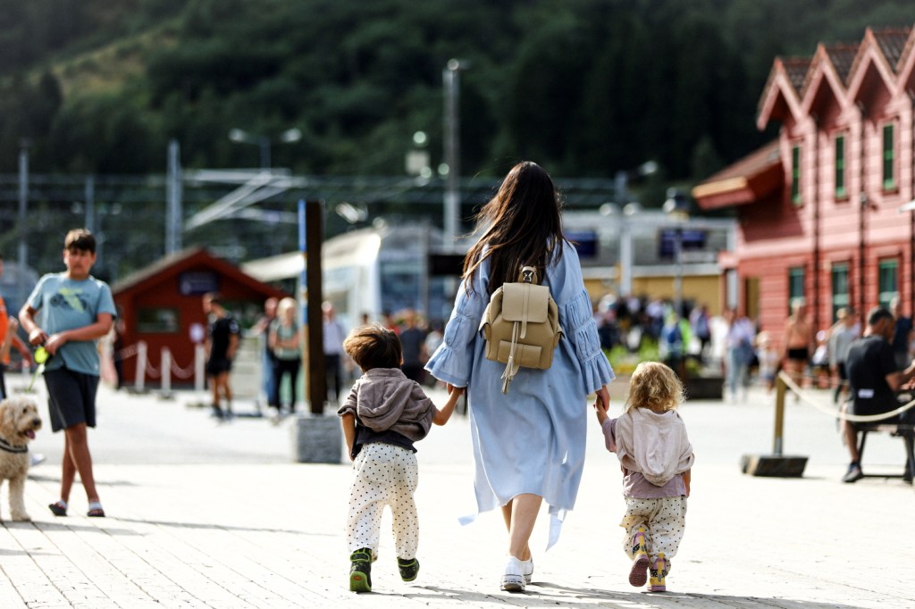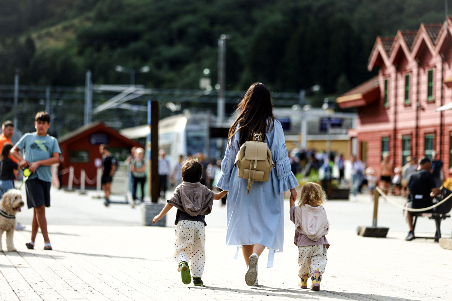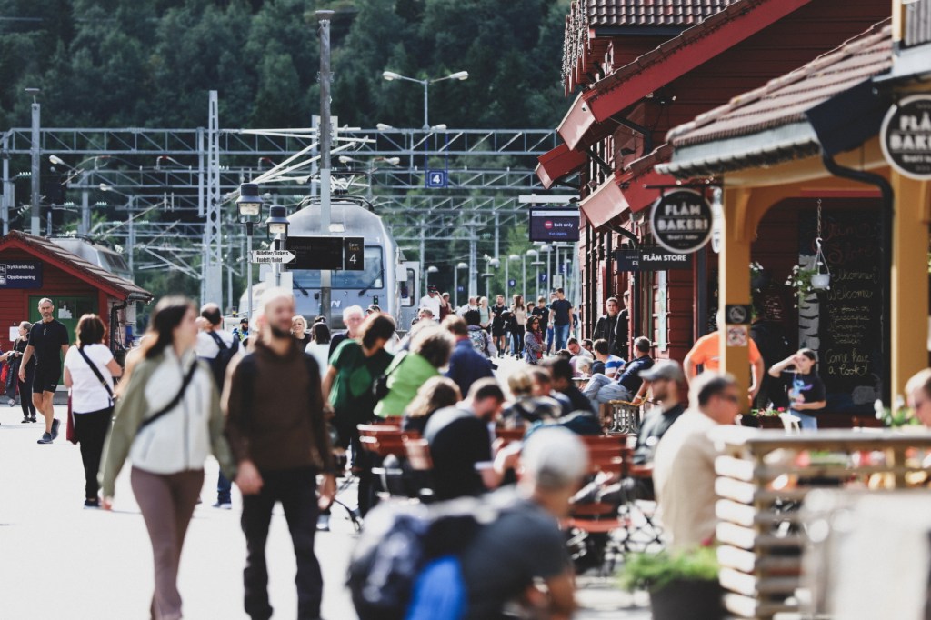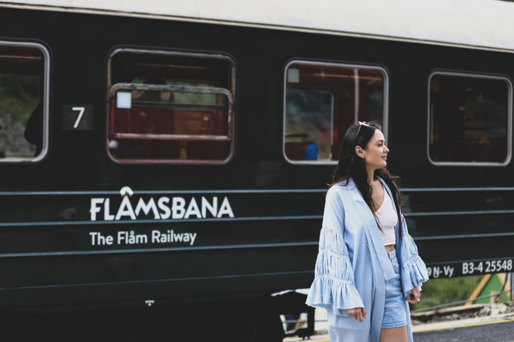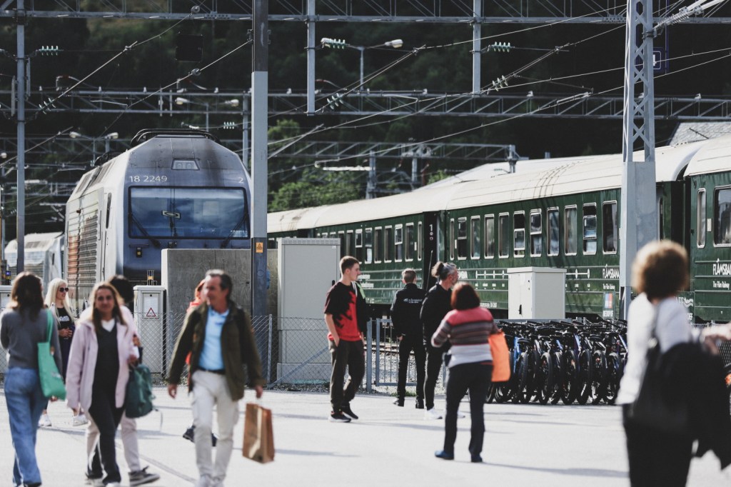 Dar am vrut sa impartim cele doua activitati in doua zile, lucru care ni s-a parut un pic mai intelept (avand in vedere si faptul ca eram destul de obositi si doua activitati atat de stimulante ar fi fost un pic cam mult si pentru noi, si pentru copii). In prima zi, chiar cand am ajuns in campingul Flam, am mers pana in centrul satucului si am luat bilete de tren Flamsbana pentru tot grupul, sa mergem impreuna. Este o calatorie foarte interesanta, prin niste peiaje absolut superbe! De fapt este considerata (si inclusa intr-un top facut de revista National Geographic Traveler) una dintre cele mai frumoase calatorii cu trenul din Europa 🙂 Nu dureaza foarte mult, aproximativ o ora dus si o ora intors (e o distanta de 13km intre cele doua statii dar e parcursa destul de incet), insa trece de la nivelul marii (satul Flam) pana la 867 metri inaltime (in satul/statia Myrdal), inaintand si urcand cu o inclinare accentuata pe tot parcursul calatoriei (se pare ca ar fi una dintre cele mai abrupte cai ferate din lume). Calea aceasta ferata a fost construita si de fapt deschisa publicului in anul 1923 si nu are doar scop turistic. In statia Myrdal exista o conexiune de tren, pe linia Bergen-Oslo, foarte folosita de altfel de turistii care calatoresc cu trenul in Norvegia.