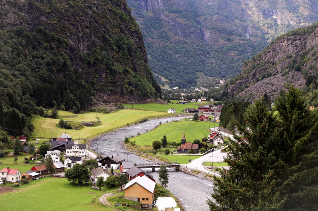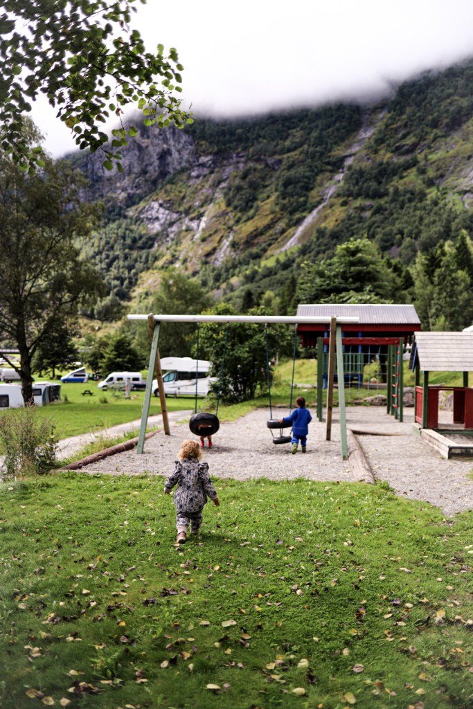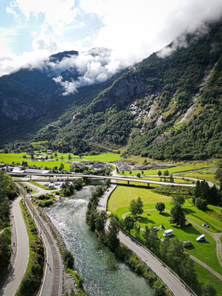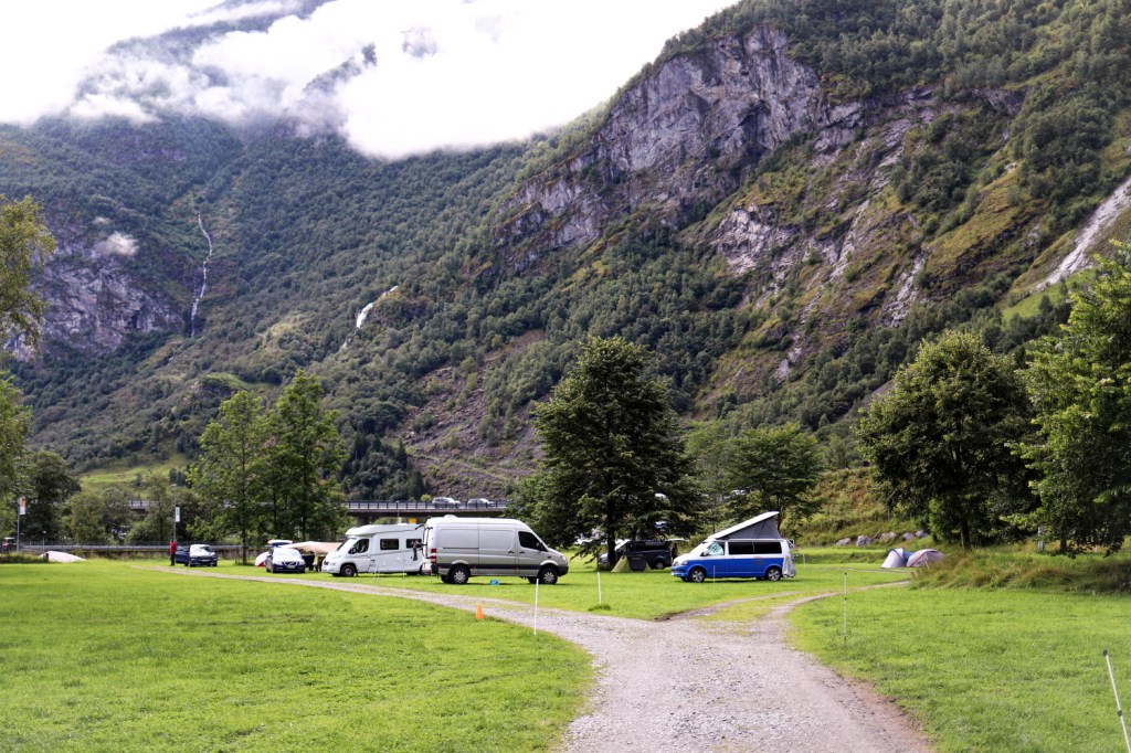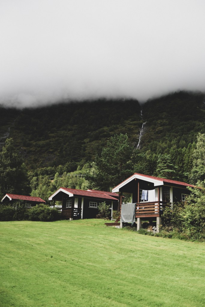 Asa ca nu stiu exact cand si cum, dar am ajuns in satucul Flam. Un sat in mijlocul fiordurilor, renumit pentru peisajele spectaculoase, pentru linia de tren Flamsbana si pentru croazierele pe fiordul Naeroyfjord. Si am campat chiar in campingul numit Flam Camping, vizavi de statia de tren Flamsbana, chiar in mijlocul satucului. Inconjurati de munti, de cascade si de ceata. Cred ca in toate aceste zile fix tipul acesta de camping am sperat ca vom gasi in Norvegia. Chiar daca si am mai stat in campinguri dragute pana in acel moment (Preikestolen Camping, Riis Feriepark in Danemarca), parca niciunul nu se potrivea cu imaginea pe care mi-o conturasem eu in minte despre campingurile din Norvegia. In natura, la baza muntilor, inconjurate de liniste si de sunetul apei cazand din cascade. Ei bine… campingul Flam a fost potrivirea perfecta de puzzle intre asteptari si realitate! Iar imprejurimile erau minunate, absolut minunate! Campingul este foarte mare si are locuri amenajate atat pentru autorulote, cat si pentru corturi, au zona de casute mici de lemn, precum si o cladire hostel. Nu ne-a lipsit absolut nimic in acest camping, am avut toate facilitatile de care am avut nevoie (curent, apa, dusuri, masini de spalat haine si uscator, zona amenajata pentru spalat vasele, loc de joaca pentru copii si chiar si un minivan cu pizza la intrare). Asa ca imediat cum am ajuns am hotarat cu totii sa ramanem doua nopti in acest camping. Pana in cea de-a zecea zi a fost un ritm destul de alert pentru noi, caruia i-am facut fata cu greu. Asa ca aceste doua zile de relaxare in Flam au venit ca o manusa, aveam nevoie de putina incetinire. Si ar fi fost chiar pacat sa nu stam mai mult aici, sa nu ne bucuram mai mult de tot ce vedeam in jur.