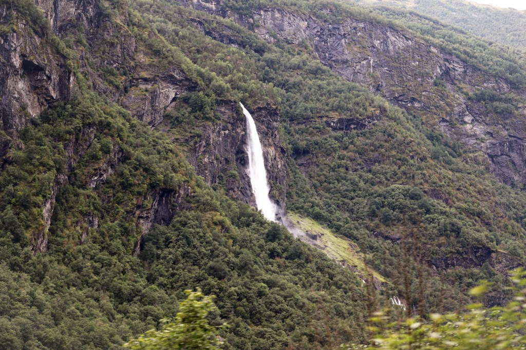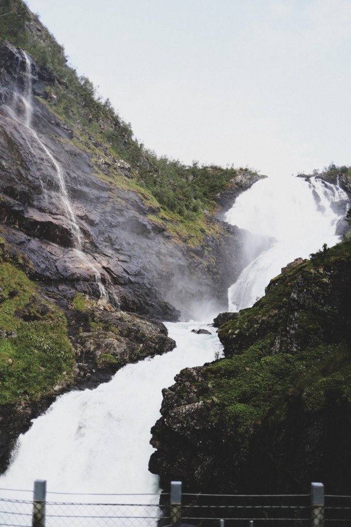 Cat despre privelistile vazute din trenul Flamsbana… sunt un spectacol! Trenul trece prin vai, tuneluri, pe marginea muntilor, pe langa cascade si satuce mici. In calatoria dus (catre statia Myrdal) se auzeau incontinuu numai exclamatii si “uau”-uri. Uaaau, ce cascada. Uau, ce drum intortocheat in varf de munte. Uau, ce satuc minuscul. Uau, ce tunel. O serie nesfarsita de “uau, uau, uau”. Fiind un grup atat de mare, am avut un vagon doar al nostru (in care am reusit sa facem haos, desigur :D), asa ca ne-a fost destul de usor sa ne mai schimbam locurile astfel incat fiecare sa poata vedea cat mai bine privelistea. Insa cred ca cea mai potrivita asezare ar fi cea de pe partea dreapta (plecand din Flam), sunt locurile cele mai bune, cu privelistile cele mai spectaculoase. Totusi, aproape de statia Myrdal, chiar inainte de a ajunge, trenul trece pe langa o minunatie de cascada (aflata pe partea stanga), numita Kjosfossen, inalta de 225 de metri. Unde de altfel a si oprit trenul, ca sa putem cobori putin pentru poze si admirat cascada. Chiar cand am ajuns se auzea si o muzica dramatica (am inteles ulterior ca era muzica din folclorul norvegian) iar undeva sus o doamna imbracata in rosu dansa pe acea muzica (am aflat ulterior ca era un spectacol al studentilor de la Scoala de Balet Norvegiana). Pare ca femeia o intruchipa pe Huldra, un spirit al padurii din mitologia scandinava, care ademenea si seducea barbatii 🙂 Din fericire, ai nostri baieti au rezitat farmecelor Huldrei si au continuat calatoria alaturi de noi, fara ademenire 😀 In orice caz, lasand gluma deoparte, a fost un moment foarte frumos si impresionant.