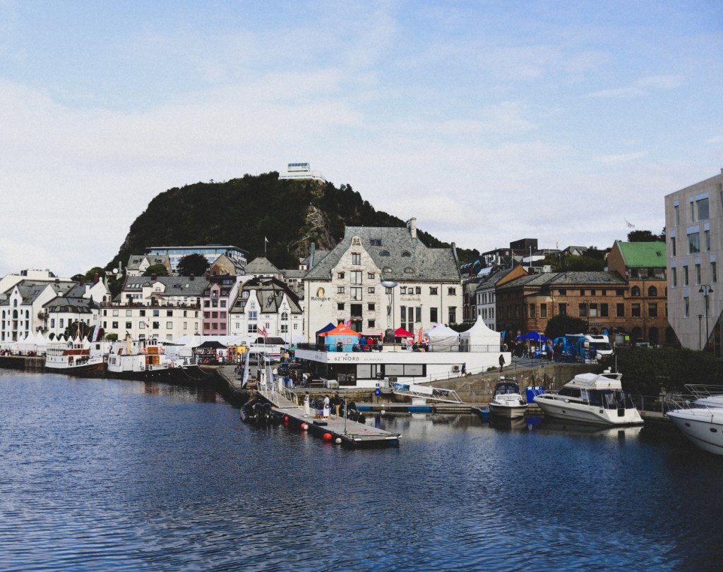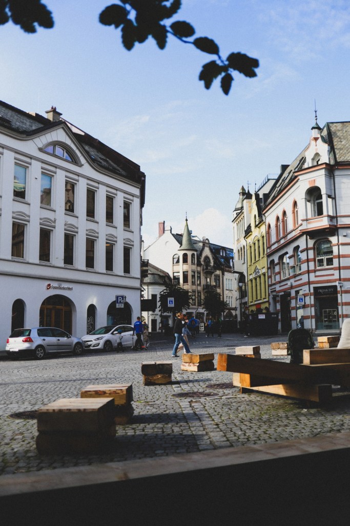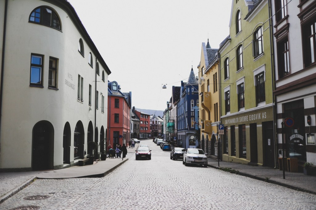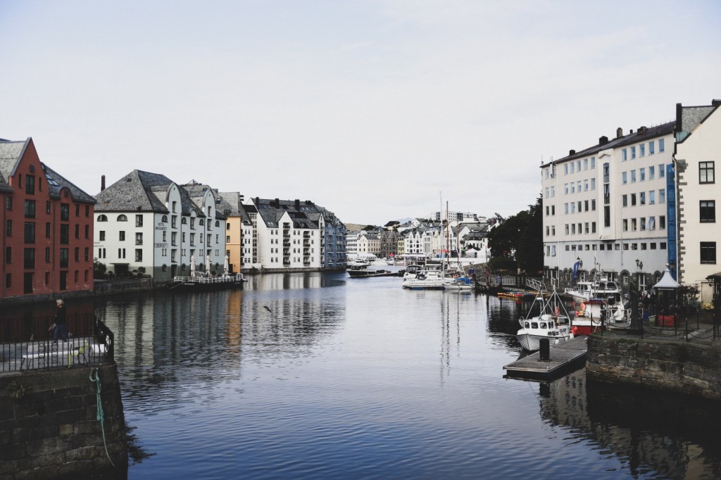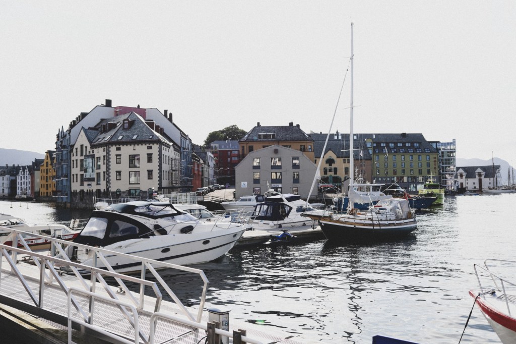 Desi mersesem deja de nu-mai-stim-cate-ori cu feribotul, inca ni se parea fascinant ori de cate ori ne urcam pe unul. In drum spre Alesund am luat feribotul din Folkestad catre Volda si ne uitam cu cata usurinta si normalitatea foloseau oamenii acest mijloc de transport. Chiar si pietonii, la fel de usor ca cei care mergeau cu masina. Stiu ca ma surprinsese o mama cu caruciorul, care mergea in plimbare usor catre cealalta parte de uscat, de parca ar fi fost cel mai firesc lucru. Si sigur este firesc, doar ca pentru noi parea ceva desprins din alta lume. De fapt… Norvegia chiar este o alta lume, cel putin comparand-o cu Europa de Est. Inca un feribot de la Festoya la Solavagen si intr-un final am ajuns in Alesund. Am cautat o parcare cat mai aproape de centru, insa apoi ne-am hotarat la parcarea aceasta din port, la vreo 20 de minute de mers pe jos de centru. Parea o simpla parcare insa in final ne-a placut foarte mult locatia. Am parcat chiar pe malul apei si aveam toate facilitatile necesare (curent, apa, toalete si dusuri), ca intr-un camping. Am lasat masinile si ne-am dus catre centrul orasului Alesund.