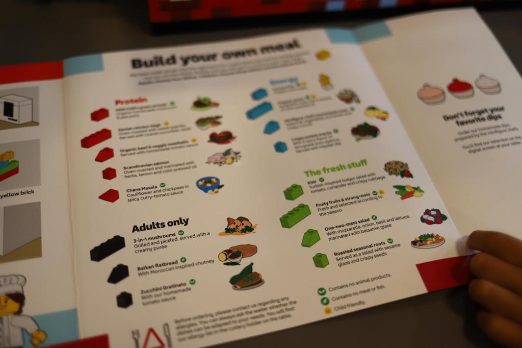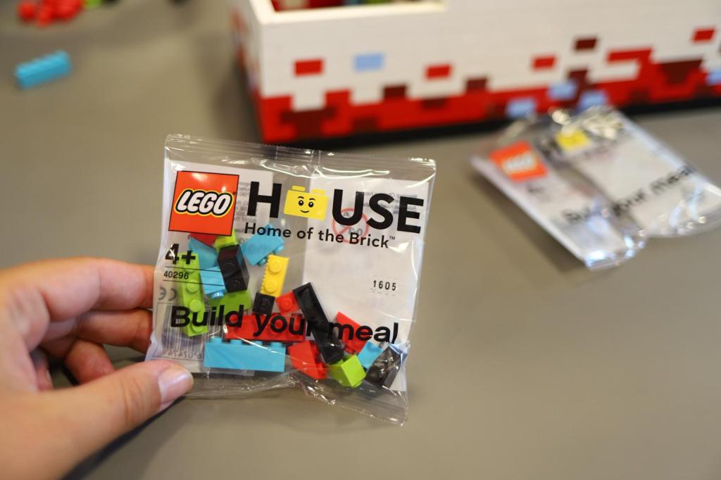 Insa highlight-ul vizitei noastre la LEGO House mi s-a parut restaurantul Mini Chef! Initial nu voiam sa mergem, ni se parea ca ar putea fi o experienta supraestimata/supraevaluata. Insa ulterior ne-am gandit ca s-ar putea sa regretam daca nu incercam. Si chiar imi pare tare bine ca am mers! E foarte interesanta toata experienta, de cand te asezi la masa si esti intampinat de un angajat al restaurantului, care iti explica cum functioneaza sistemul de comandat si ridicat comanda. Primesti un set de piese LEGO, o placa LEGO care va fi folosita pentru comanda de mancare si un meniu in care fiecare fel de mancare are asociata o piesa LEGO. Spre exemplu, daca vrei sa comanzi somon, asezi pe placa piesa rosie 1×2. Daca vrei sa adaugi salata de rosii, pui pe placa piese trapezoidala verde. Si tot asa, in functie de ce iti doresti sa comanzi. Pretul meniurilor este standard, (229 DKK/30eur pentru adulti, 135 DKK/18eur pentru copii) si poti alege un fel de proteina (carne/peste), un fel de carbohidrati (cartofi prajiti/paste/legume) si o salata. Meniurile de adulti au si cate un fel in plus de mancare (ciuperci, o paine marocana sau zucchini gratinat). Pentru a da comanda trebuie sa bagi placa in computerul de la fiecare masa, sa o verifici si apoi sa o trimiti la bucatarie. In tot timpul de asteptare, ne-am jucat cu piese LEGO (piese simple, rosii, 2×4), aflate in spatele mesei (puteam alege oricateee). Cand a fost gata comanda, am fost anuntati de figurine LEGO pe ecranul computerului de la masa, apoi am mers sa ne ridicam singuri comanda de la roboteii LEGO care ne ofereau cutiile de mancare. Acestea coborau pe un traseu, de suuus din tavan si ne erau inmanate de simpaticii roboti. Mancarea era pusa in cutii LEGO, cu capace LEGO, exact cum sunt cutiile de depozitare LEGO. Genial a fost 🙂