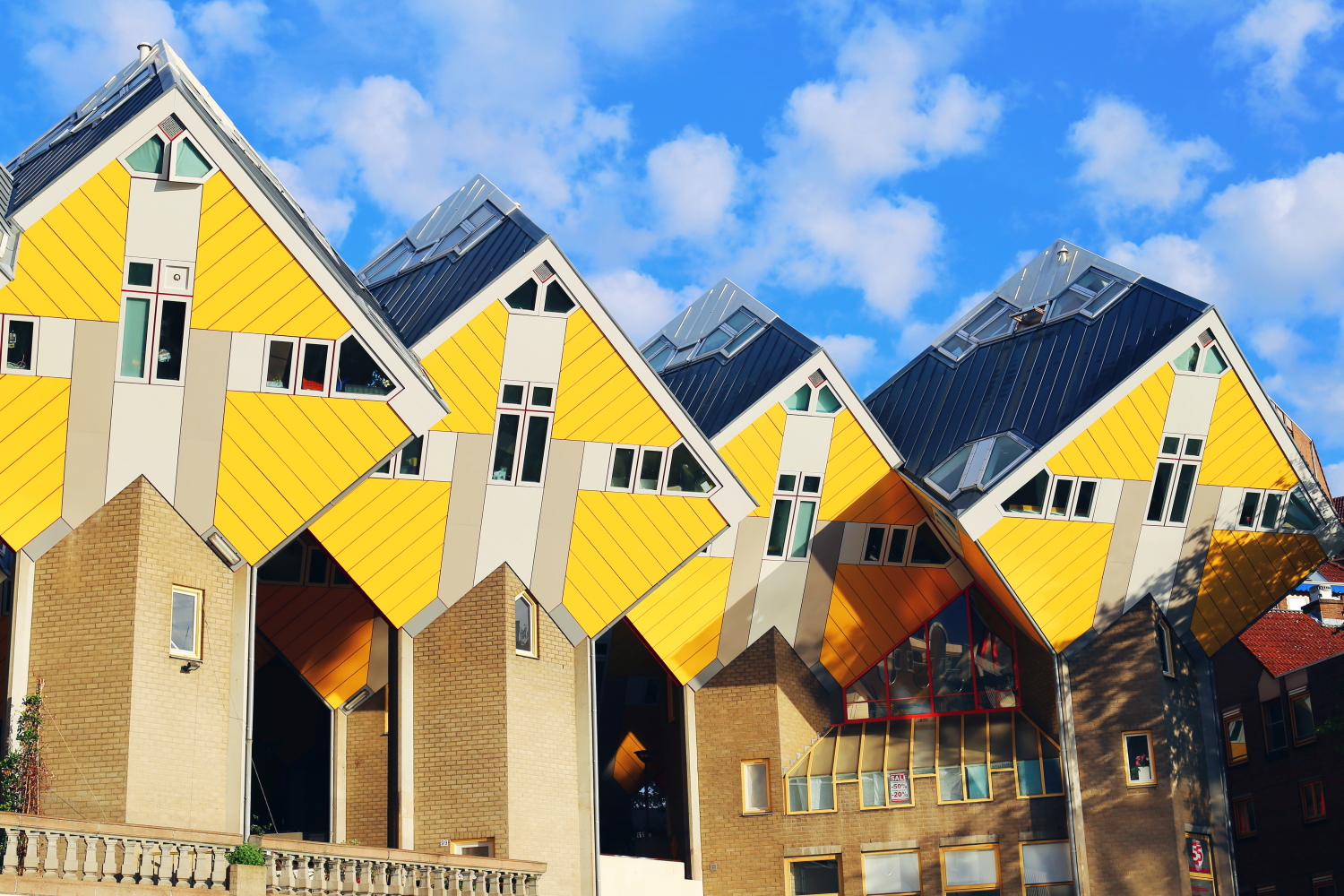 EN: For example, the Cube House. Cube shaped houses we might have seen before in our lives, but inclining the cube at 45 degrees and than thrown on a pillar over aΒ walk way… not that often π And the idea itself is genius, each house wants to simulate a tree (the pillar is the block of the tree and the house its branches), and all the houses symbolize a forest. Can someone argue with the fact that the Dutch people are eco? π But between you and me, the grey rooftops with the white peak remind us of the classic image of Mount Fuji, but hey, we’ll not call in question the artist’s vision π The only problem of the houses is the fact that even though they have a lot of space and they are built on three levels, not even a quarter of the space can be used. And if you suffer from claustrophobia, that’s quite sad π But just for the sake of the experience itself we would book a house on booking.com right away! Or why not, we can just visit the Kijk-Kubus (Show Cube), a prototype house made for the curious ones. In addition, next to the cube houses complex there is the Pencil Building, another mad construction. The Rotterdammers Β have quite an obsession with the modern architecture, and hey, it might not be typical Dutch, but it is truly impressive!Β