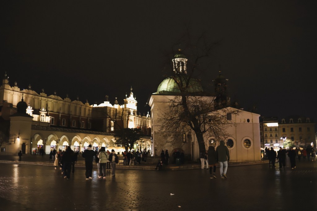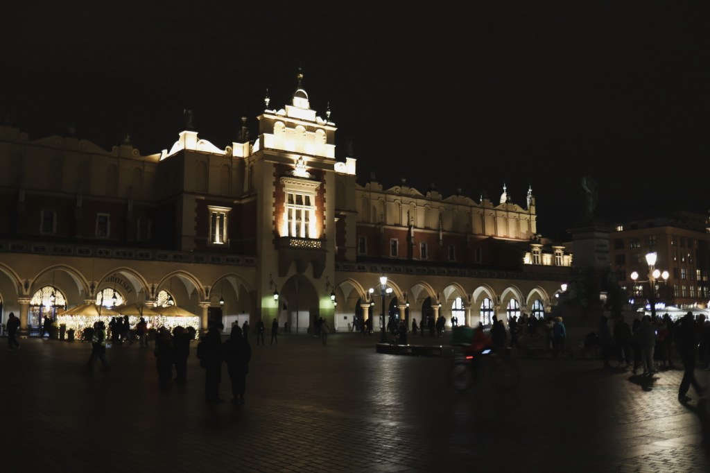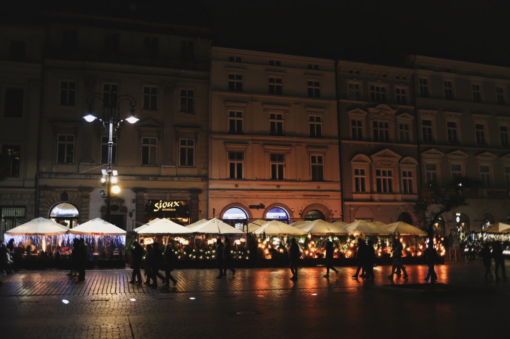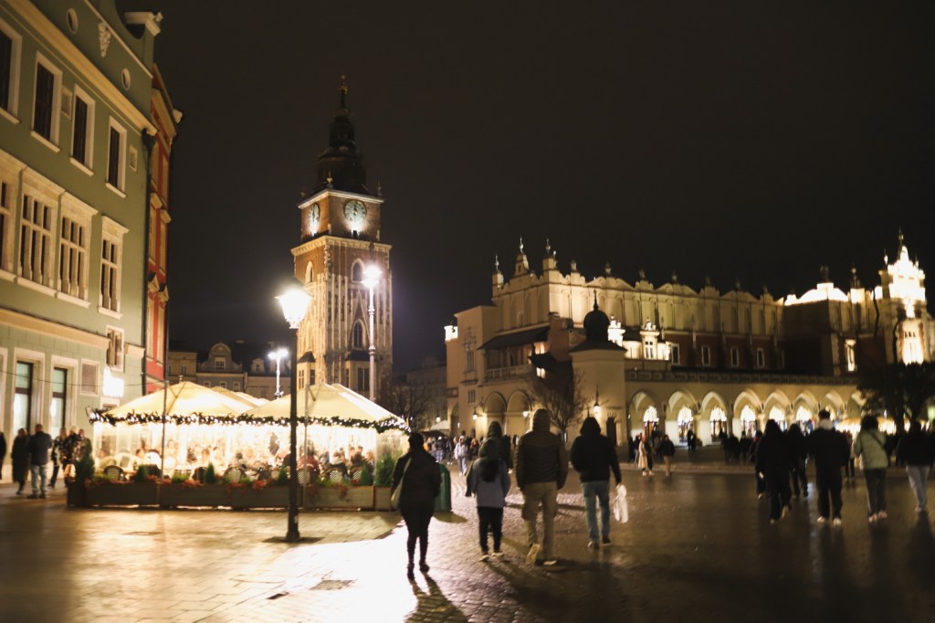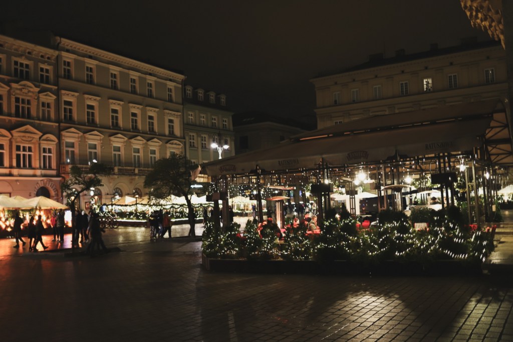 Insa revenind la frumoasa piata centrala din Cracovia, restaurantele aveau terasele deschise (acoperite si incalzite), decorate si complet pline de oameni! Ce inseamna viata de seara/noapte dintr-o tara est europeana, cand centrul unui oras parca invie, in loc sa amorteasca si sa se pregateasca de somn 🙂 In comparatie cu vara petrecuta in Danemarca, cand seara nu mai era tipenie de om in centrul oraselor, in Cracovia parca era carnaval! Oameni peste tot, agitatie, muzica, forfota, multi turisti. Era ca o zi de sarbatoare. Erau pregatite si casutele pentru targul de Craciun ce urma sa se deschida weekendul urmator (nu l-am prins din pacate).