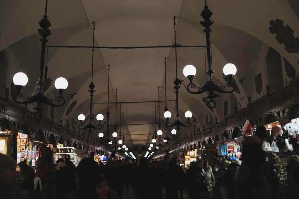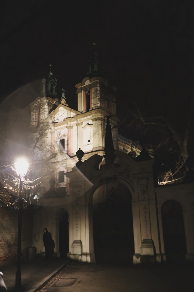 Am luat-o la pas catre Jatka 2.0 Food Hall, o cladire istorica rotunda in mijlocul pietei Plac Nowy, in cartierul evreiesc Kazimierz, care acum serveste ca loc pentru mai multe restaurante. Foarte interesanta ni s-a parut si cladirea, si atmosfera din acel loc. O mare de oameni (predominant foarte tineri) adunati acolo sa manance mancare stradala, indeosebi niste sendvisuri uriase, din baghete lungi de paine, fara capac (am aflat ulterior ca sunt o mancare foarte populara, poarta numele zapiekanka). Fiecare ferastruica a cladirii avea cate un restaurant de mancare rapida (eram deja mancati si nu am testat nimic, dar pareau atat de apetisante!) si era asa o forfota in zona aceea, ne simteam de parca aveam sa mergem in club imediat dupa 🙂 Tinerii din jurul nostru sigur aveau sa faca asta, noi insa ne simteam deja prea obositi. Incepuse sa ninga destul de tare asa ca am luat-o usor, usor spre hotel. Pe un drum de nici douazeci de minute pe jos am dat de trei bazilici/biserici mari si in fiecare dintre ele erau oameni inauntru, rugandu-se. Constructiile erau superbe, imense, inalte, cu interioare spectaculoase.