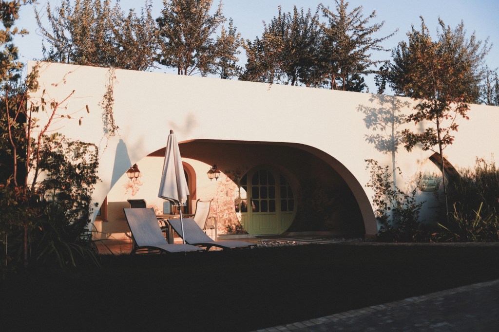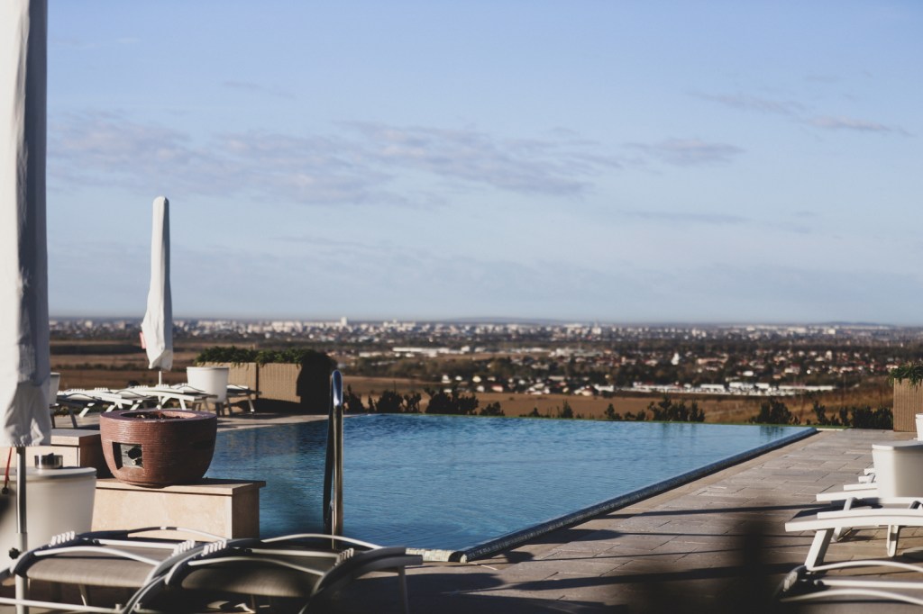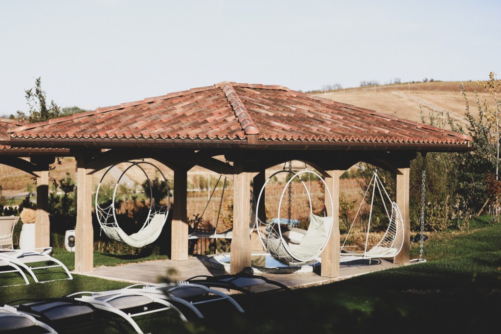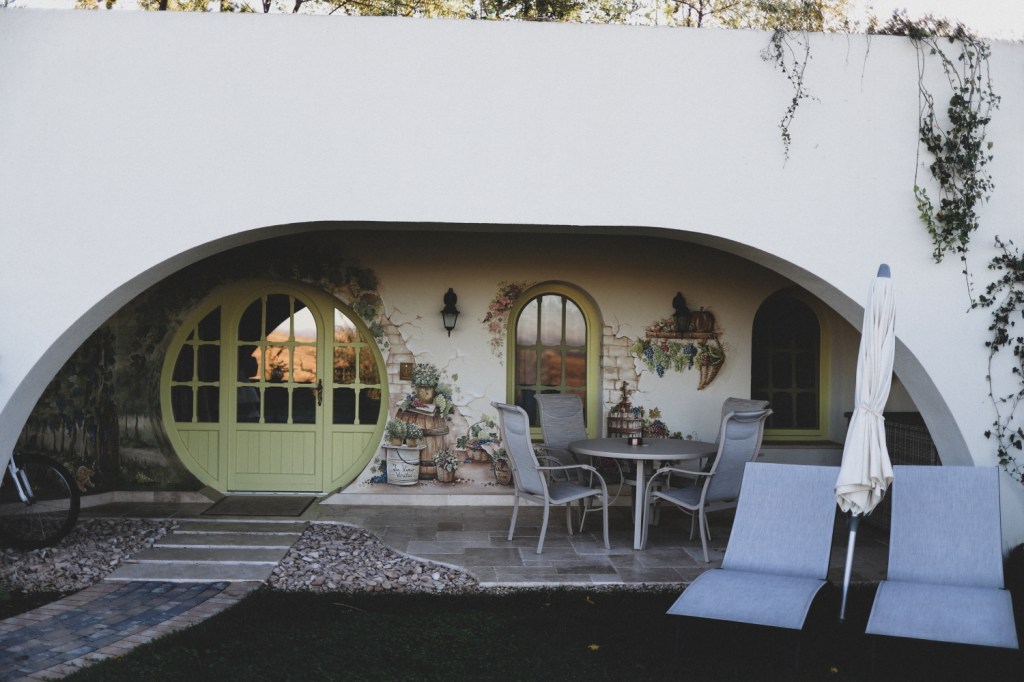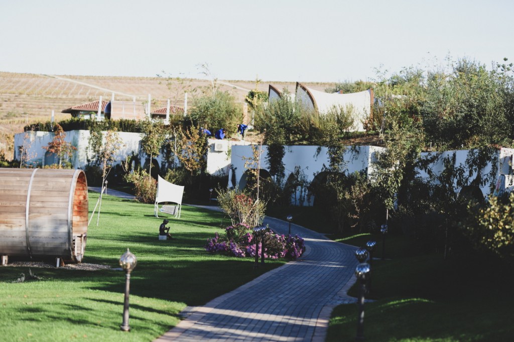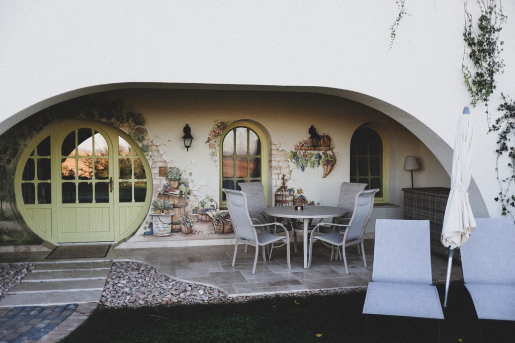 Cel mai probabil, bungalou-urile acestea cu usi rotunde si culori pastelate sunt cel mai emblematic punct al Casei Timis (asta desi “piesa” centrala a fost si zicem noi ca inca este, cladirea conacului). “Casute sub pamant” in mijlocul viilor (locatia se afla aproape de Drumul Vinului, pe un domeniu foarte mare, cu podgorii intregi de Sauvignon Blanc si Merlot), printre alei pavate, lacuri si multa verdeata. Fiecare bungalou poarta numele unor varietati de struguri (casuta noastra purta numele de Muscat Ottonel), internationale (Pinot Noir, Cabernet Franc, Sauvignon Blanc, Riesling, Shiraz, Chardonnay, Cabernet Saugvinon, Merlot, Aligote) dar si romanesti sau moldovenesti (Feteasca Alba, Feteasca Regala, Feteasca Neagra, Tamaioasa Romaneasca, Cramposie sau Francuta). Daaa, atat de multe sunt si din cate am inteles, exista planuri de extindere. Cele actuale sunt pe doua nivele iar noi am stat la cel de-al doilea nivel. Unde exista o zona de spatiu verde mai mare fata de cele de la primul etaj (este practic acoperisul caselor de la primul nivel, acoperit cu pamant si verdeata) si de unde se vede o priveliste superba peste colinele din jur. Si un apus minunat! Tot in zona aceasta de bungalouri se afla si piscina exterioara, si o zona de relaxare cu jacuzzi, si zona de spa. Fiecare bungalow are de fapt doua camere (cu exceptia suitelor) care pot fi interconectate, in cazul familiilor si sunt decorate intr-un mod foarte… gingas 🙂 Picturi pe pereti, picturi manuale pe diverse decoratiuni, culori pastelate si lemn sculptat. Ne scoate putin din rutina trendului actual, de design minimalist, scandinav, vazut la mai toate cazarile noi aparute in ultima vreme in Romania. Nu ca nu ne-ar placea designul scandinav (dimpotriva), insa decorurile de la Casa Timis sunt din alta poveste si ne-a prins tare bine schimbarea aceasta de stil. Chiar par ca scoase dintr-o poveste sau dintr-un decor de film. Sigur cei de pe platourile de filmare de la Hobbiton ar fi nespus de incantati de toate dragalaseniile si detaliile de aici 🙂